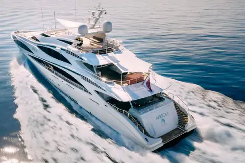 Step aboard AFRICA I and into the wilds of adventure. Her sleek exterior lines are matched by a rapid top speed of 24.2 knots for high octane fun on the water. With comfort at the fore, stabilisers mitigate roll when at anchor and underway, guaranteeing a comfortable and relaxing onboard experience. Inside, a fresh modern interior from the design boards of Francois Zuretti will please style aficionados, setting the scene for a charter to remember.