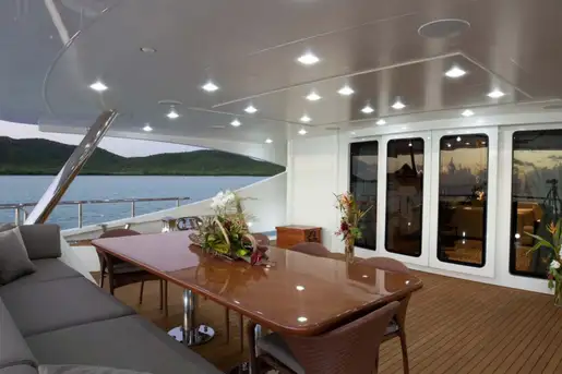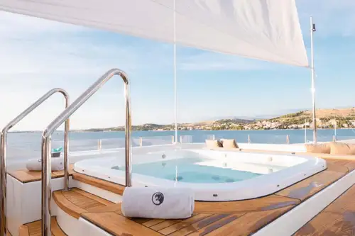 On the main deck, the full-beam master cabin features a private deck area, a rare luxury that allows guests to soak in ocean views in complete privacy. Five additional well-appointed cabins, including a VIP suite on the upper deck, sleep up to 12 guests in style and comfort. Wheelchair accessibility on the main deck ensures smooth navigation throughout, welcoming guests of all ages and needs.