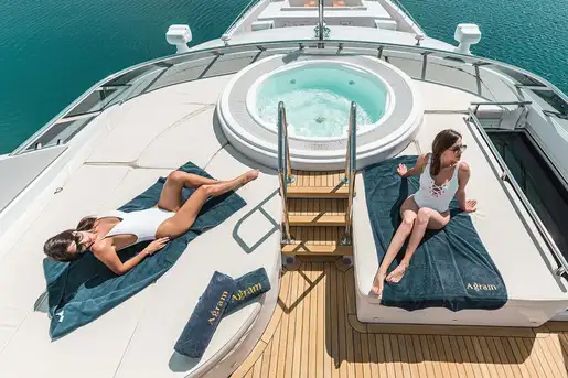 Stand-out features include a very spacious sun deck for a high-performance yacht of this size, with a super-size jacuzzi pool up front in pride of place. With a sit-up bar and a huge, semicircle of sofas that can be split into two social spaces, it’s a fabulous place to spend a day at sea or relaxing in an anchorage. There’s also a large foredeck lounge with seats around a table and sunpads, so she offers ample space for sunbathing. She also carries an excellent array of watersports kit and toys.