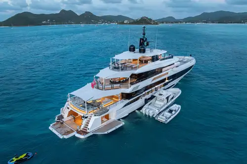 The beach club on DOKINHA is a true retreat, offering fold-out terraces on three sides that connect guests directly to the water. With teak wall panelling, built-in towel rails, and comfortable loose seating, this space is ideal for lounging, diving into water sports, or simply enjoying the close connection to the ocean. Zero-speed stabilisers guarantee a smooth and comfortable experience whether at anchor or cruising. A towed tender is also available to explore nearby destinations with ease.