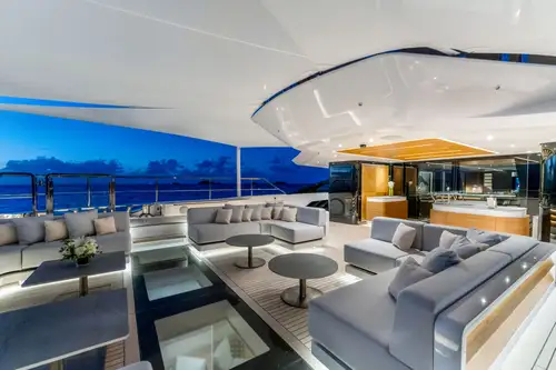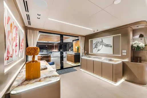 The yacht’s expansive interiors are bathed in natural light, with floor-to-ceiling windows providing stunning views. The seamless flow between indoor and outdoor spaces gives a feeling of openness throughout the yacht.