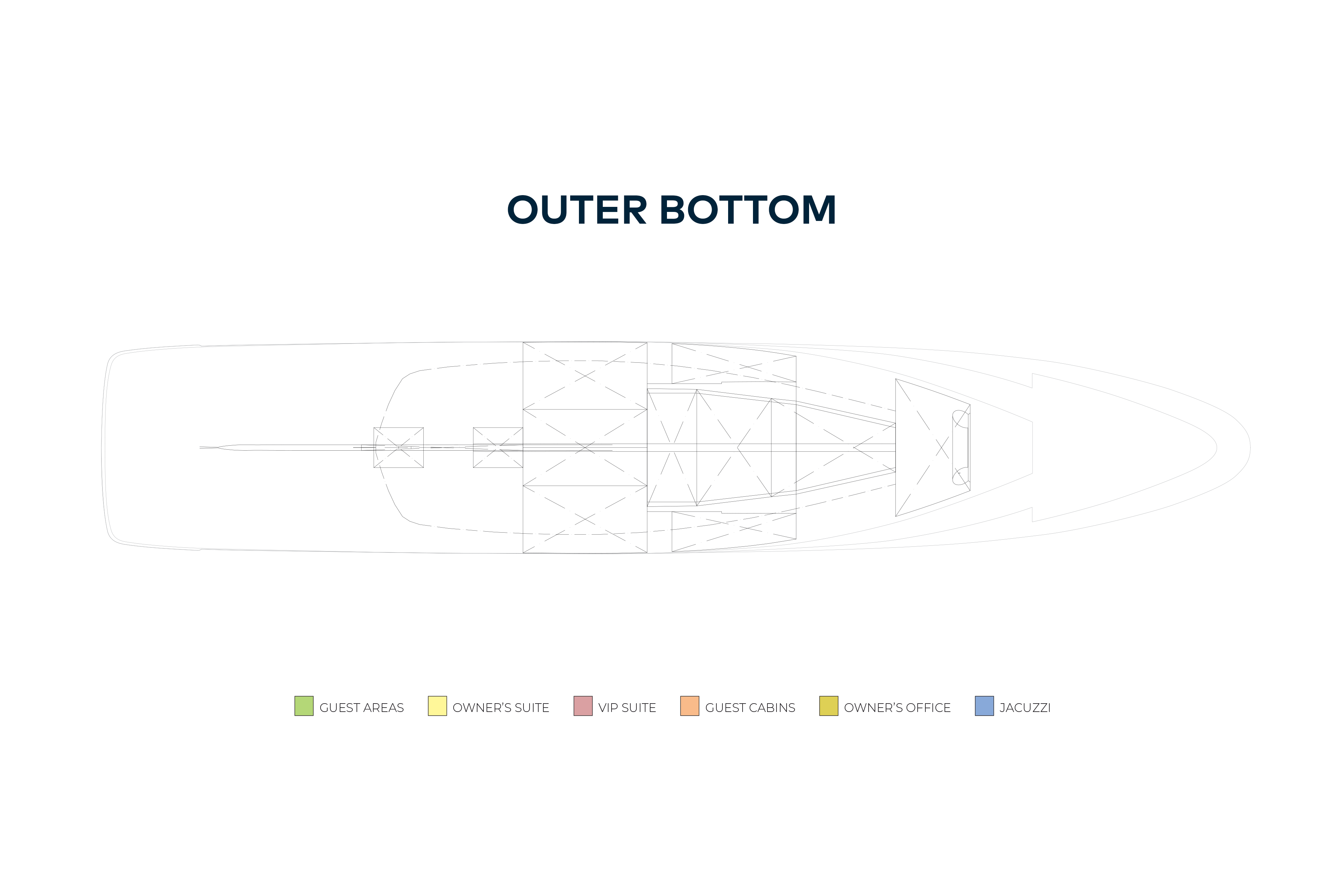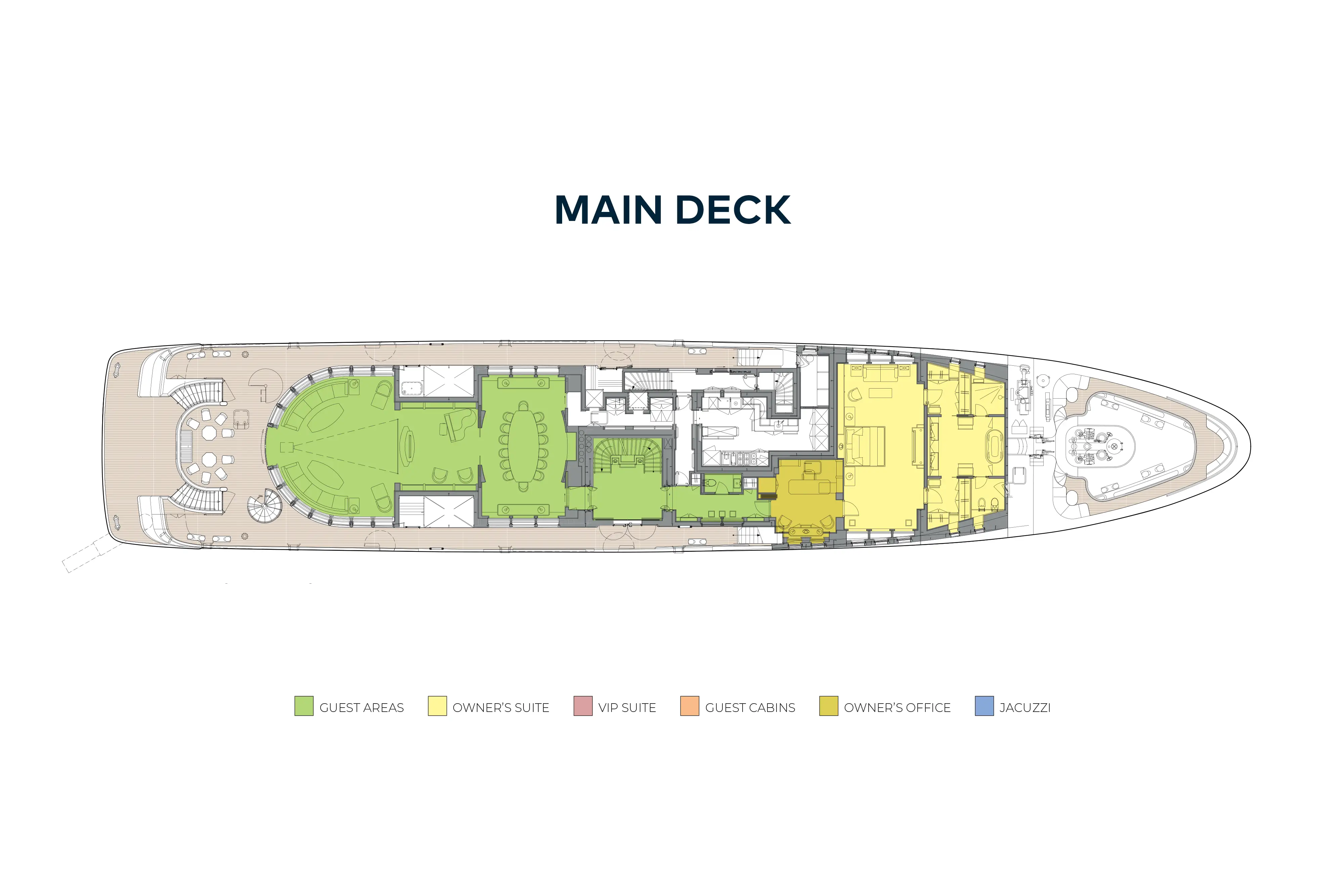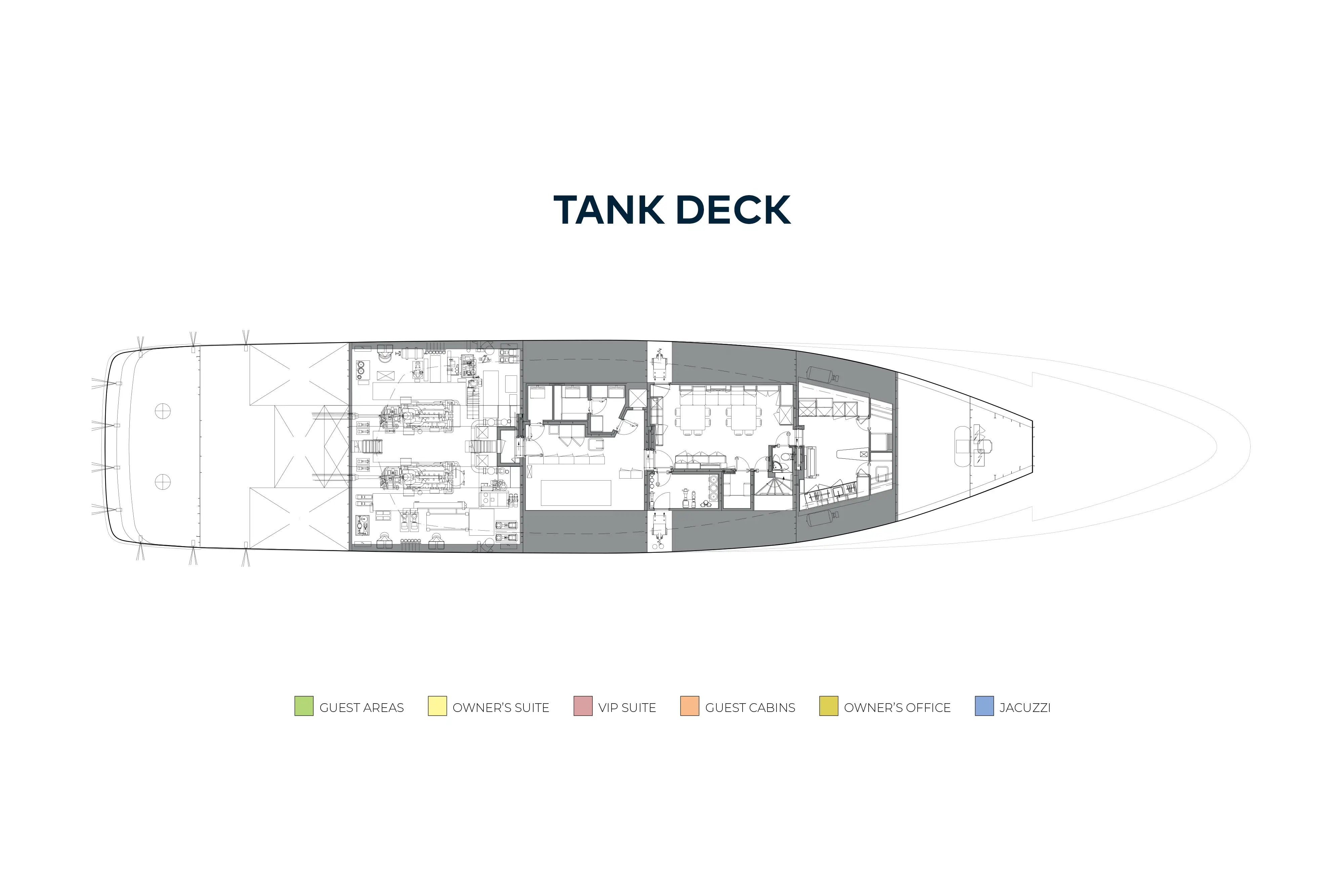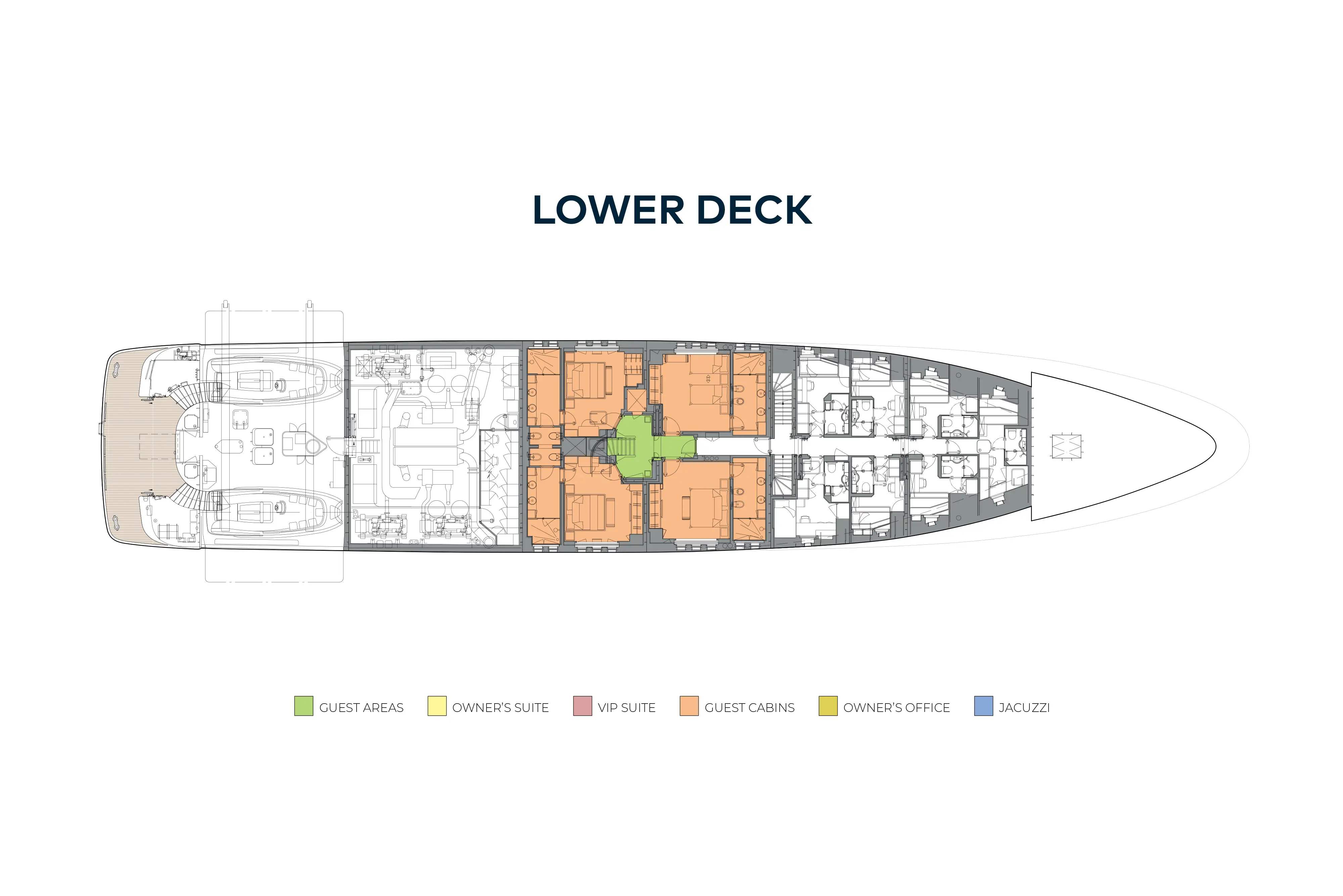 - Accommodation for twelve guests in six cabins including a full beam owner's suite, VIP suite and four double guest suites
