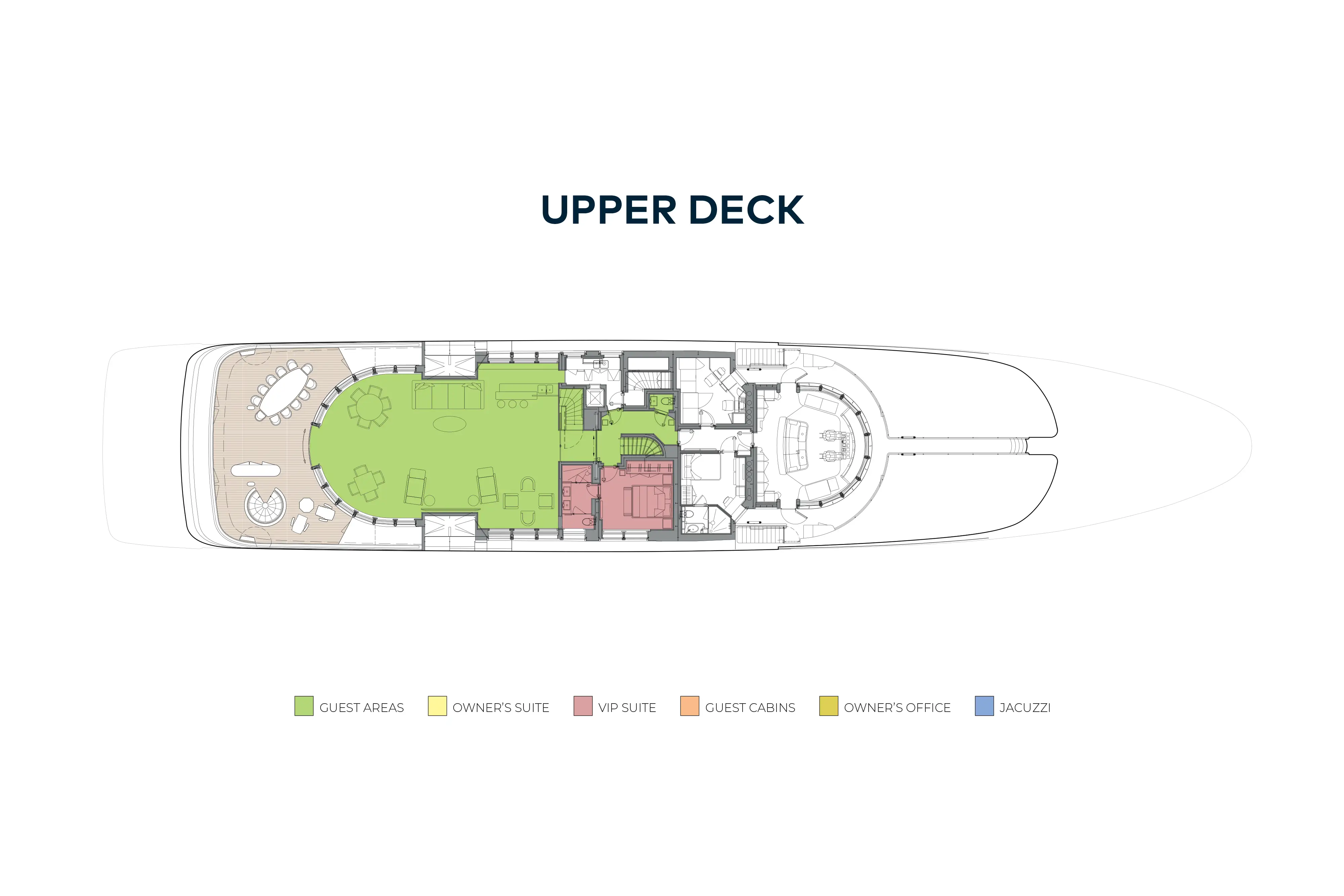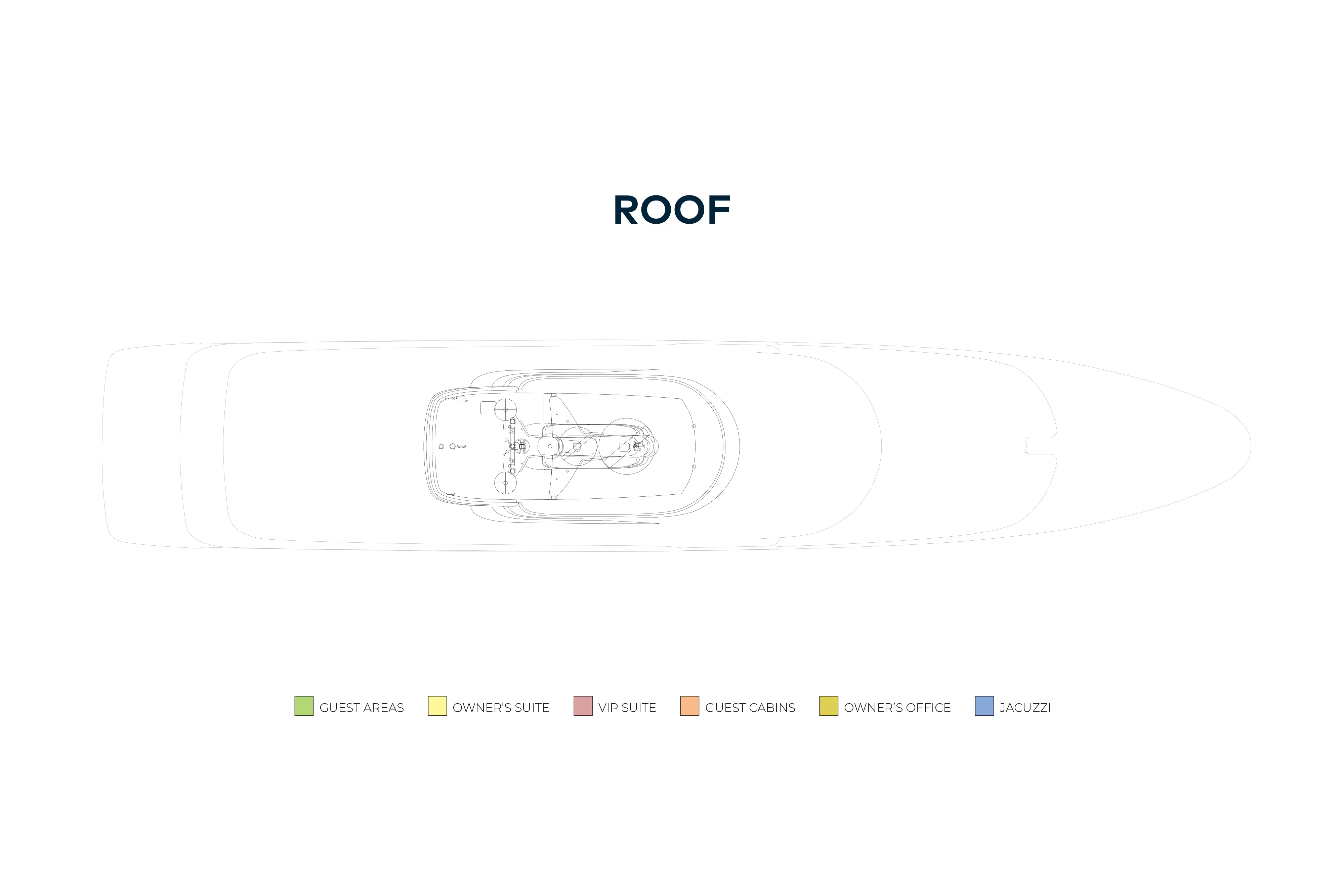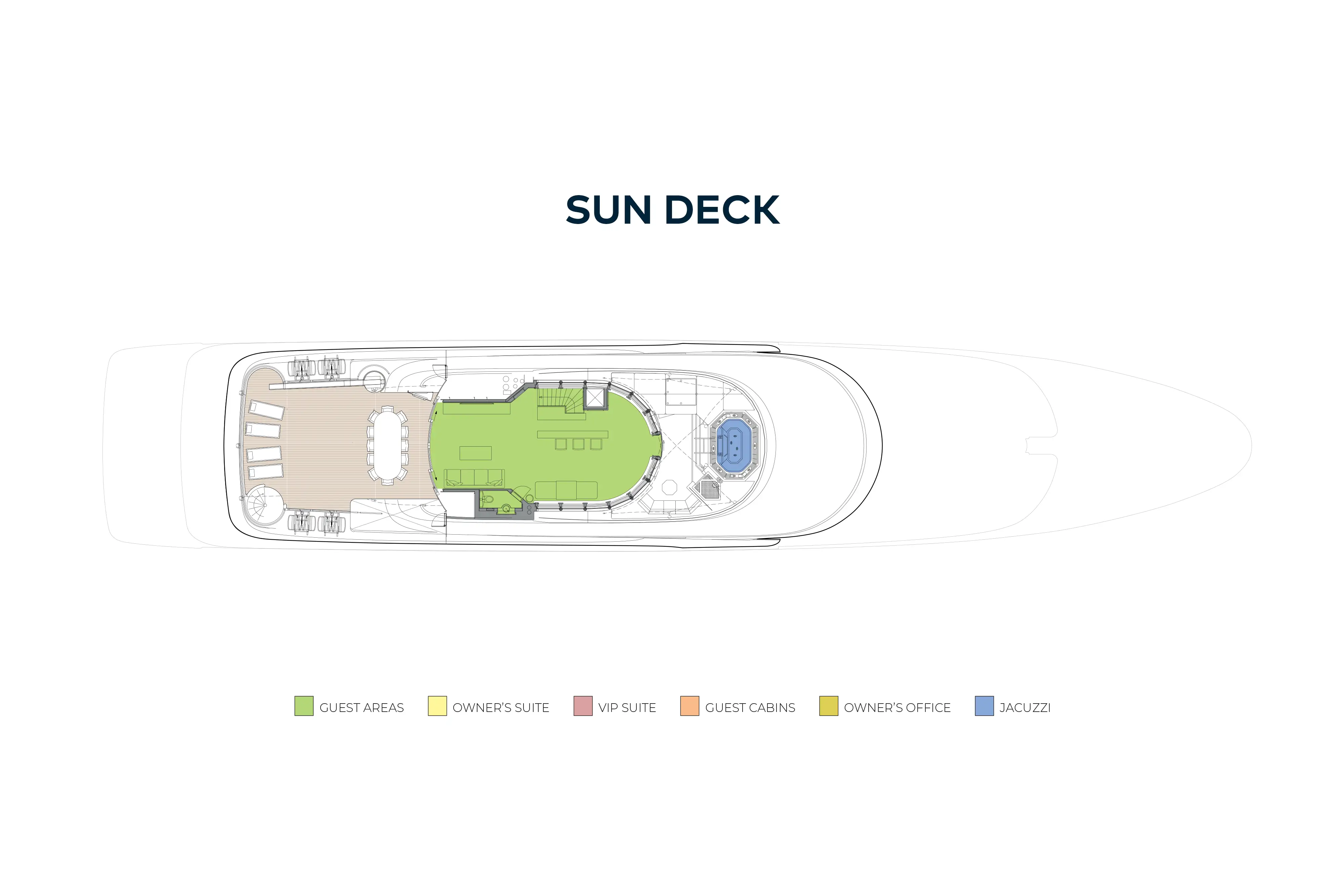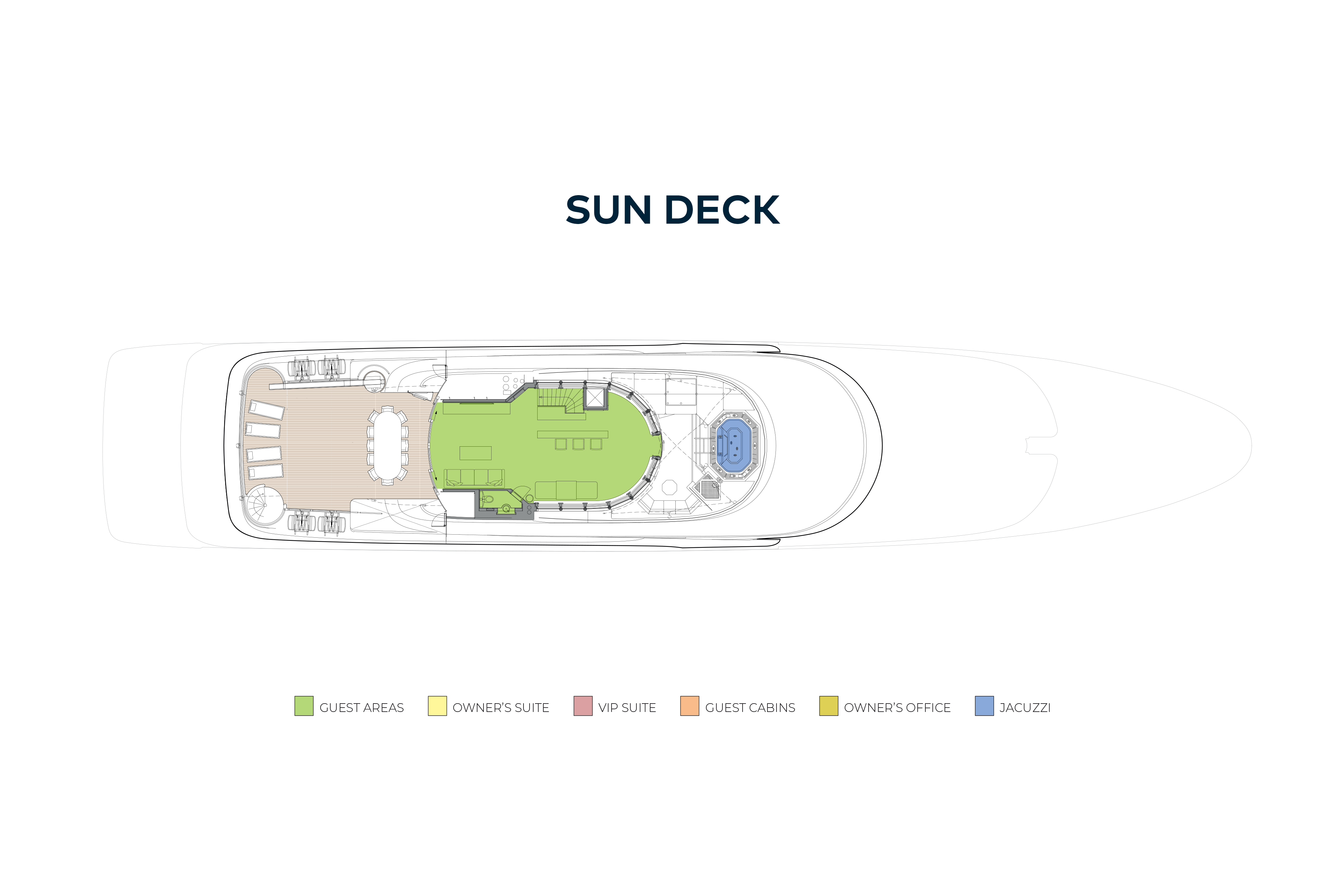 - Accommodation for twelve guests in six cabins including a full beam owner's suite, VIP suite and four double guest suites