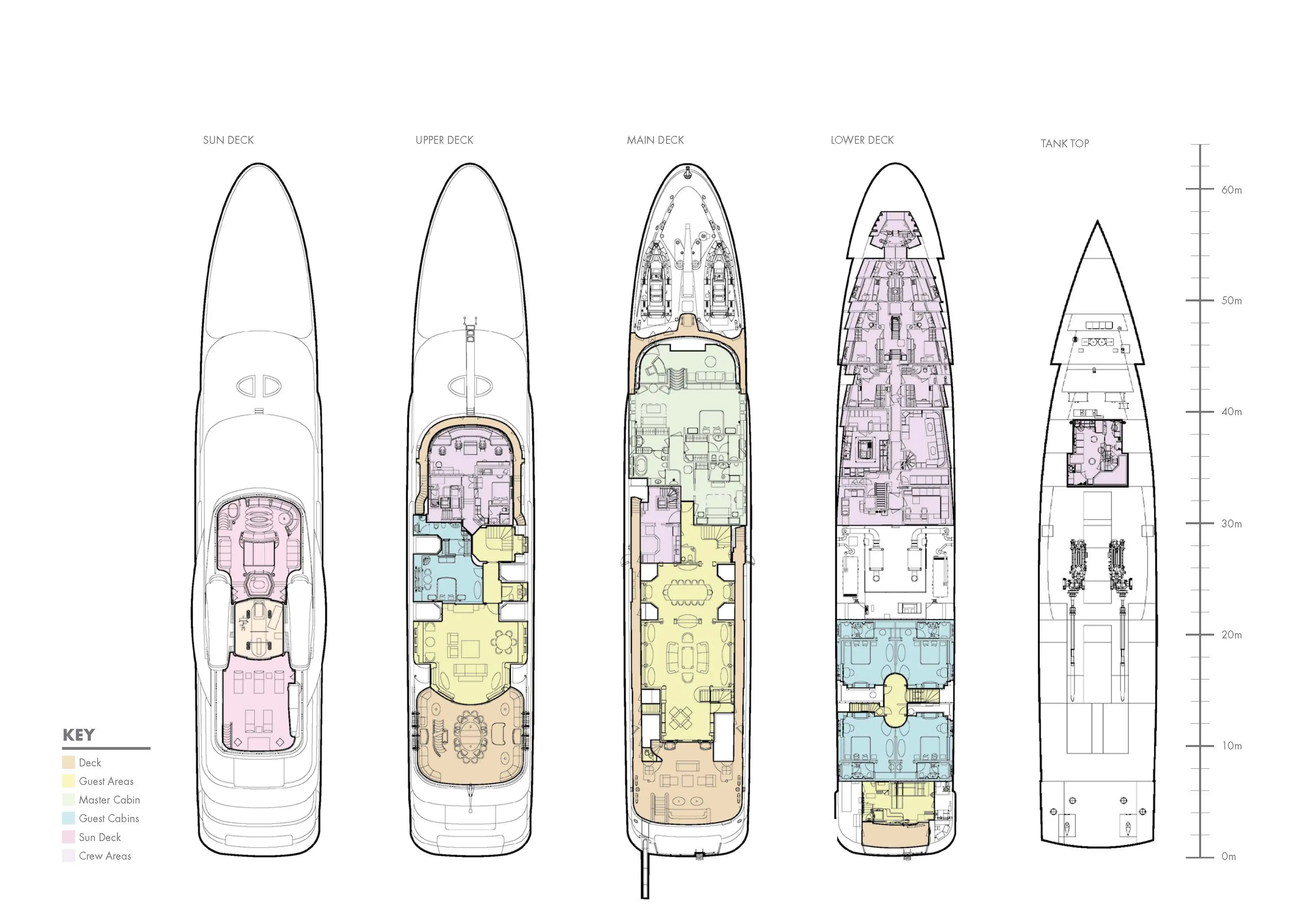 Her inside living spaces are best described as palatial, with interior design inspired by Greek mythology. The main and upper deck saloons are impressively elegant, classically opulent and finished to an exceptional standard.