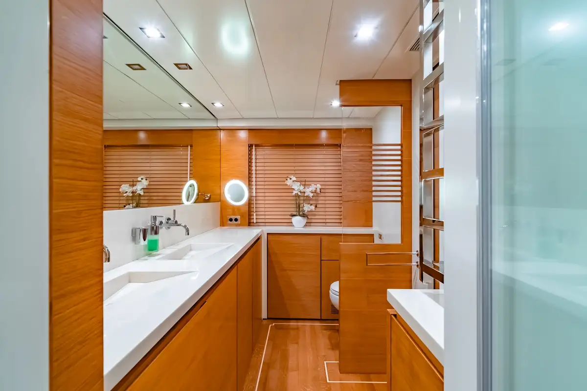 HUMMINGBIRD sleeps up to eight guests on the lower deck, accessible via steps forward of the dining area. The full beam owner's suite is bright with two large picture windows either side, seating to port, a vanity table to starboard and a his and hers bathroom en suite. There is a second double cabin forward a twin cabin and a single cabin with an additional berth. She also accommodates four crew.
