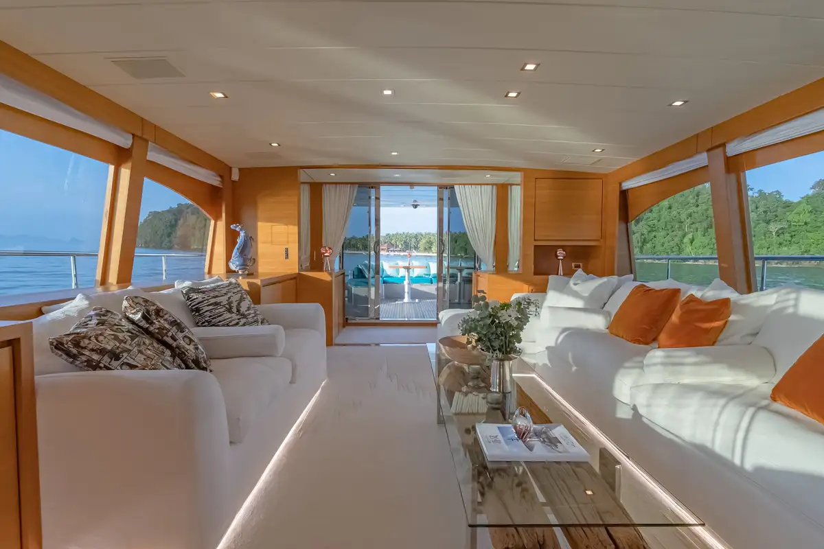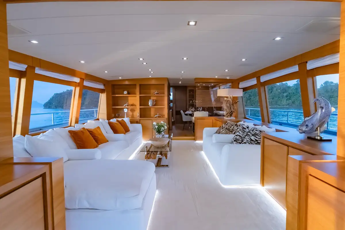 Large picture windows in the main saloon illuminate the light woods and cream leather L-shaped seating opposite a pop up TV behind another sofa opposite. Forward to starboard is a formal dining room with a folding tabletop to open up the space when not in use. The galley is to port and the bridge is forward.