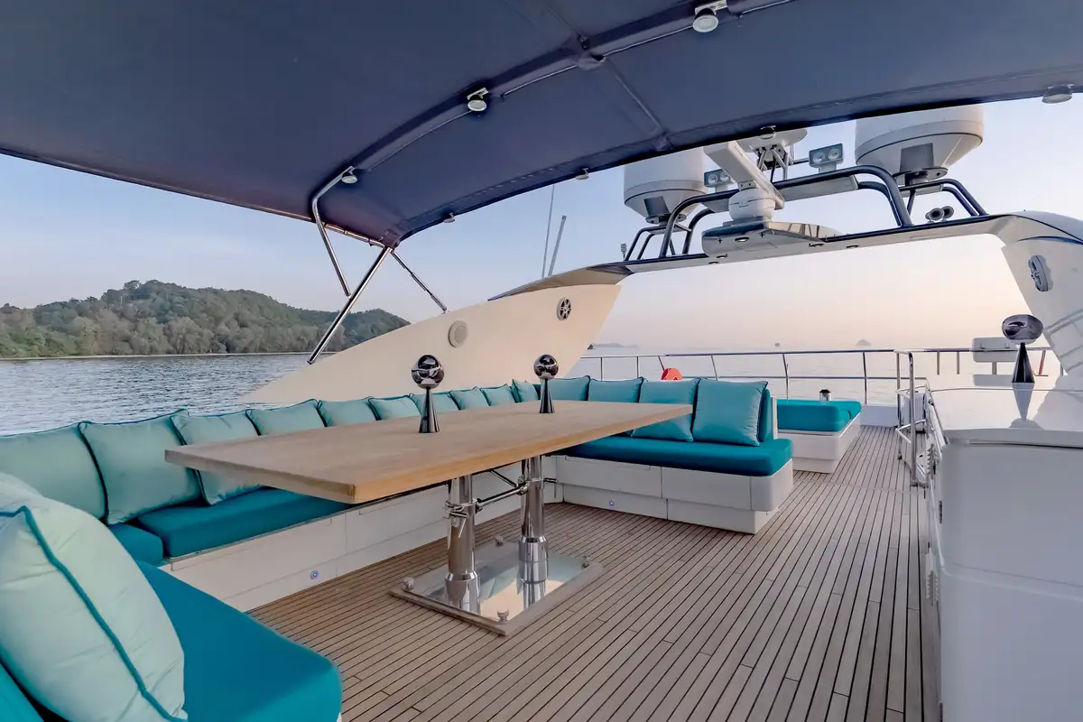 She has a generously sized flybridge with a large sunpad aft, an open air dining area beneath a removable awning, icemaker and BBQ with the helm position forward. There is an additional open air dining area on the main deck aft and steps to starboard lead down to the swim platform where the tender is stowed underway. Forward on the main deck are sunpads and a Portuguese bridge for snacks and sundowners.