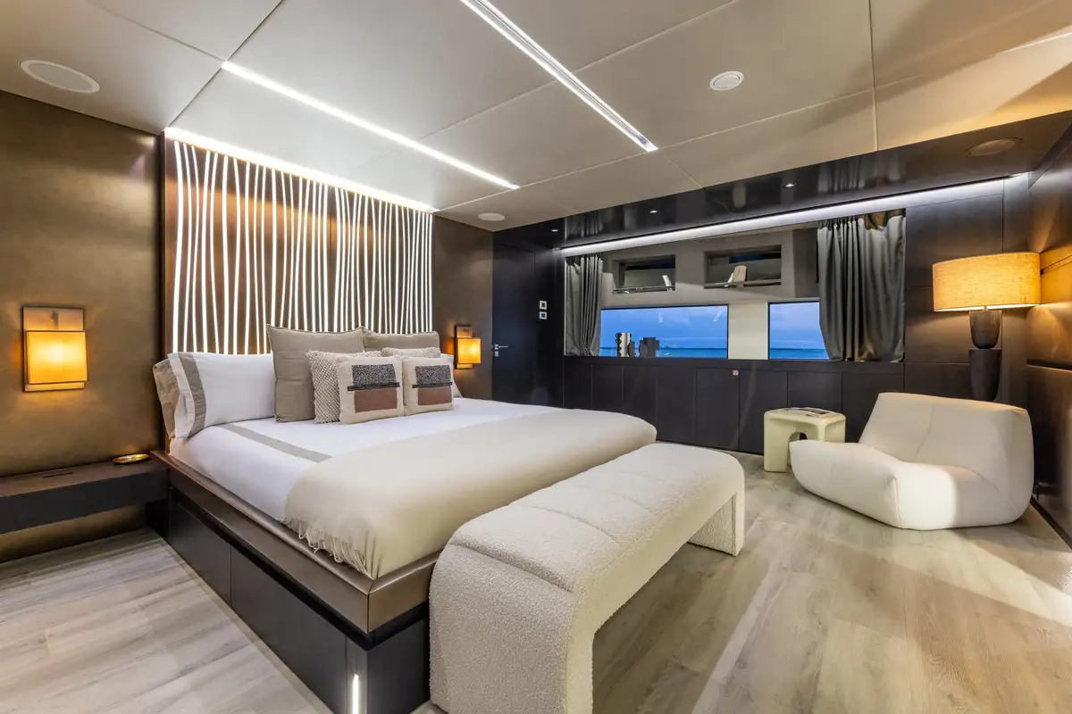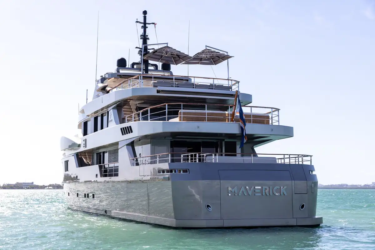 Accommodating up to 11 guests in five well-appointed cabins, MAVERICK features a full-beam master suite on the main deck, complete with a private office and a his-and-hers ensuite bathroom. On the lower deck, two spacious forward-facing VIP cabins sit alongside a double cabin and a twin cabin. The main deck includes a generous lounge and formal dining area, while the upper deck features a sky lounge ideal for entertainment.