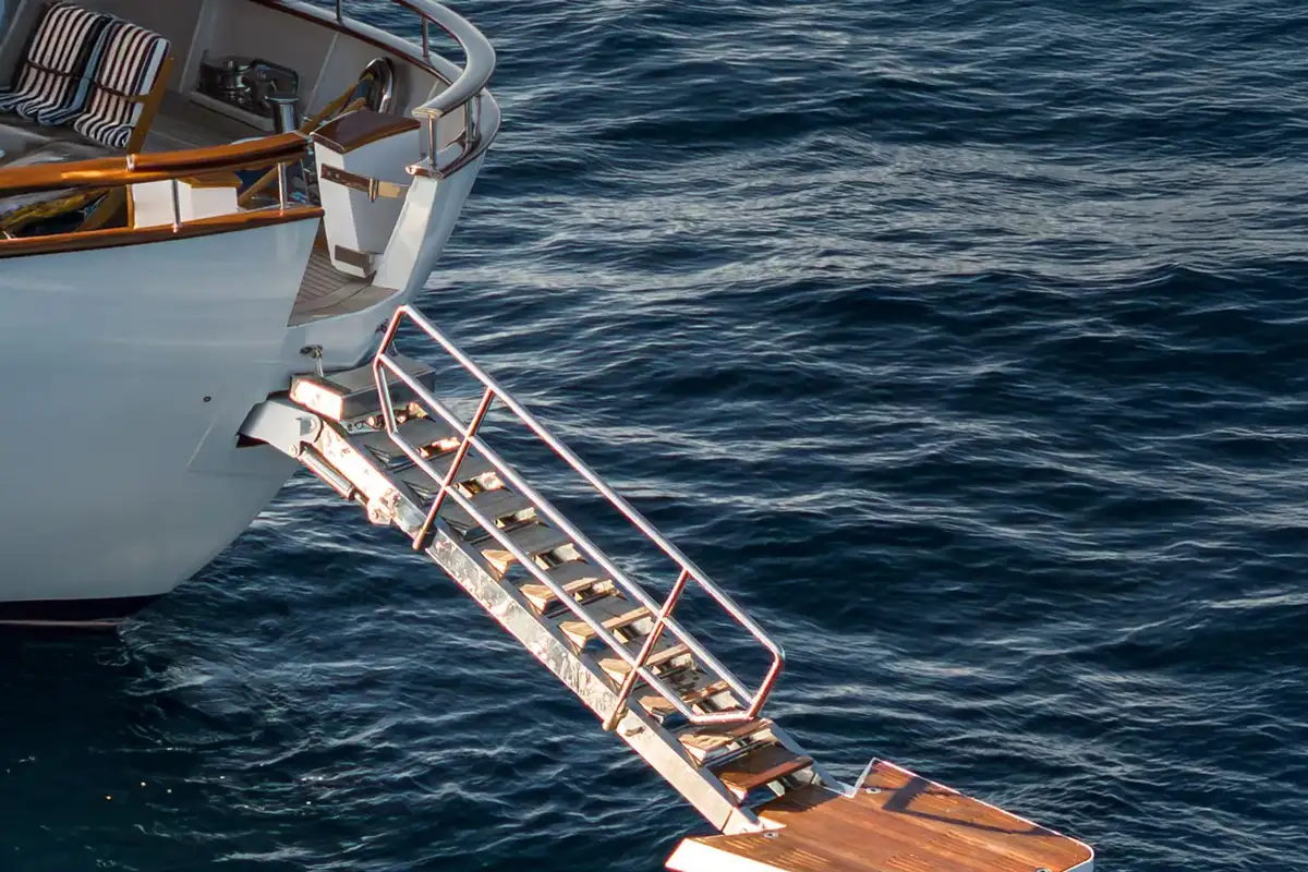Boarding is via hydraulic side gangways port and starboard, both with shell door swim platforms, and a hydraulic passerelle port aft.