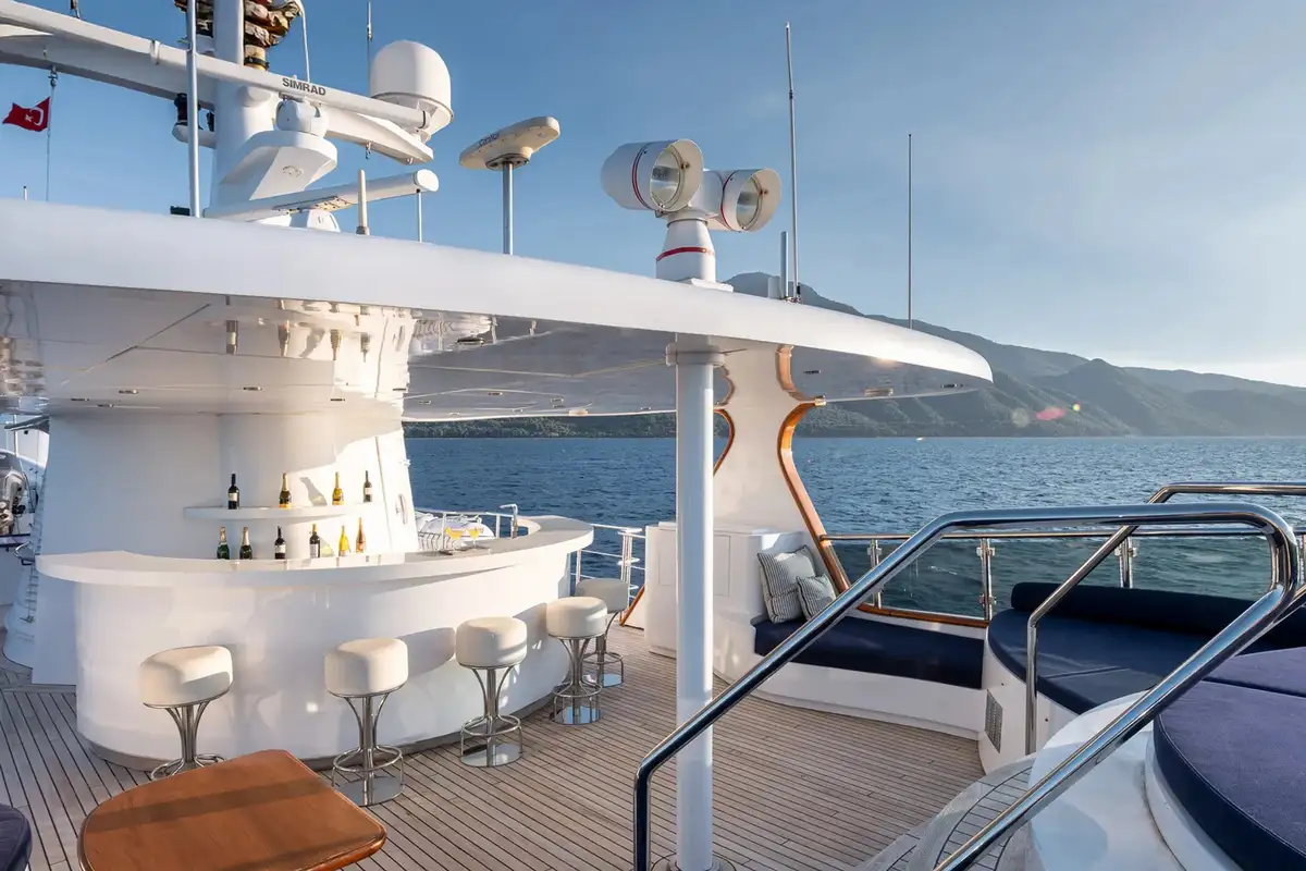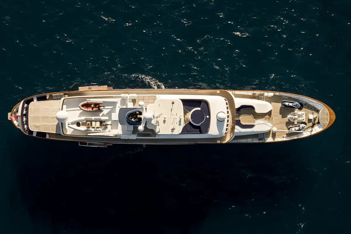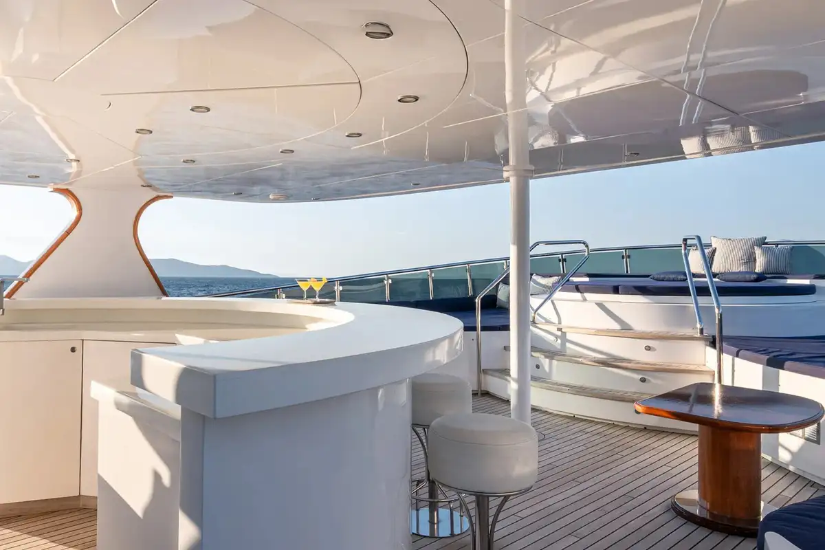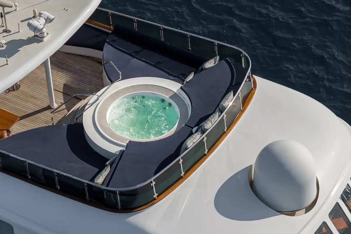 A large sun deck has a raised jacuzzi forward surrounded by sunpads and a semi-circular sit-up wet bar beneath the hardtop forward of the funnel. Aft of the funnel there is a boat deck with two tenders, 6.5m (21.3ft) and 6.1m (20ft), and a range of toys launched by two deck cranes. With the tenders deployed, the boat deck presents a range of relaxation and entertainment options.