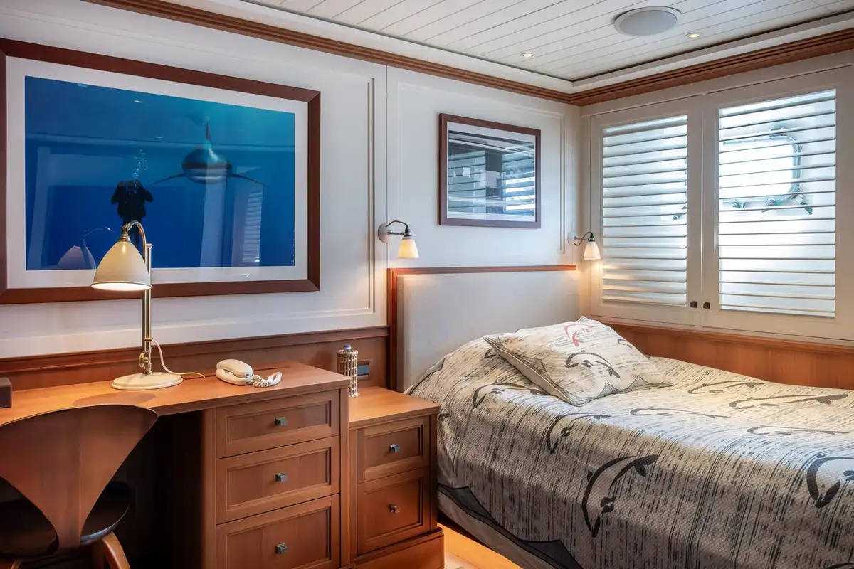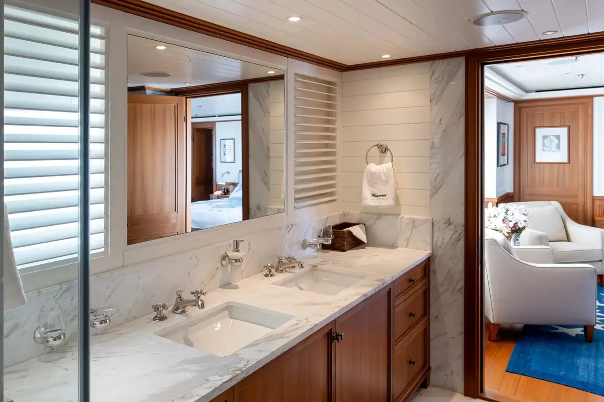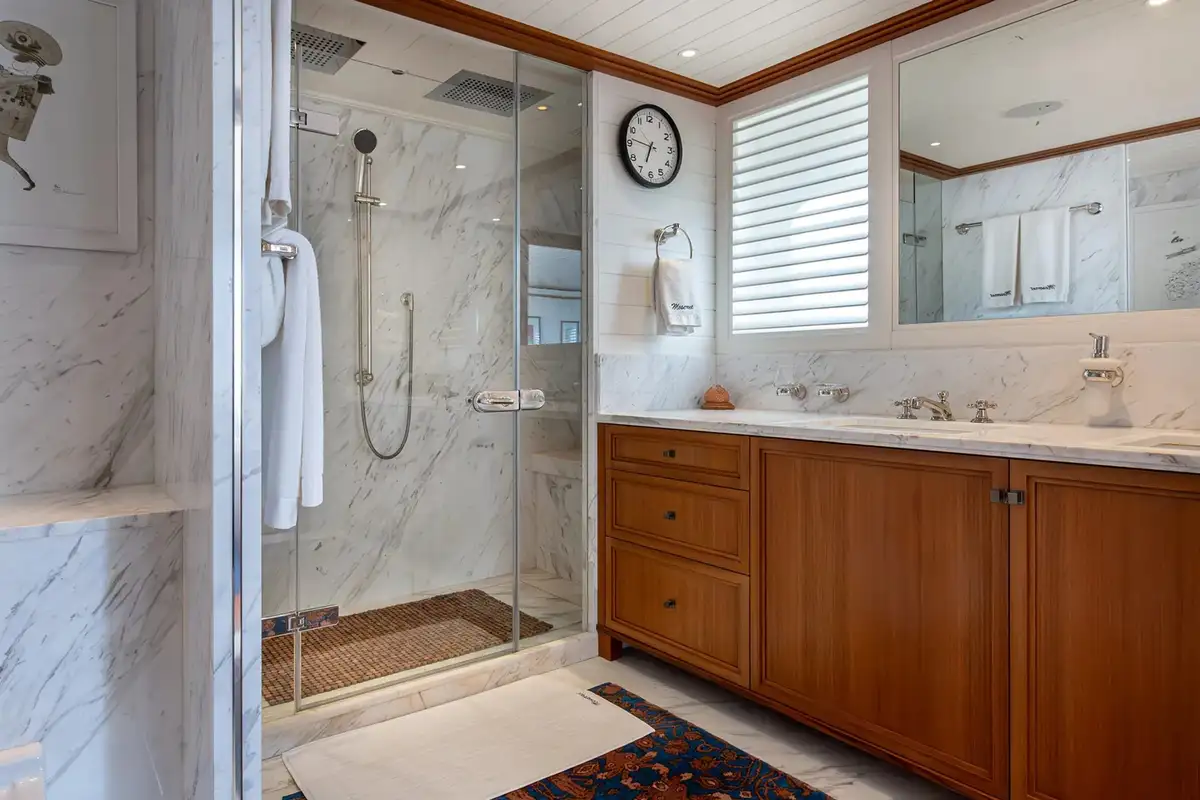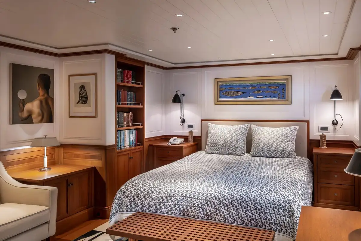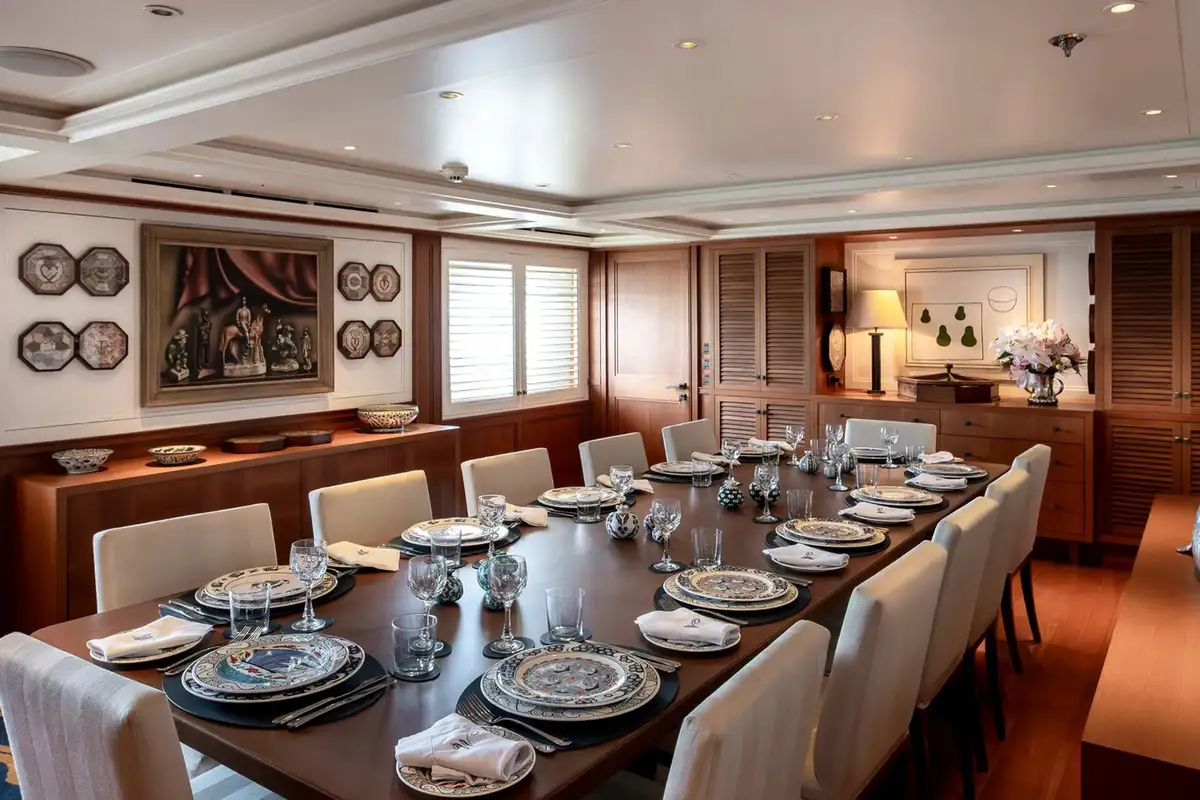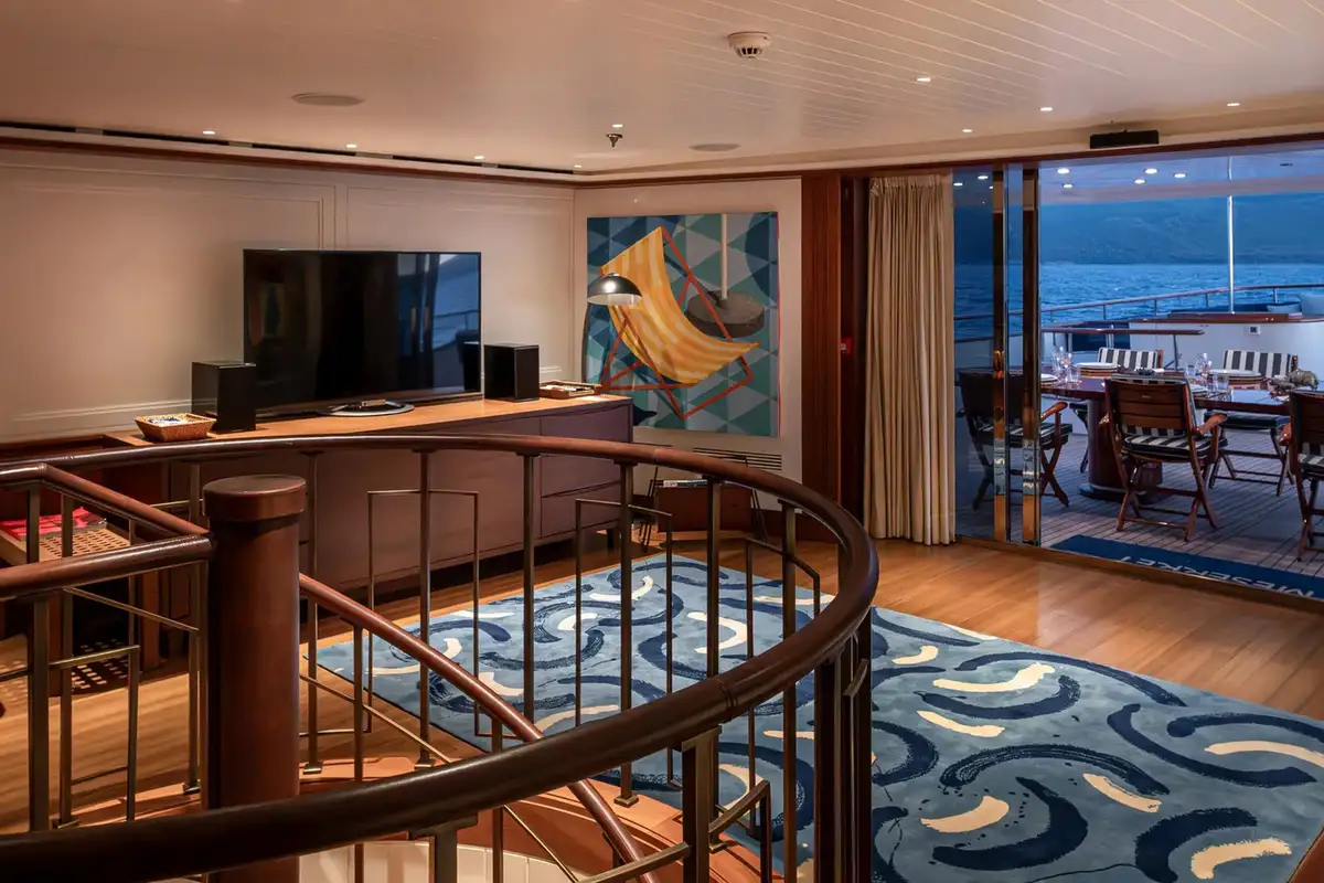 She welcomes up to 14 guests in eight cabins with two single cabins for secretaries or security staff. The owner’s suite, forward on the main deck, has access from the lobby and from the deck. It features a private office, bedroom, walk-in dressing room and a marble bathroom with a rain shower.