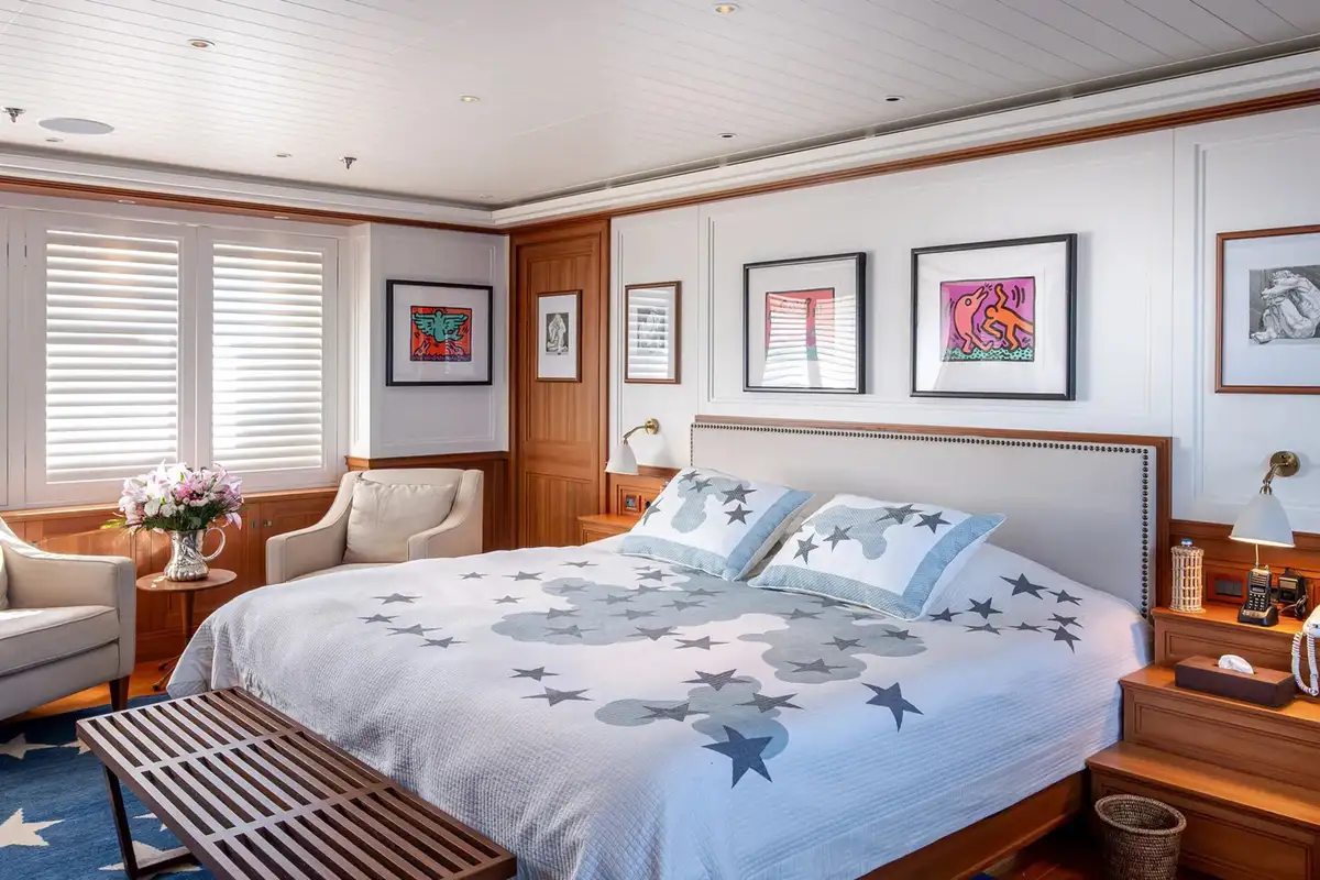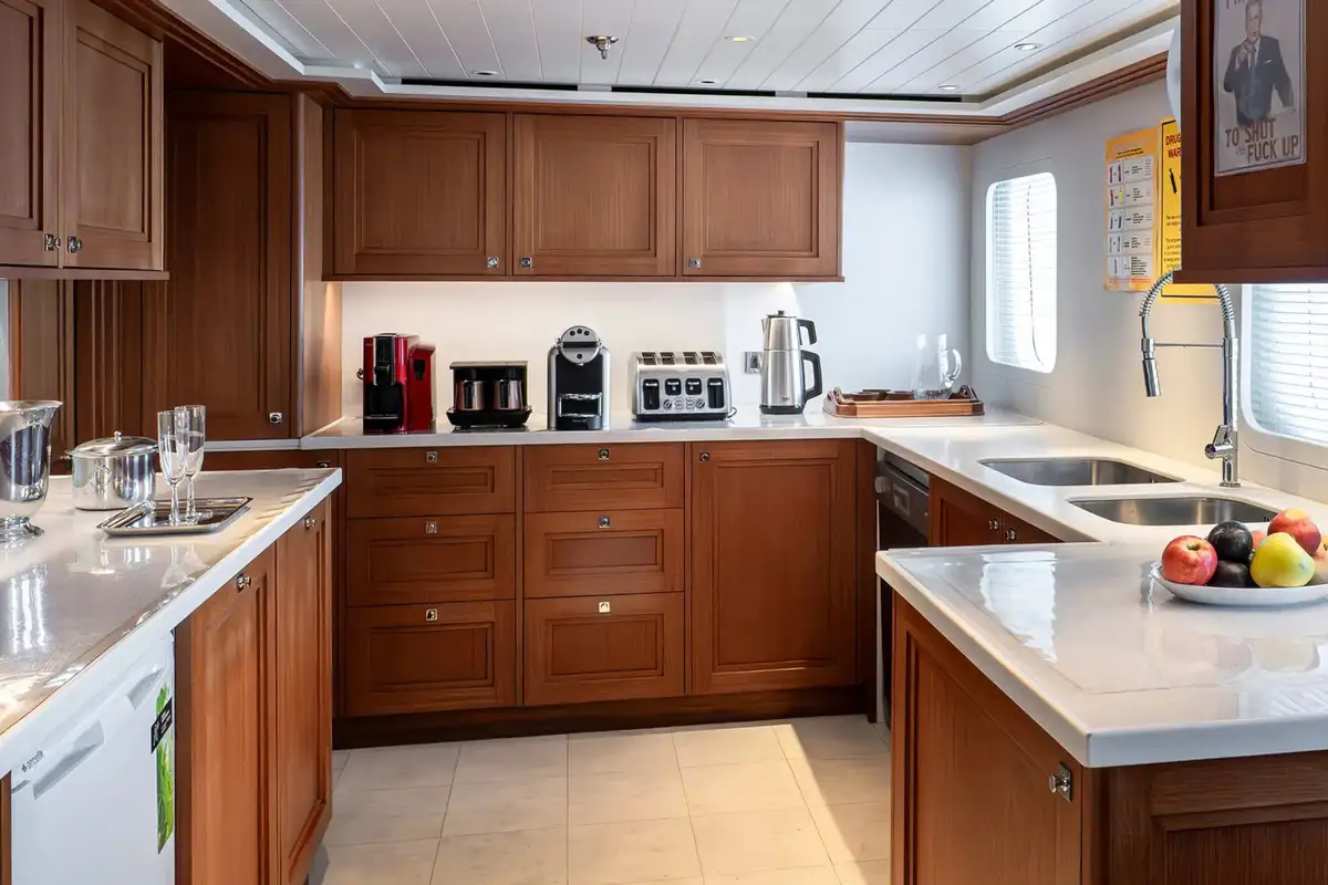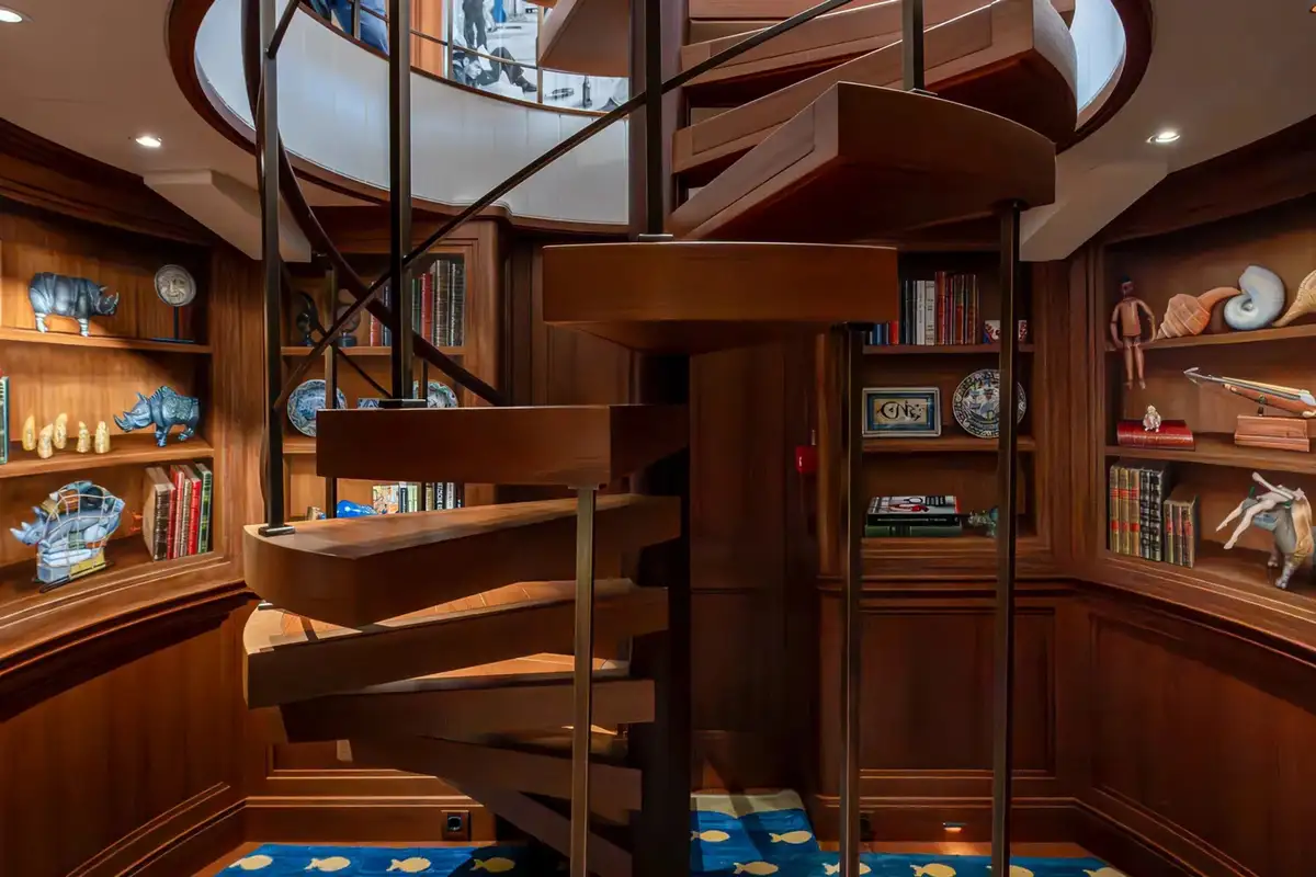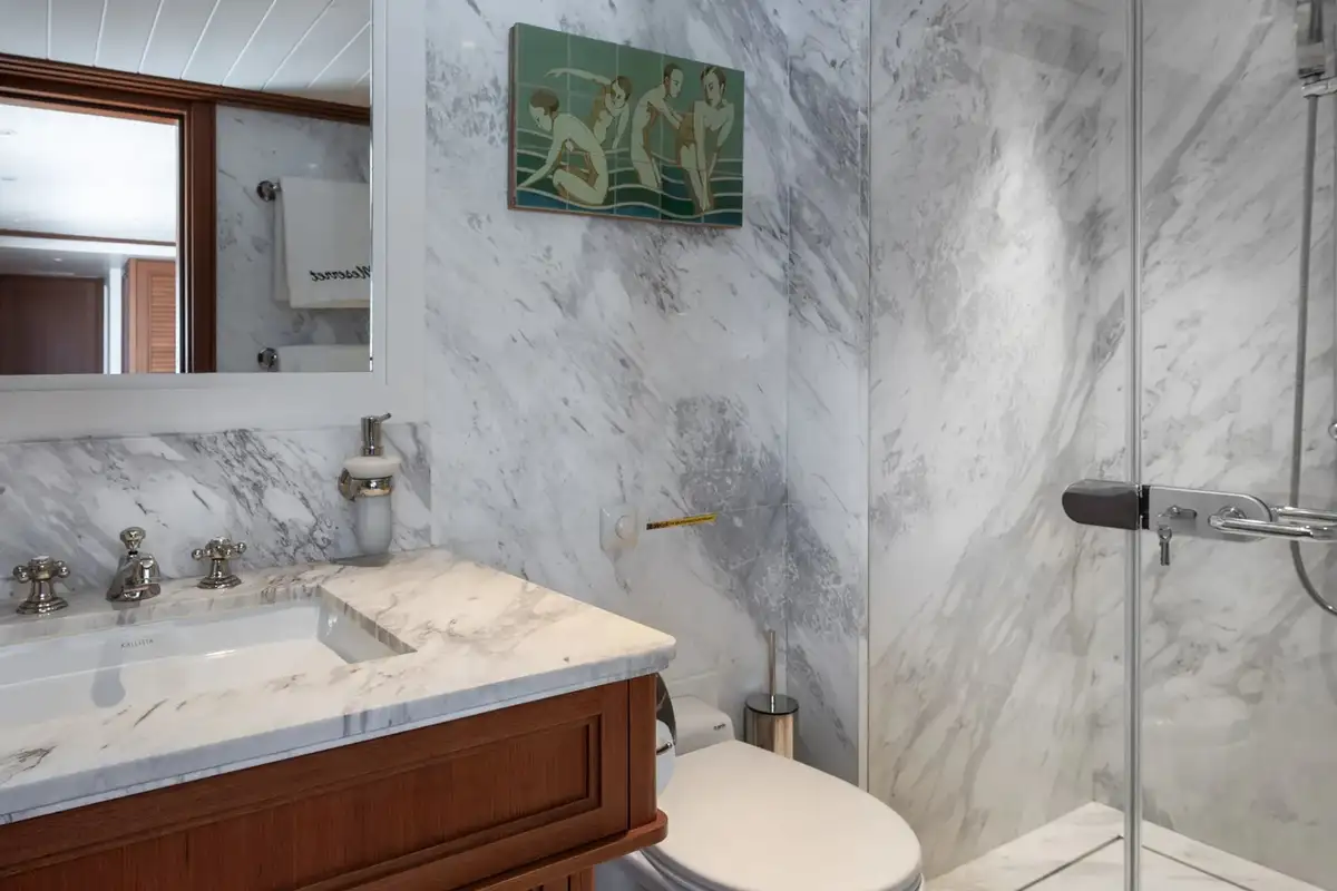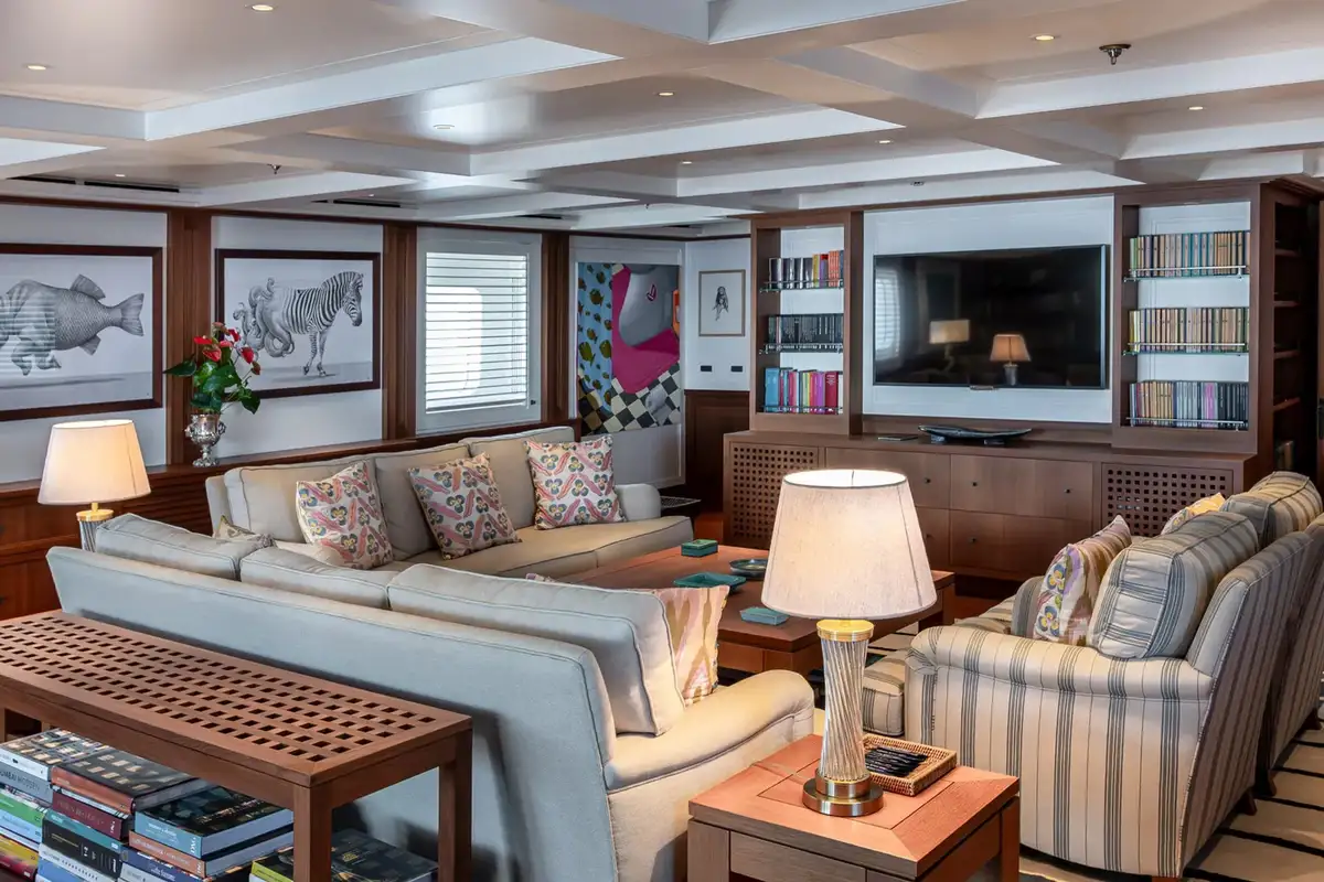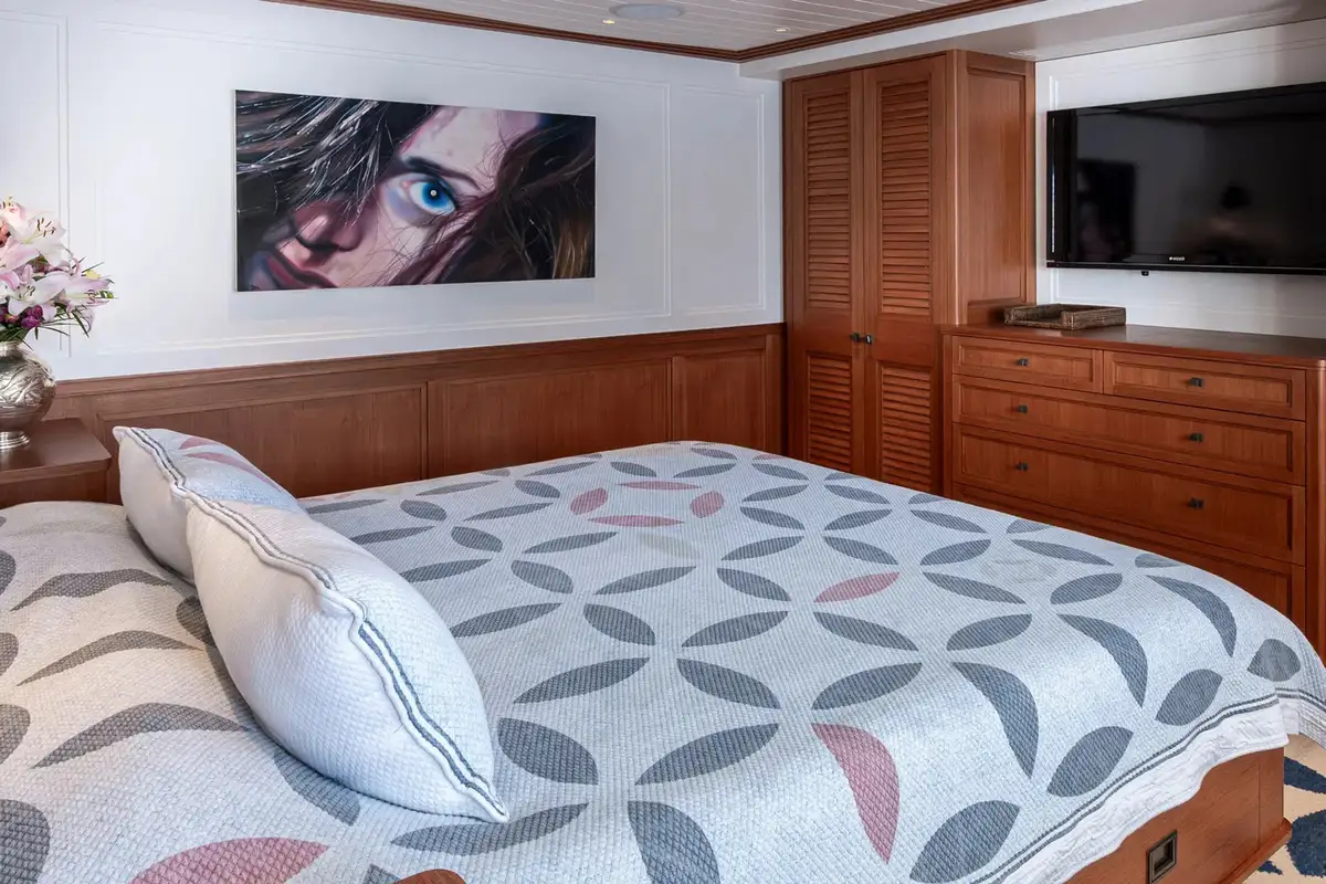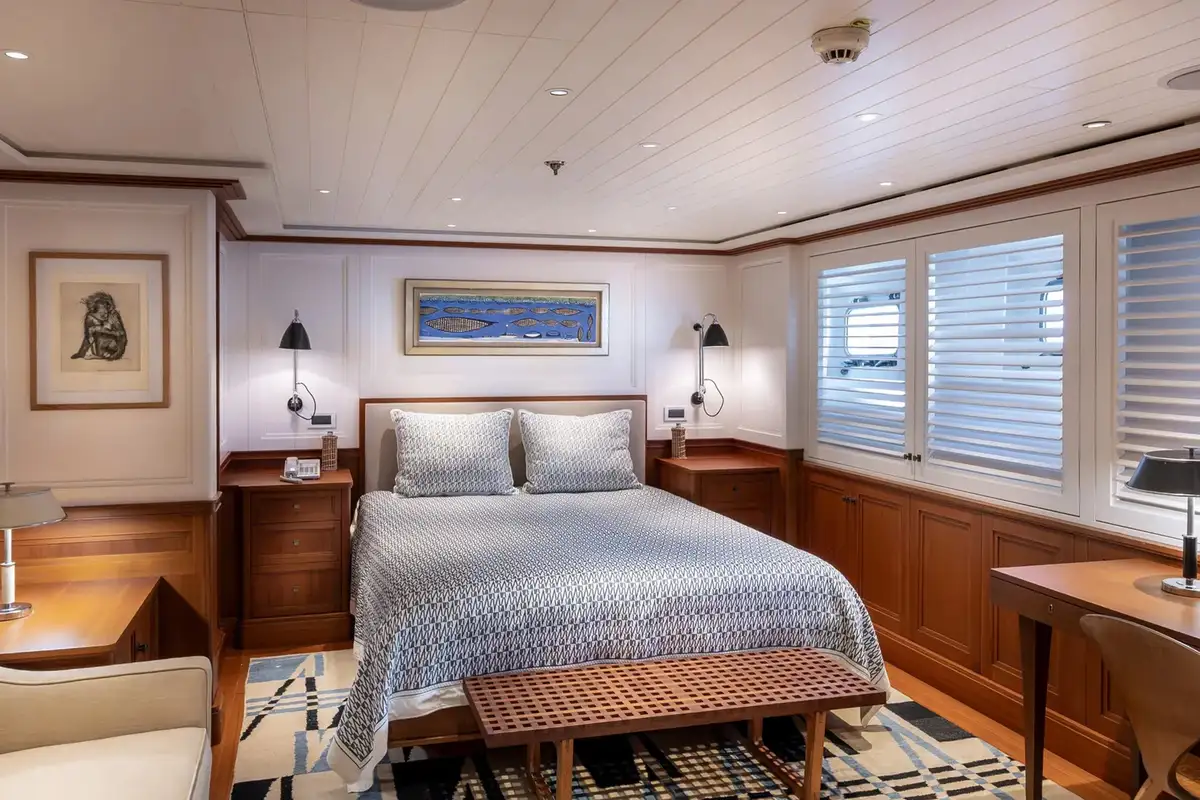She welcomes up to 14 guests in eight cabins with two single cabins for secretaries or security staff. The owner’s suite, forward on the main deck, has access from the lobby and from the deck. It features a private office, bedroom, walk-in dressing room and a marble bathroom with a rain shower.