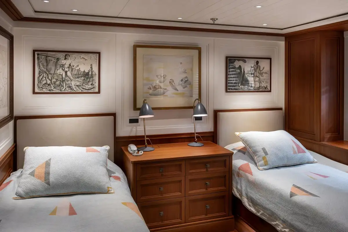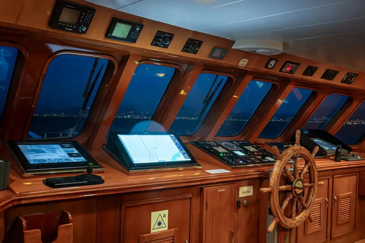Twin 1,350hp Paxman diesel engines give her a top speed of 16 knots, a cruising speed of 15 knots and a transatlantic range of 6,000nm at her passage speed of 12 knots. Vosper Thornycroft stabilisers deliver comfort underway.