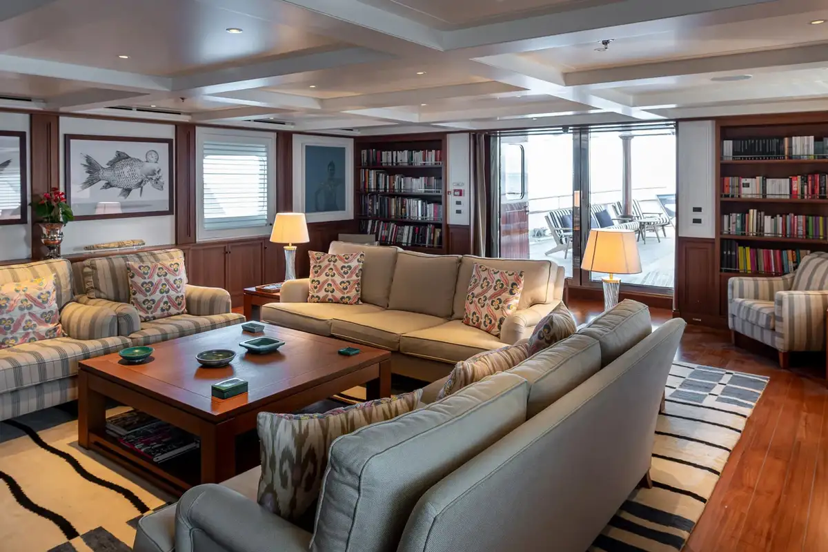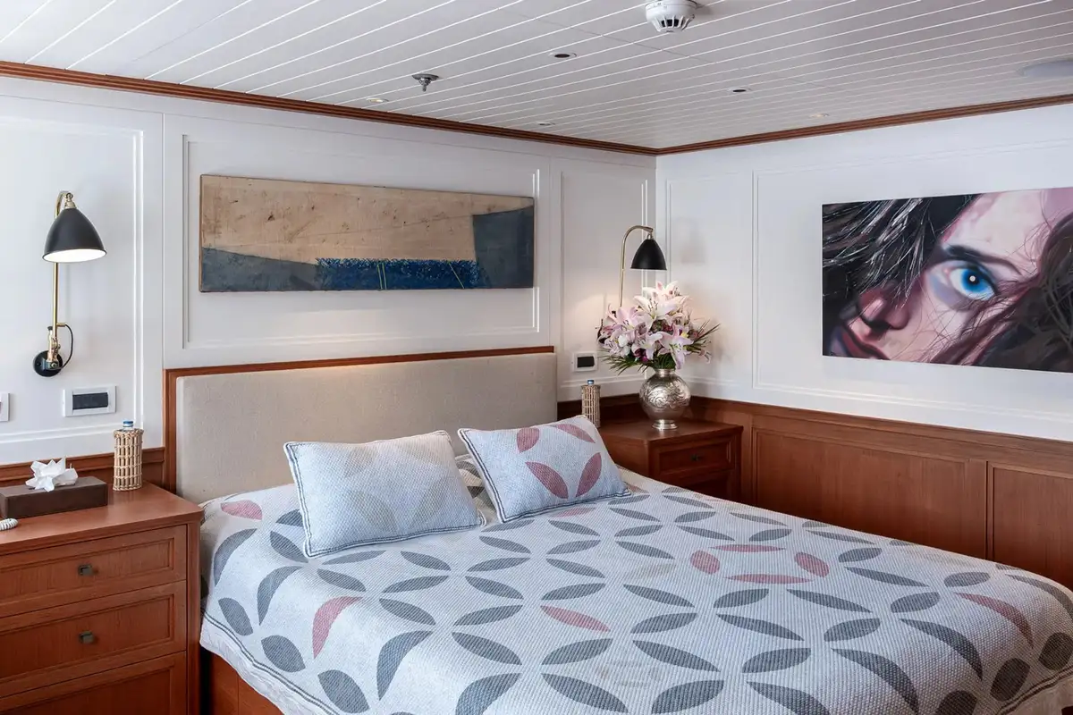 There is a VIP suite on the upper deck and the lower deck is home to four double cabins and a twin cabin as well as the two staff cabins.