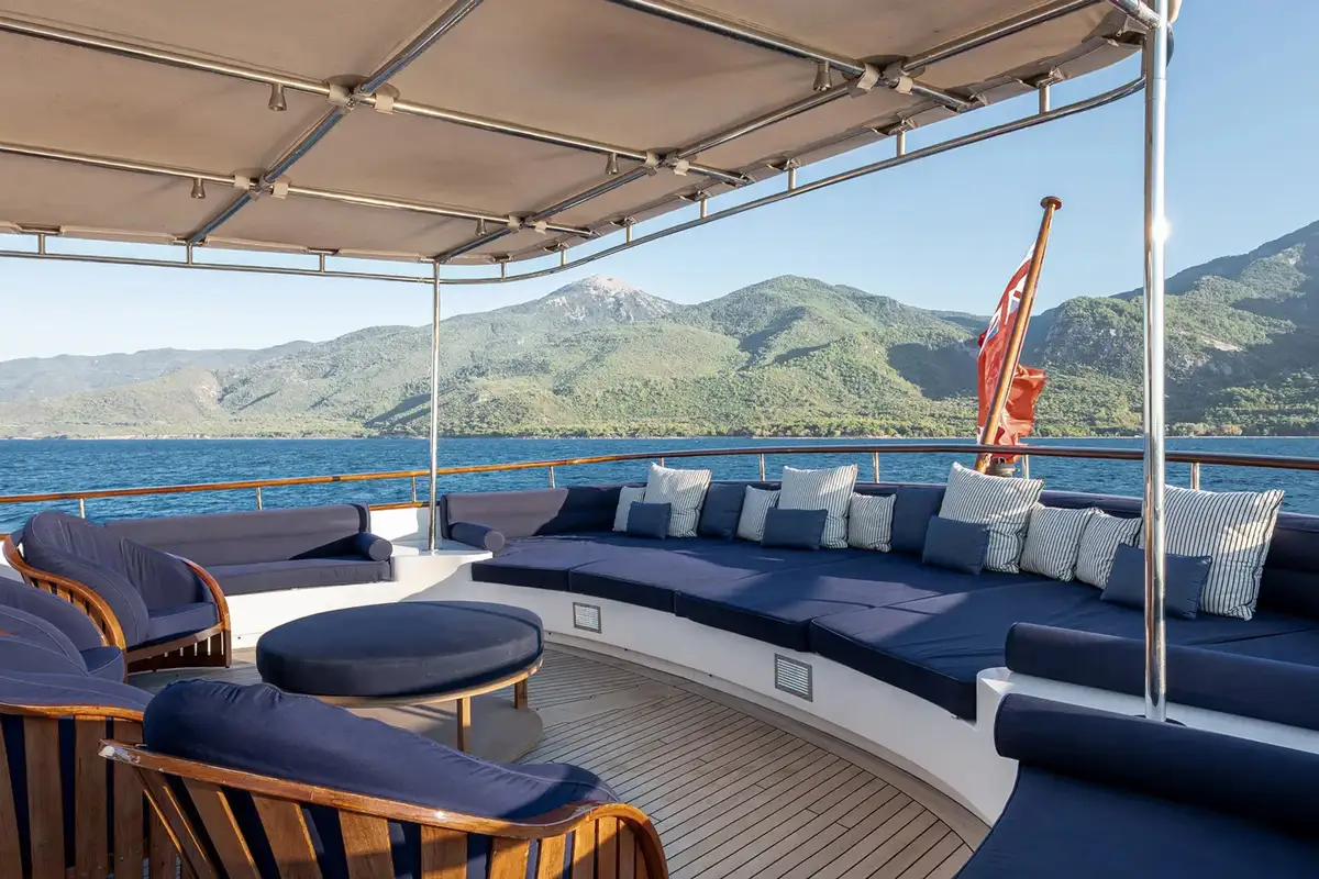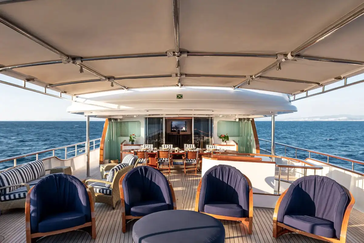 On the upper deck aft there is open-air dining beneath the overhang and a large deck space with a sun lounge with C-shaped banquette seating and armchairs and a pop-up aft-facing TV for movie nights.