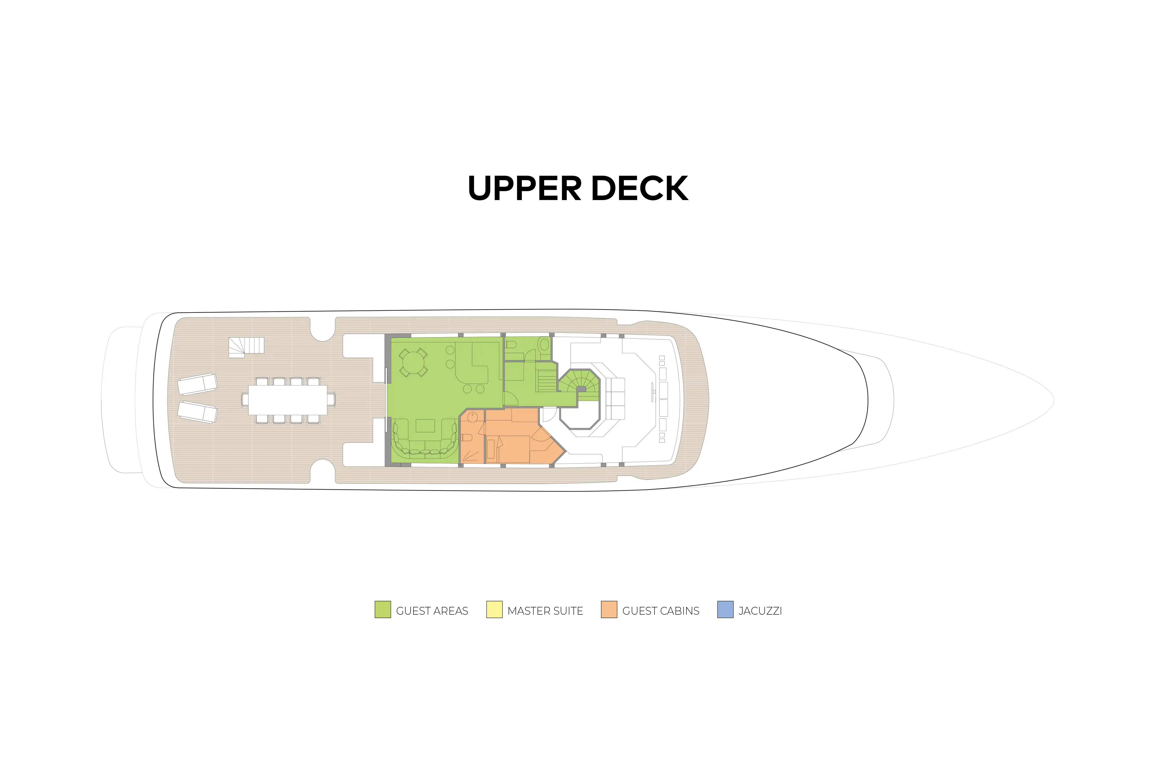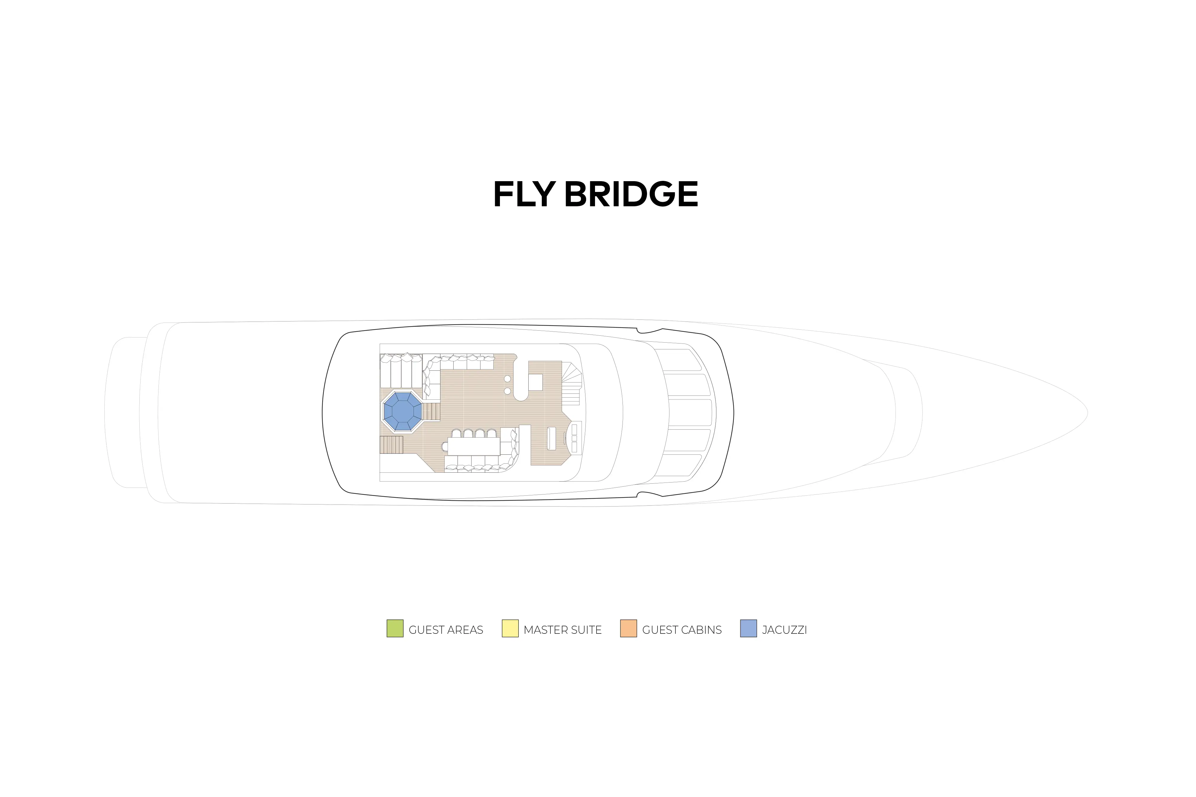 - Expansive sun deck with jacuzzi, sun pads, wraparound seating, and bar with matching parasols