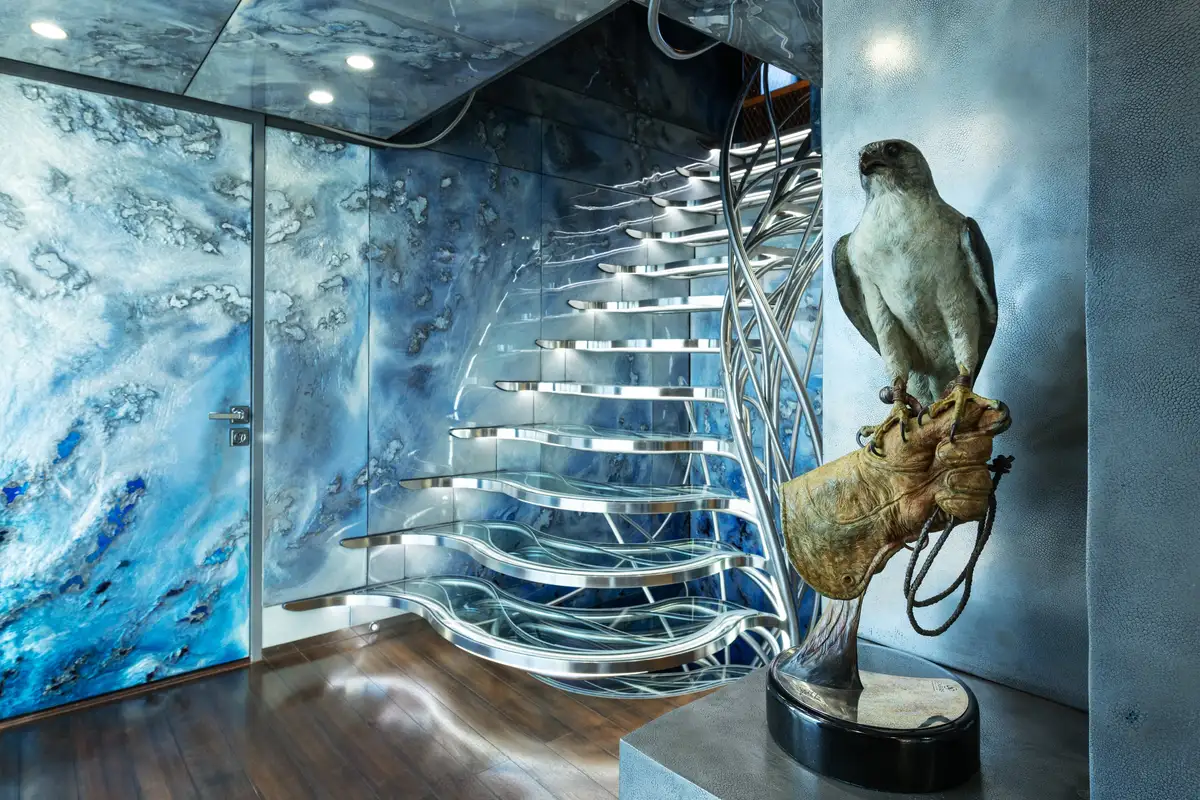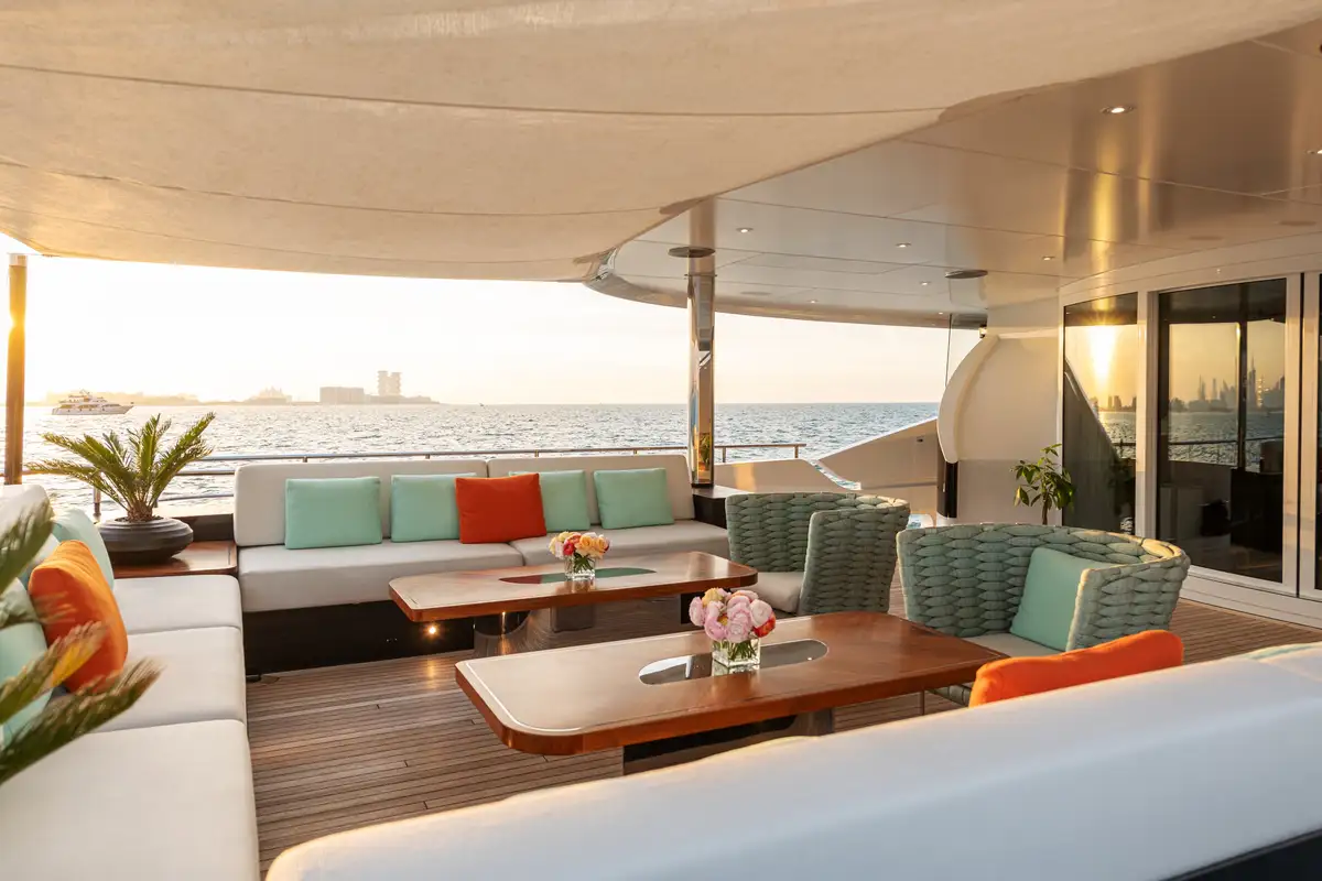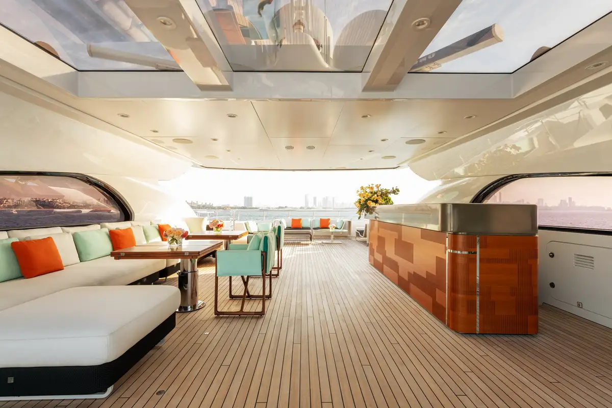 In addition to her luxurious and bespoke interiors, ROCKET features large exterior decks with plenty of guest seating. Her most prominent feature on the exterior is her split level sun deck with a large jacuzzi forward flanked by sun pads and surrounded by glass screens. Aft, under skylights, is a genuine sky lounge with walk-up bar, picture windows and large sliding glass doors fore and aft, making it a wonderful place for dining under the sun or the stars in any weather. On the bridge deck, is a large entertaining space, which can set up as an al fresco dining space for 12 or a convivial afternoon lounge with more seating aft.