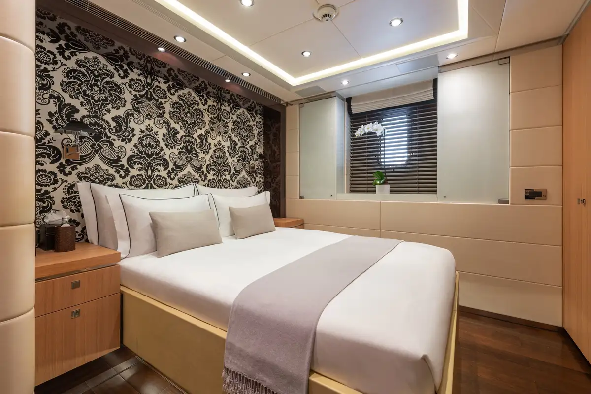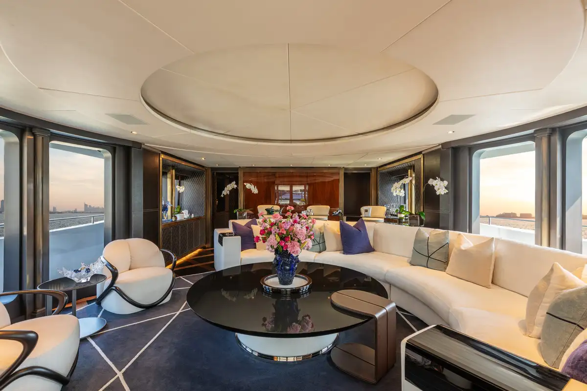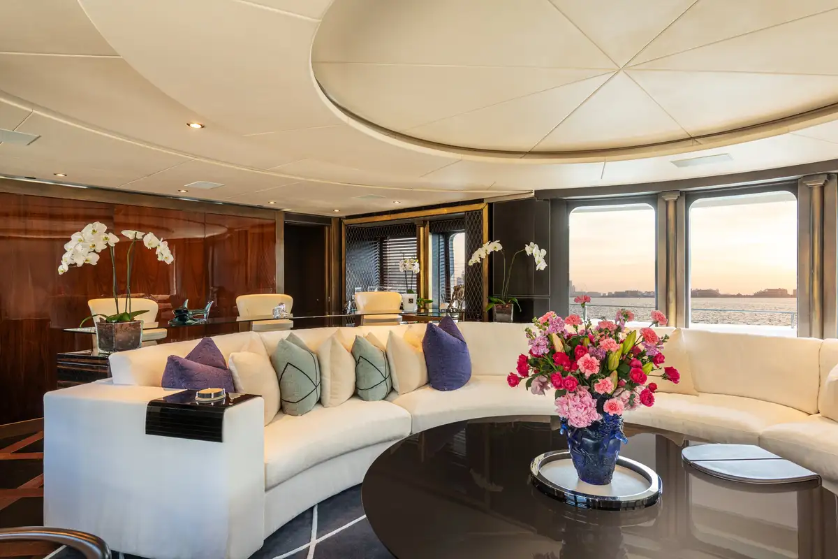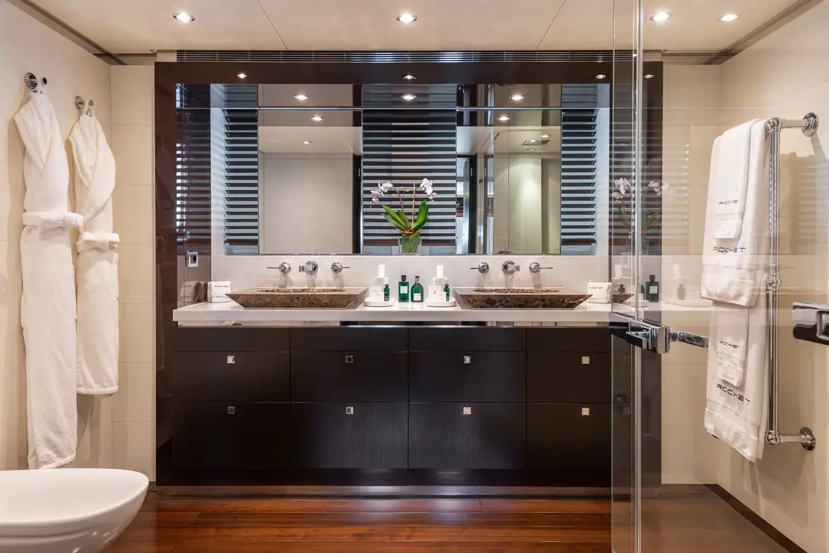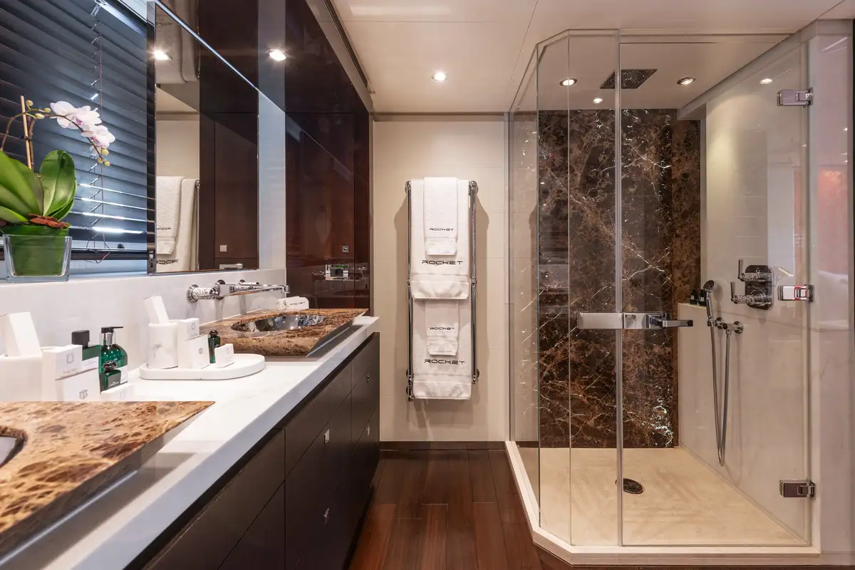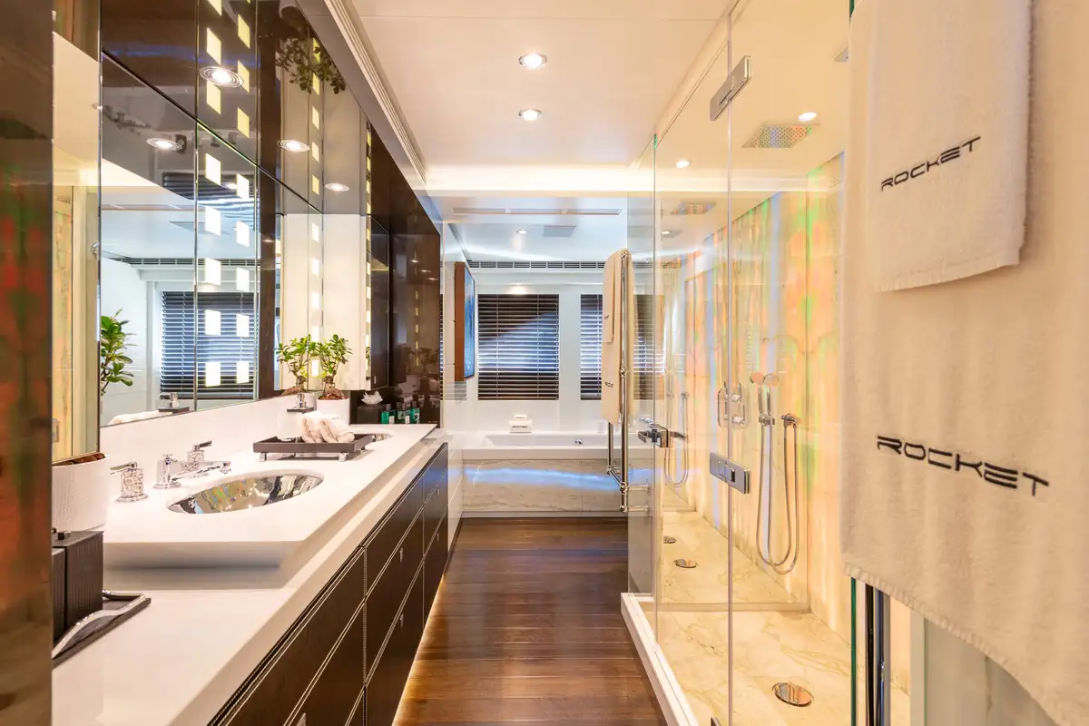 ROCKET offers luxurious and spacious accommodation for 12 guests in six cabins. Forward on the main deck is the full-beam master suite with an en suite bathroom. On the lower deck, there is three double cabins with two twin cabins including an oversized VIP cabin aft. ROCKET also features large communial guest areas including her main deck lounge offering wrap around couch seating forward with an indoor formal dining area aft. On the bridge deck, there is a spectacular circular lounge with 270-degree views and a large TV with surround sound for movie nights.