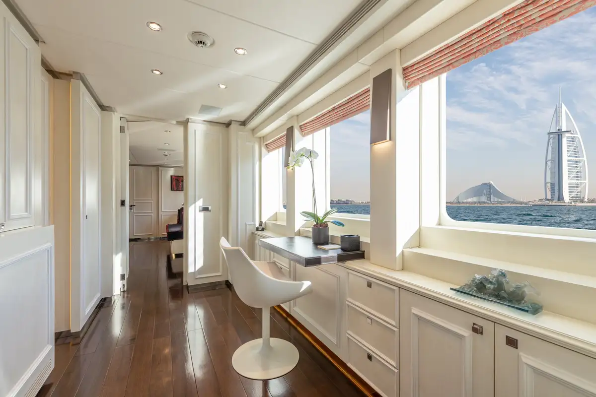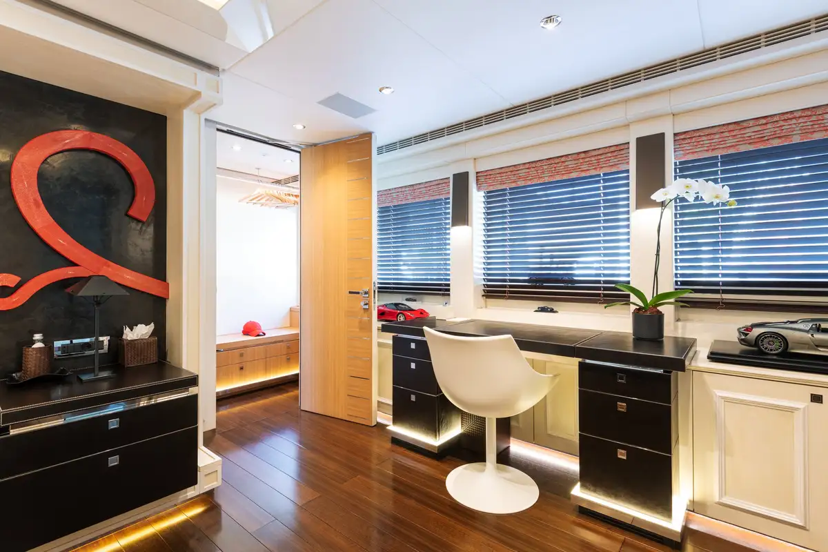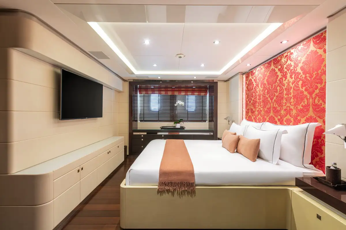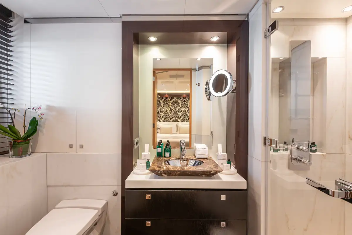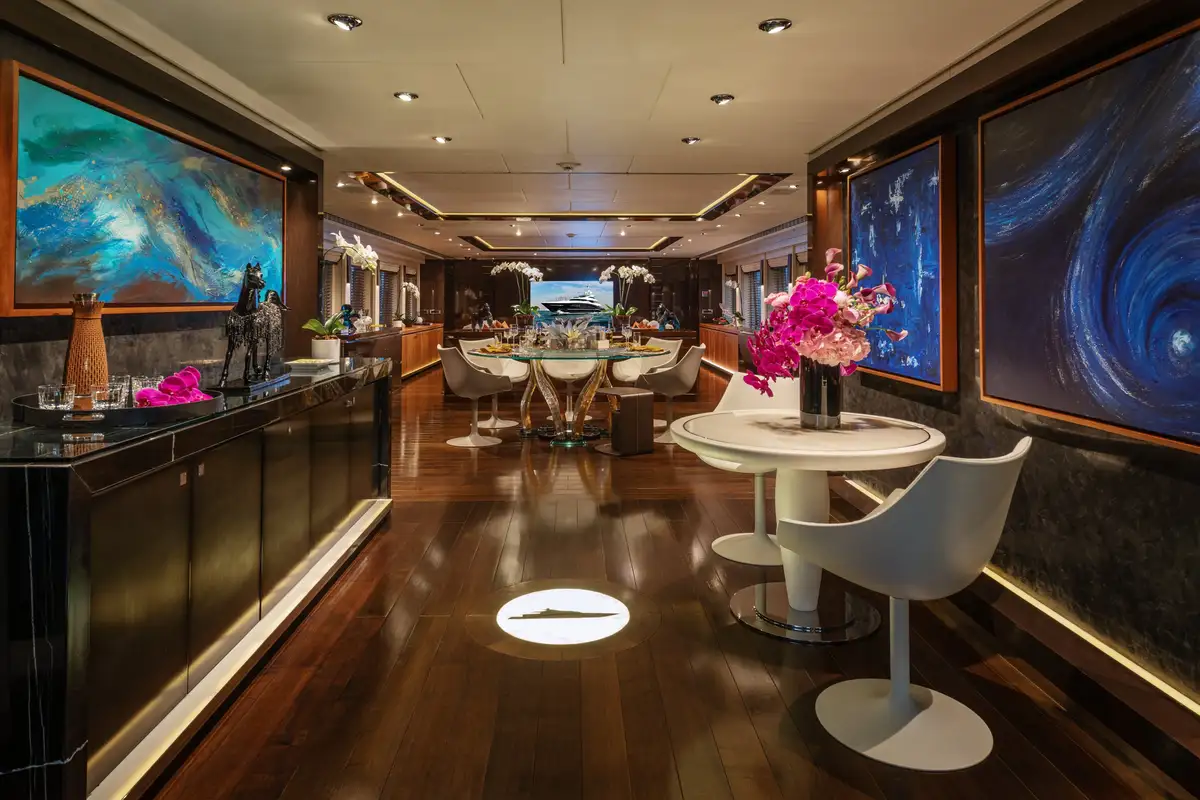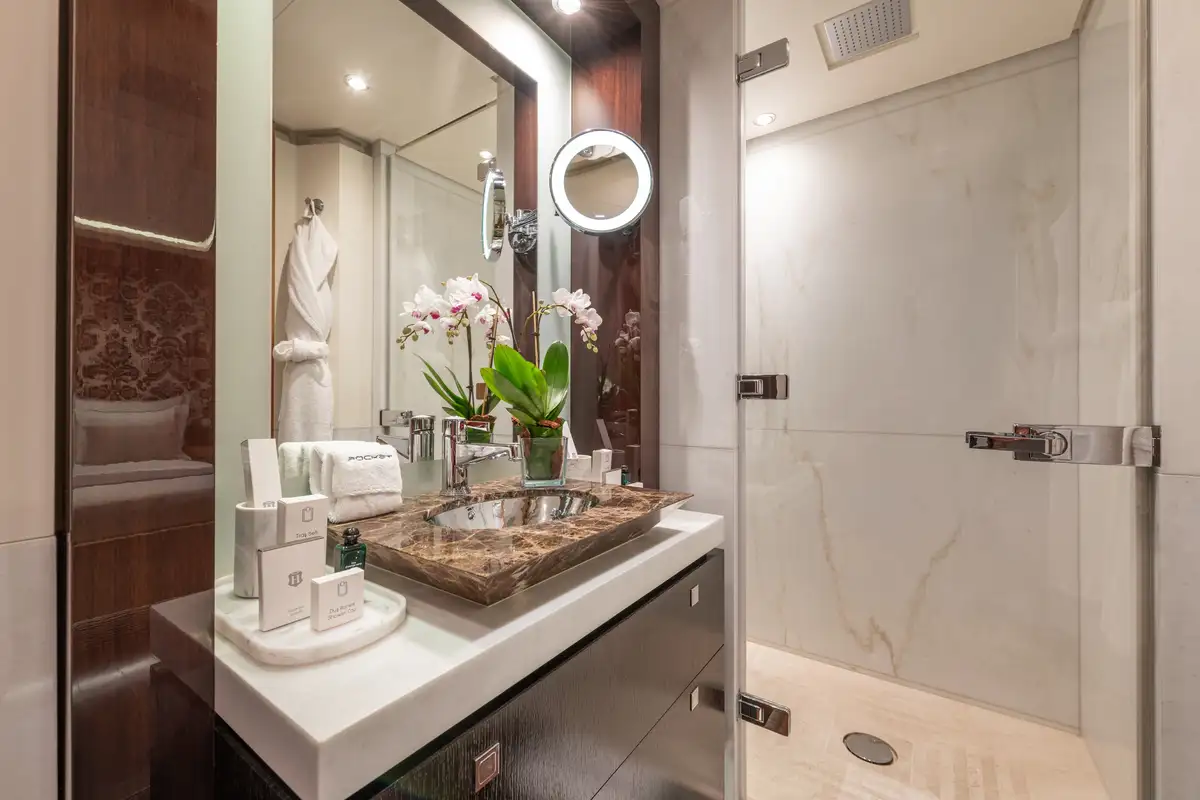 ROCKET offers luxurious and spacious accommodation for 12 guests in six cabins. Forward on the main deck is the full-beam master suite with an en suite bathroom. On the lower deck, there is three double cabins with two twin cabins including an oversized VIP cabin aft. ROCKET also features large communial guest areas including her main deck lounge offering wrap around couch seating forward with an indoor formal dining area aft. On the bridge deck, there is a spectacular circular lounge with 270-degree views and a large TV with surround sound for movie nights.
