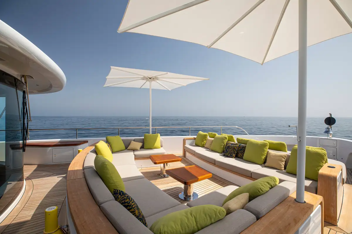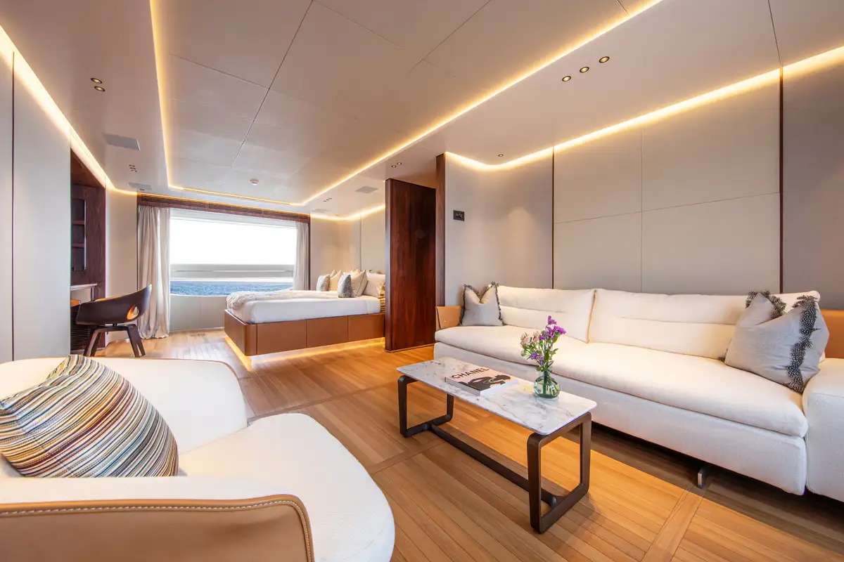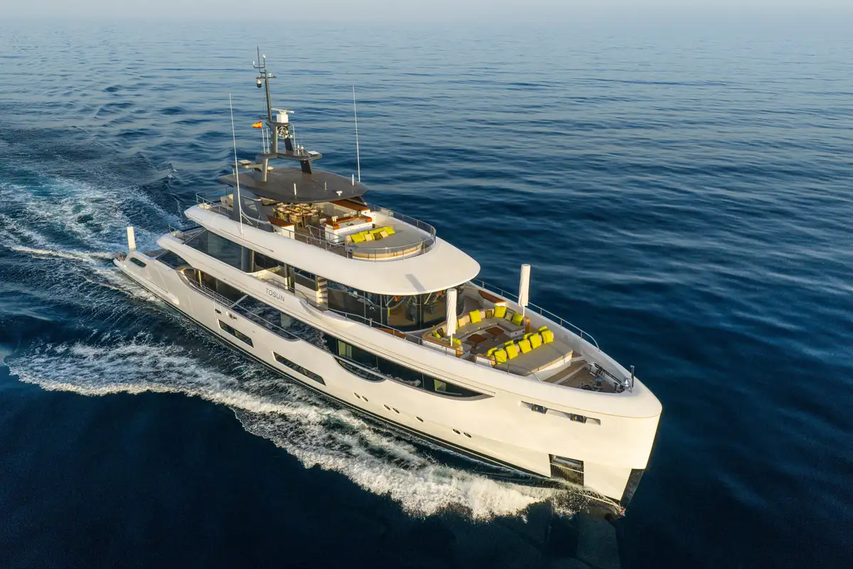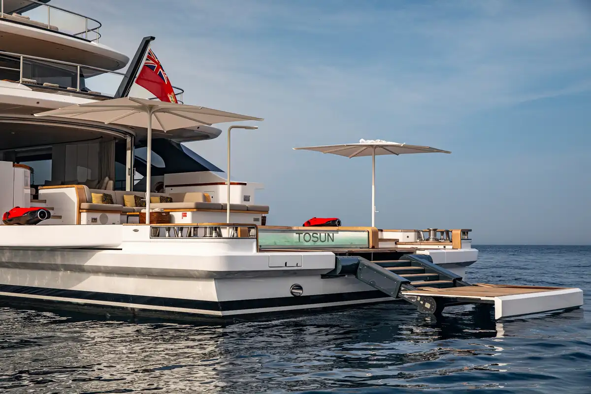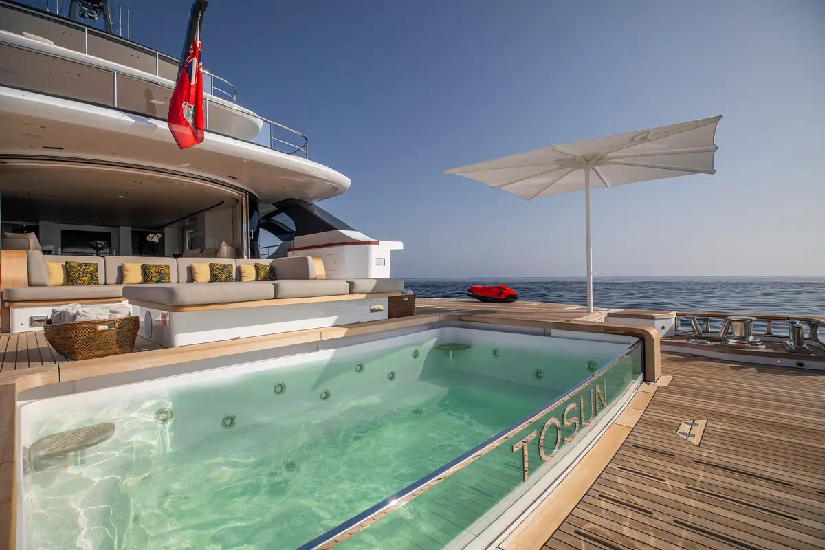 Not just for private use, TOSUN is also charter compliant and is a proven popular charter platform. Her GRP hull is built to RINA rules for classification of pleasure yachts. She is equipped with twin 1,400hp MAN engines that cruise at 14 knots and have a maximum speed of 16 knots. Her range at 11 knots is 4,000nm. She also features zero-speed stabilisers for comfort at anchor and underway.