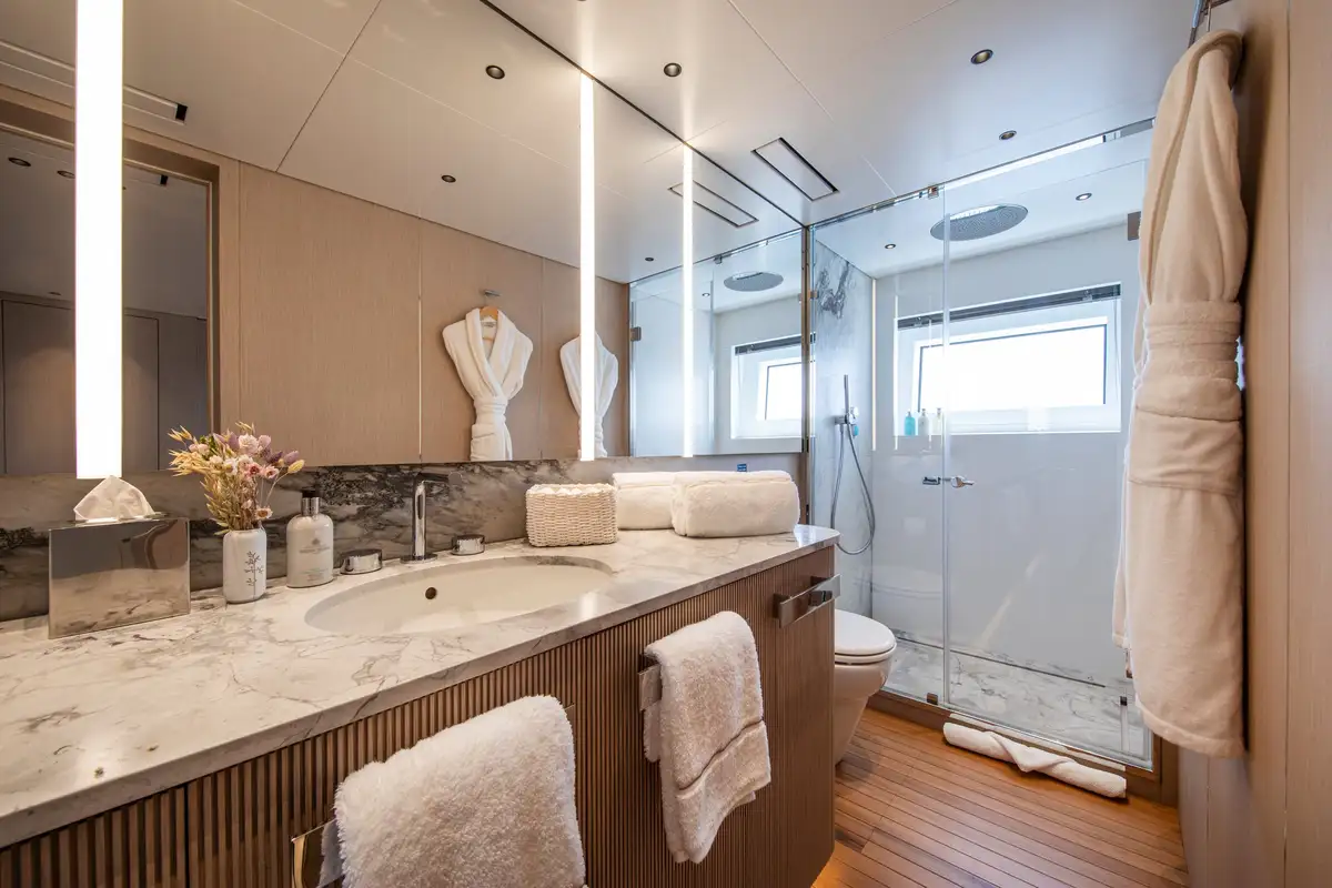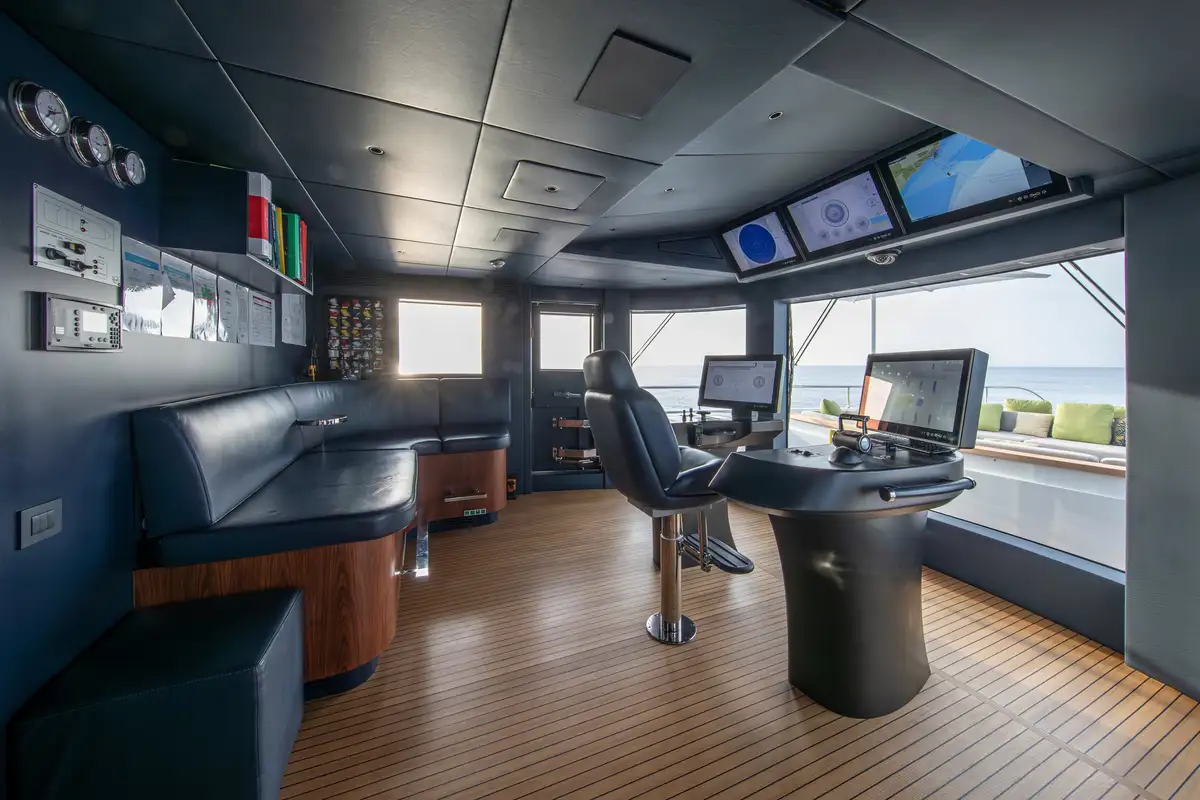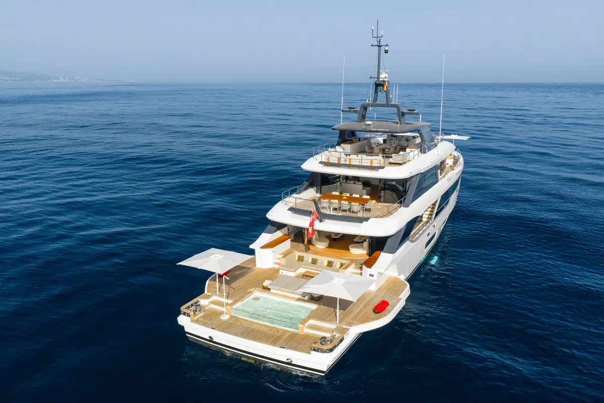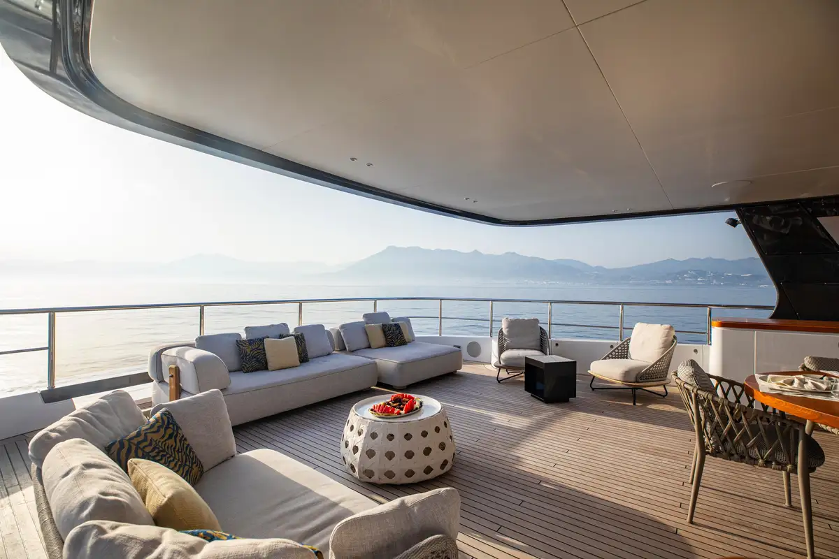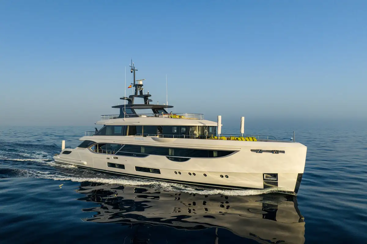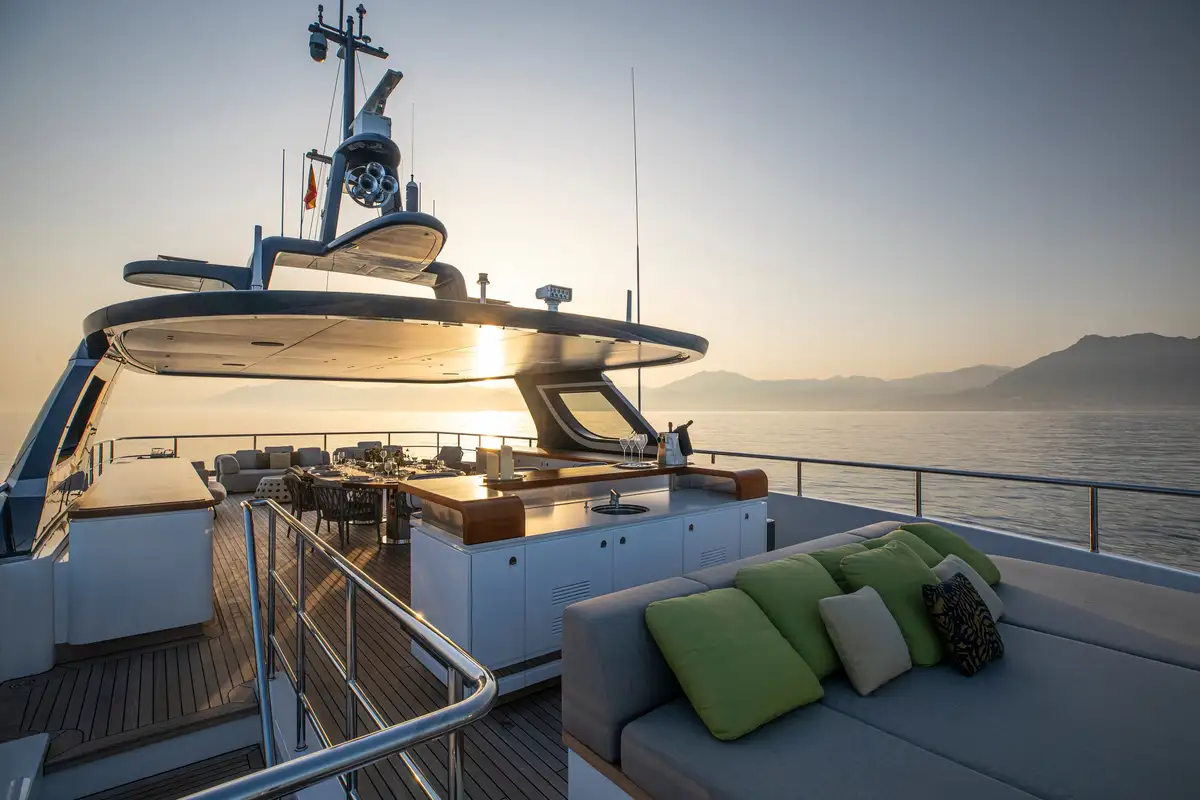 Not just for private use, TOSUN is also charter compliant and is a proven popular charter platform. Her GRP hull is built to RINA rules for classification of pleasure yachts. She is equipped with twin 1,400hp MAN engines that cruise at 14 knots and have a maximum speed of 16 knots. Her range at 11 knots is 4,000nm. She also features zero-speed stabilisers for comfort at anchor and underway.