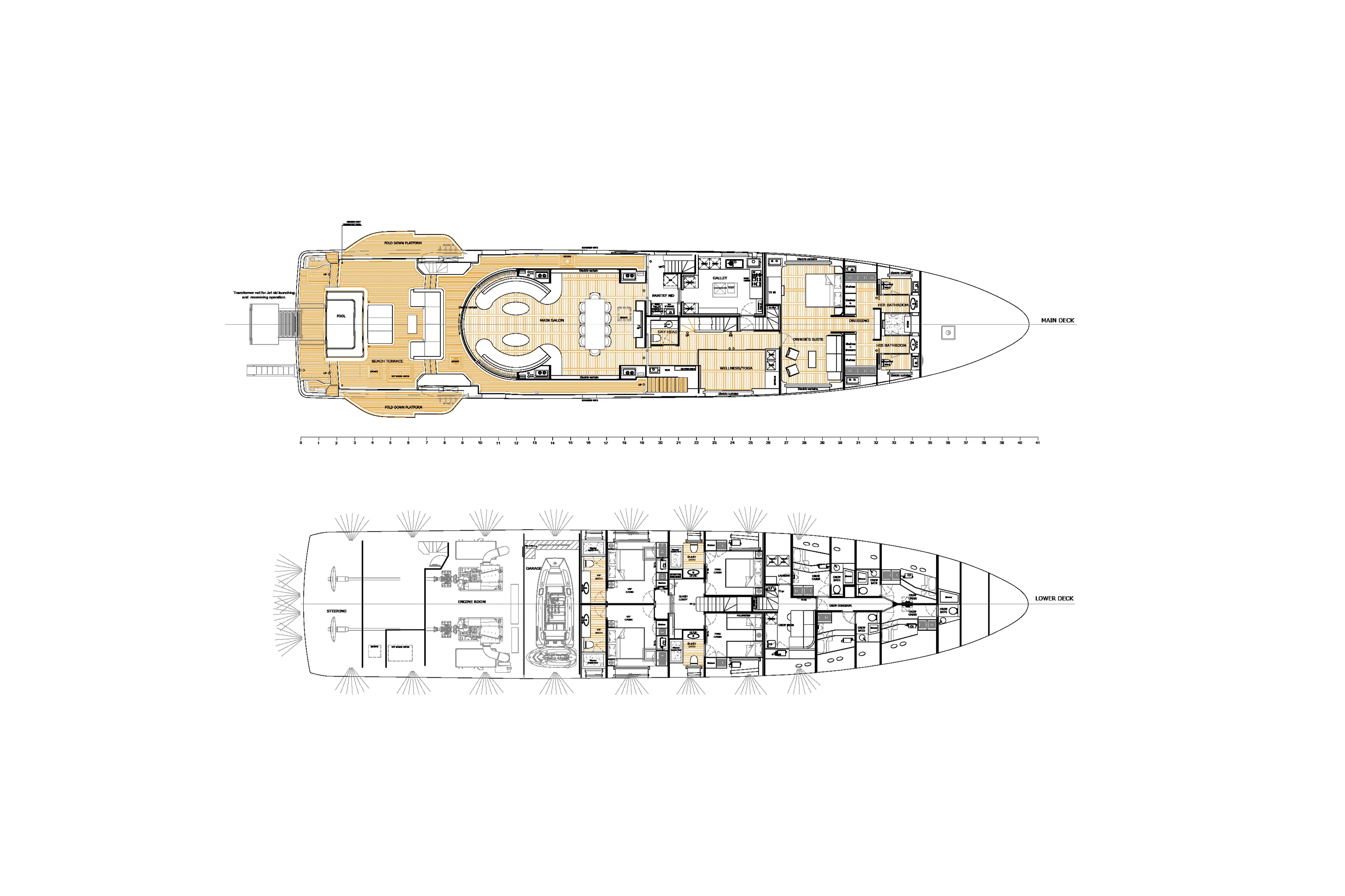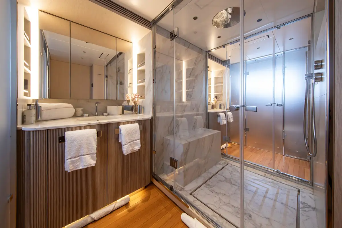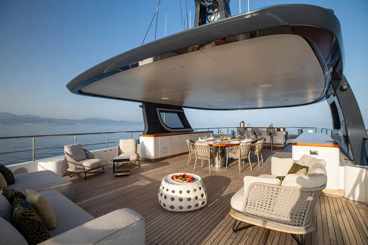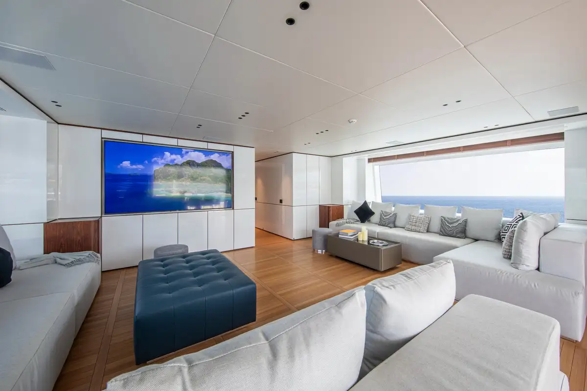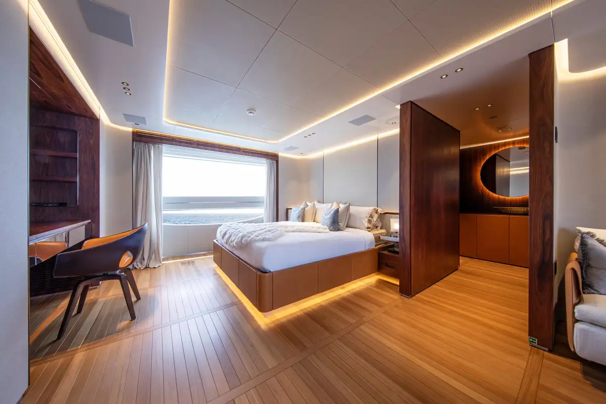 Not just for private use, TOSUN is also charter compliant and is a proven popular charter platform. Her GRP hull is built to RINA rules for classification of pleasure yachts. She is equipped with twin 1,400hp MAN engines that cruise at 14 knots and have a maximum speed of 16 knots. Her range at 11 knots is 4,000nm. She also features zero-speed stabilisers for comfort at anchor and underway.
