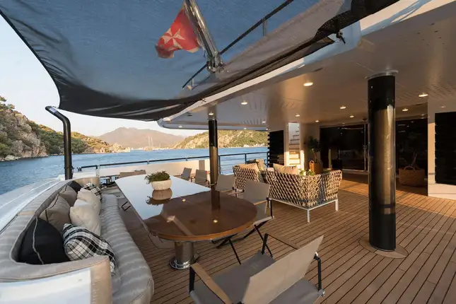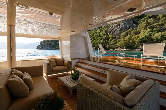 All of the guest cabins on board are generously sized and their en suite bathrooms have a marble finish. The master suite, which occupies the forward end of the main deck, includes a separate office and a TV/cinema setup with a projector screen and double glass doors that lead out onto its private balcony. What better way to start your day on holiday than to step outside and breathe the warm sea air?