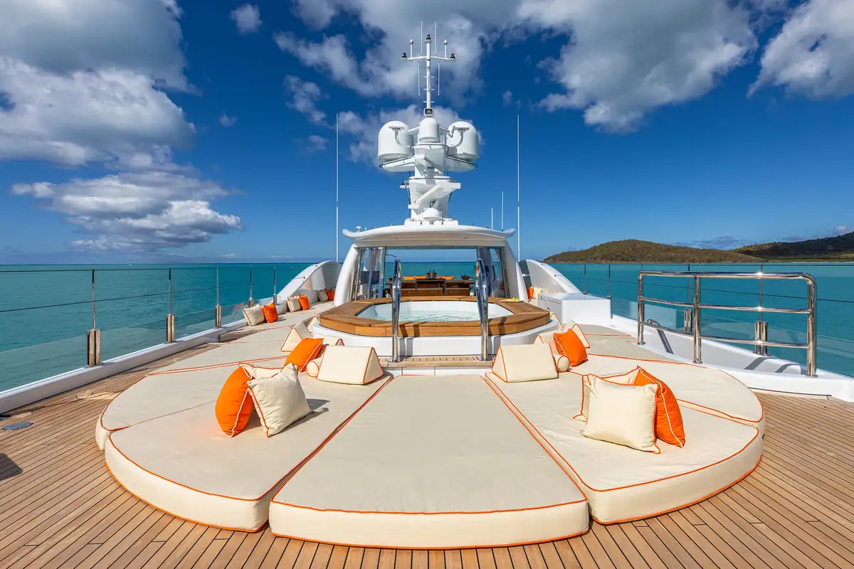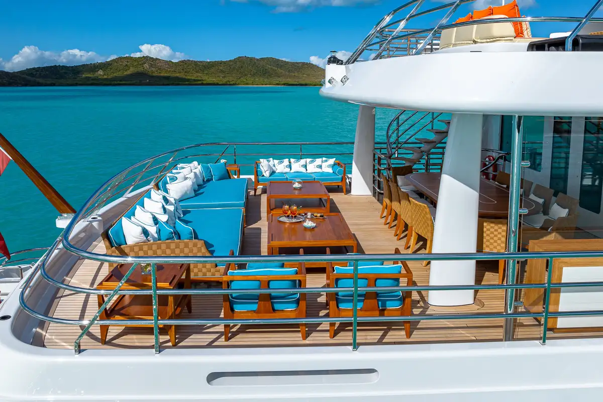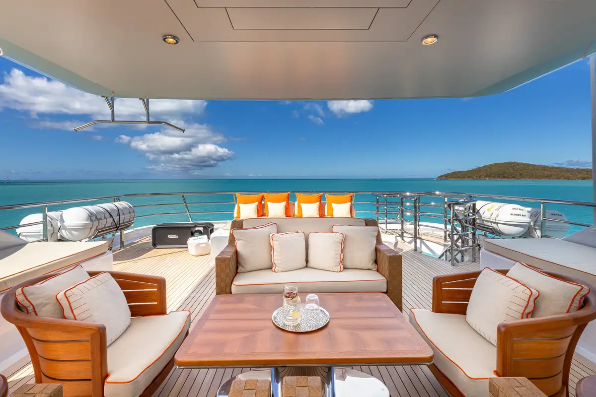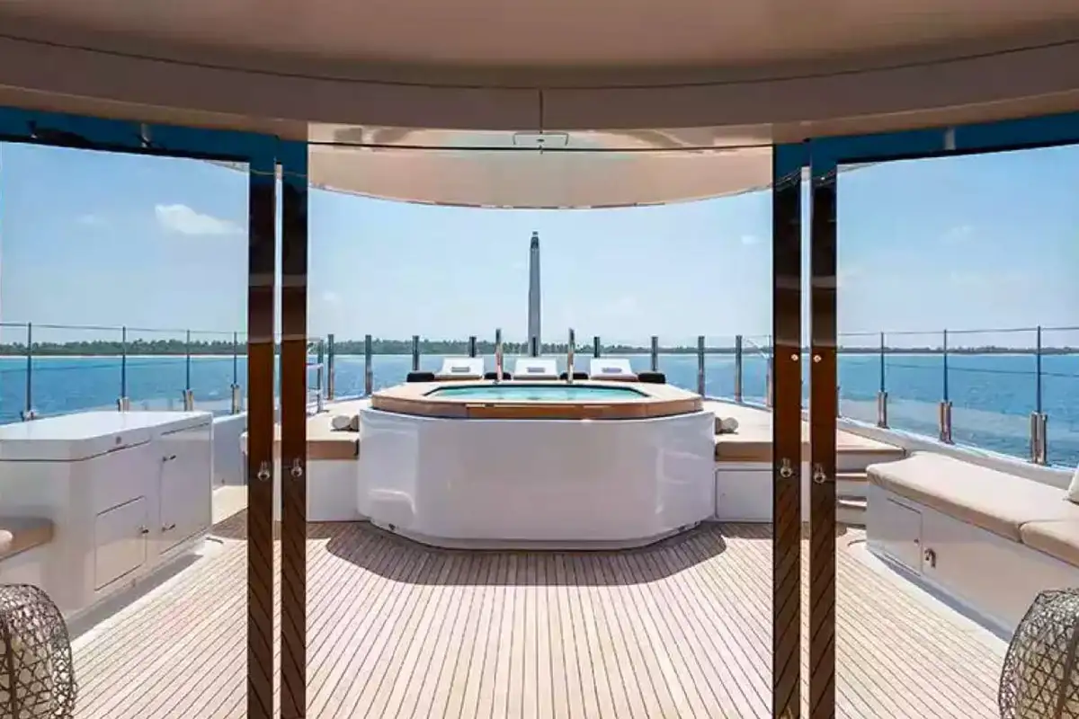 For those seeking wellness and recreation, the versatile sun deck hosts exercise equipment for morning workouts with panoramic ocean views. As evening descends, the sun deck transforms into a vibrant party venue, complete with disco lights and an impressive sound system – the perfect space for all manner of celebrations.
