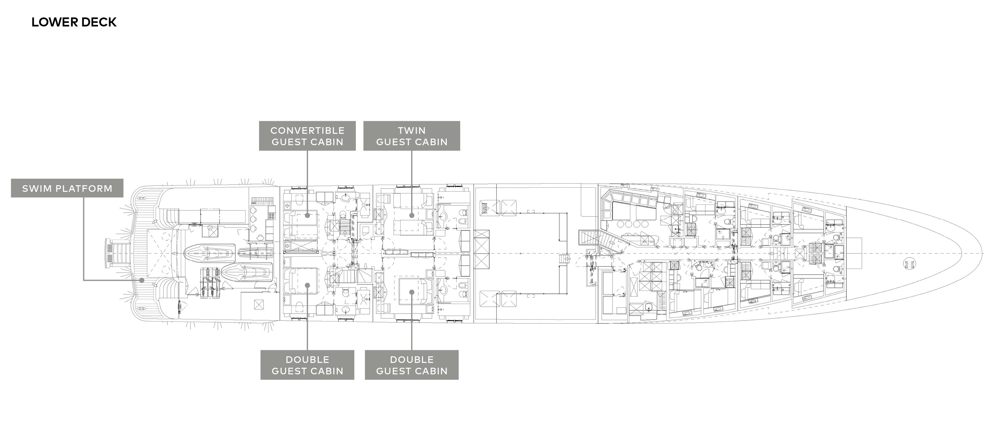 DEEP BLUE’s considerately designed layout caters perfectly for families and groups. Six well-appointed cabins provide luxurious comfort, including a master suite and convertible double/twin cabin on the main deck. The lower deck features three double guest cabins and an additional twin cabin. The master suite is thoughtfully designed, featuring a private study and dressing room for more privacy and convenience.