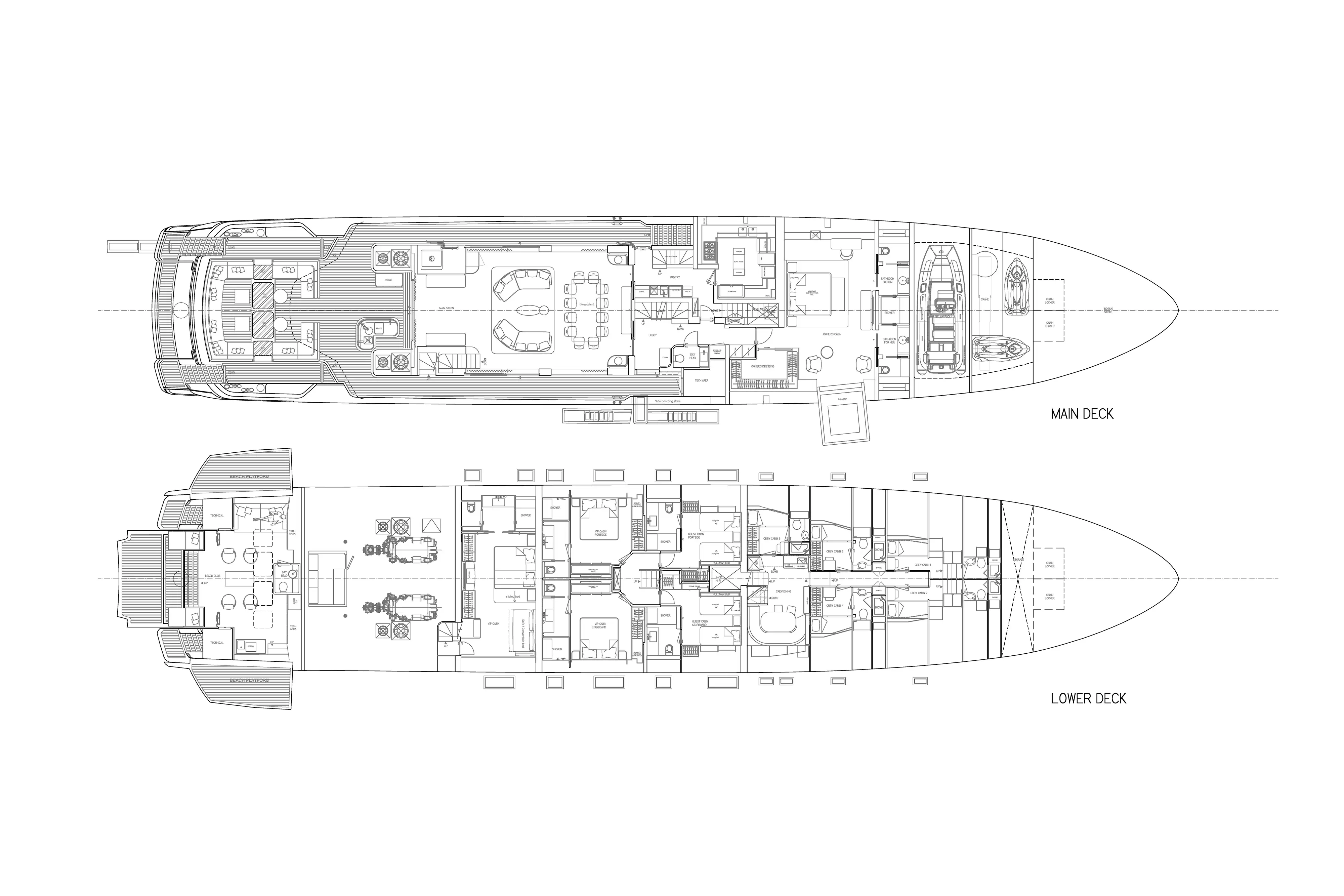 The beach club on DOKINHA is a true retreat, offering fold-out terraces on three sides that connect guests directly to the water. With teak wall panelling, built-in towel rails, and comfortable loose seating, this space is ideal for lounging, diving into water sports, or simply enjoying the close connection to the ocean. Zero-speed stabilisers guarantee a smooth and comfortable experience whether at anchor or cruising. A towed tender is also available to explore nearby destinations with ease.