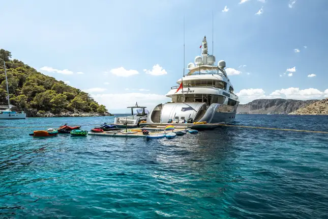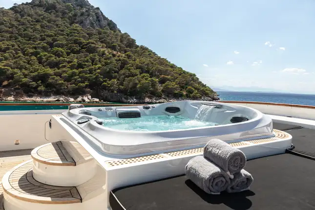 The large gym on the main deck forward is also a welcome feature for many active guests. The inviting main saloon offers spacious seating and the large square dining table offers vast space for fine dining for up to 12 guests. The exterior areas on the main deck aft offer a relaxed lounge leading into the main saloon. The master suite is located on the upper deck and the five further guest cabins all on the lower deck. The upper deck aft features both comfortable low seating area in the shade and sun chairs for casual relaxation or sunbathing. Finally, the amazing sun deck has spacious dining facilities, a bar and jacuzzi with surrounding sun chairs.