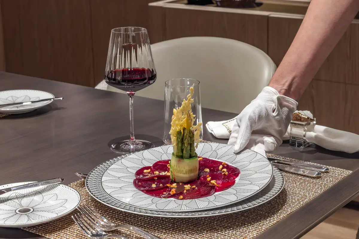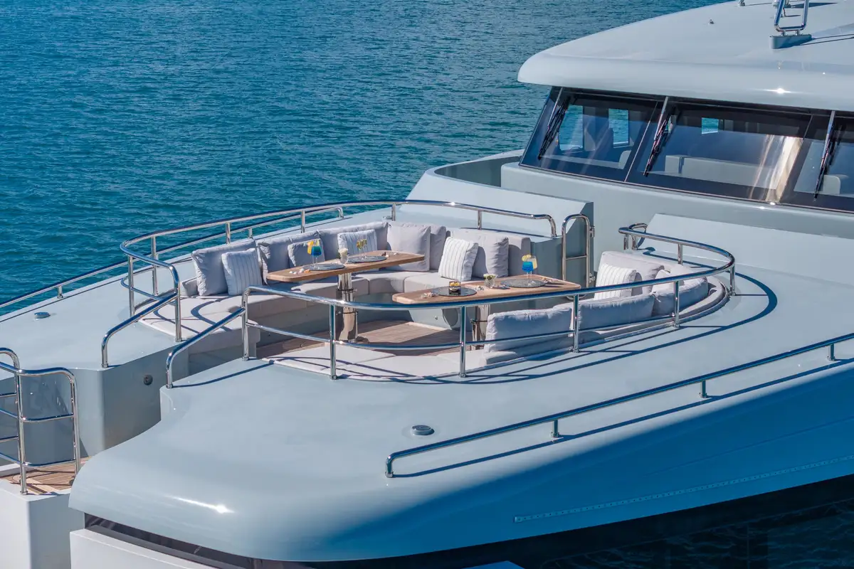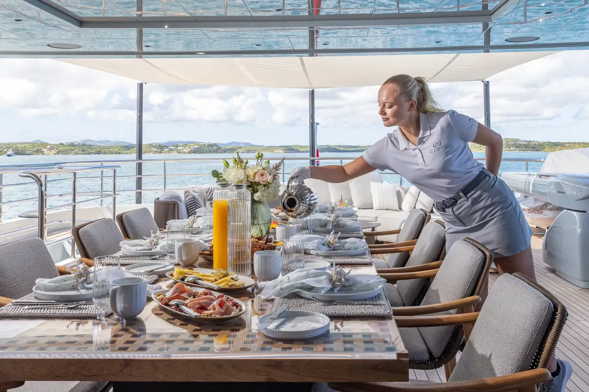 Across three decks, GIOIA is made for both togetherness and tranquility. On the sun deck, soak in the raised jacuzzi as the horizon stretches ahead, then dry off on the surrounding sun pads with a cocktail in hand. A few steps down there’s a shaded lounge for lazy afternoons, while the sit-up bar plays host to some creative mixology. By evening, the upper aft deck transforms into a stage for long dinners under the stars, followed by relaxed conversations in deep, inviting sofas.