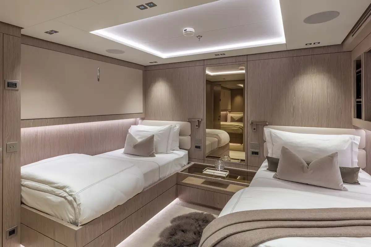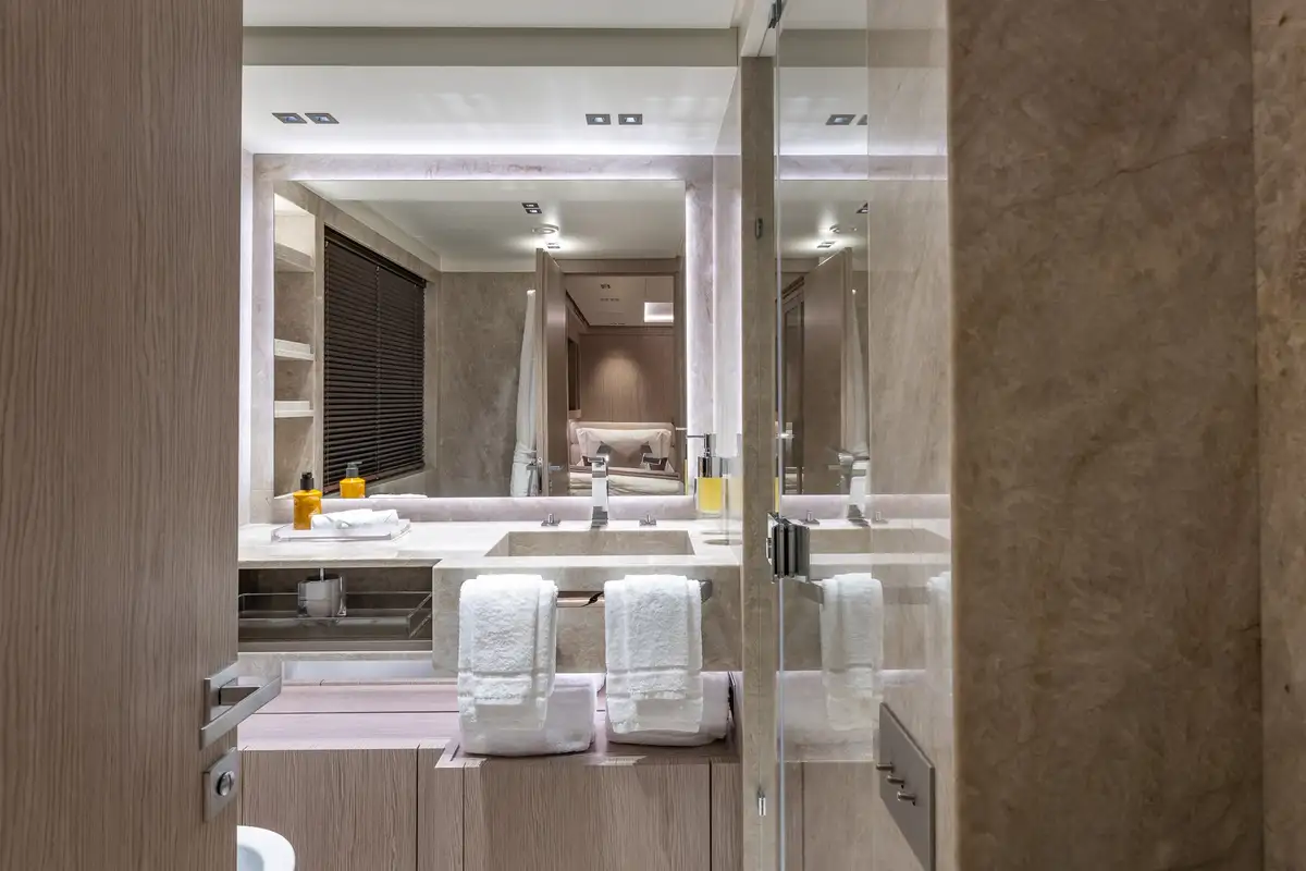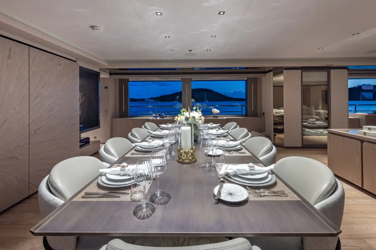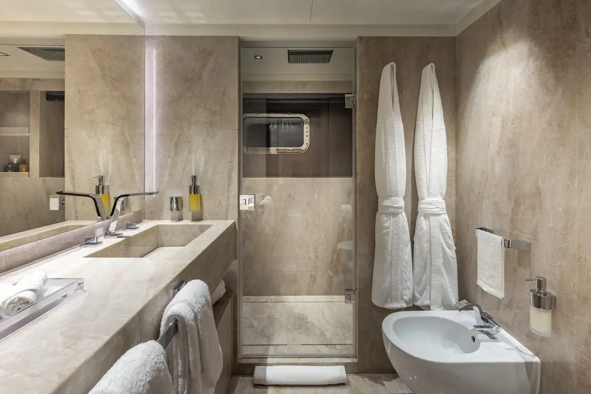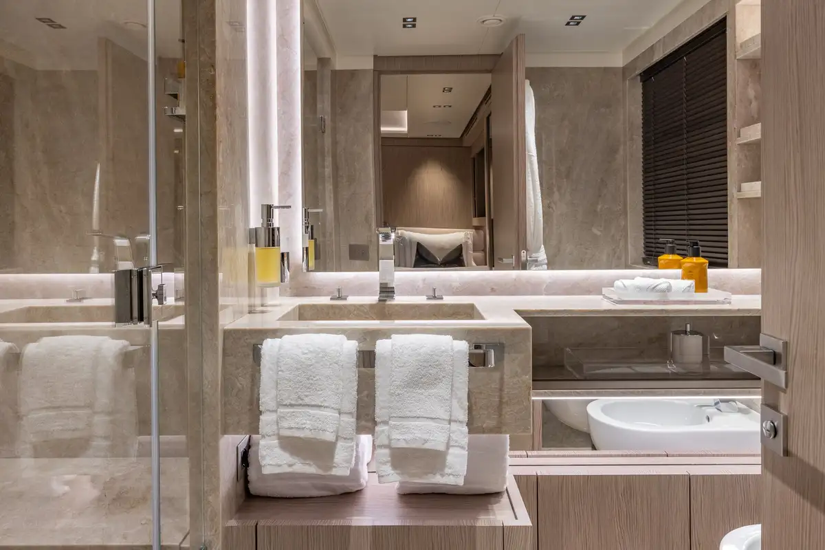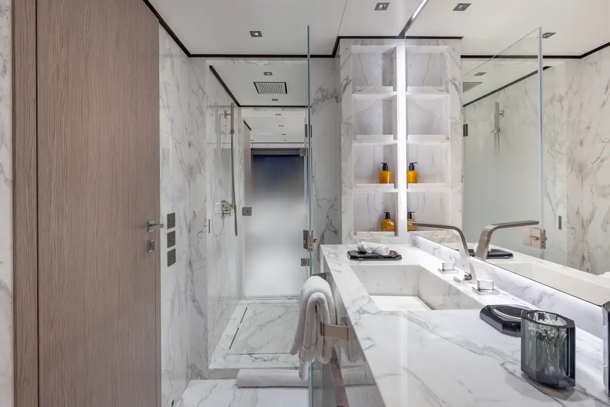Accommodation for up to 12 guests is beautifully designed. The main deck master suite commands sweeping views from a central king bed, with its own lounge, dressing room, and a marble bathroom that feels like a spa retreat. Below, two double and two twin cabins with pullmans – each with en suite – ensure every guest feels equally indulged.