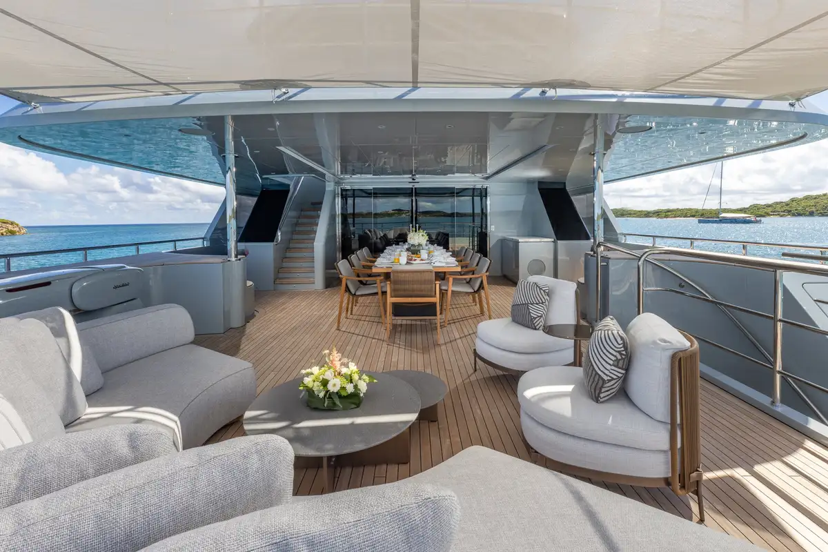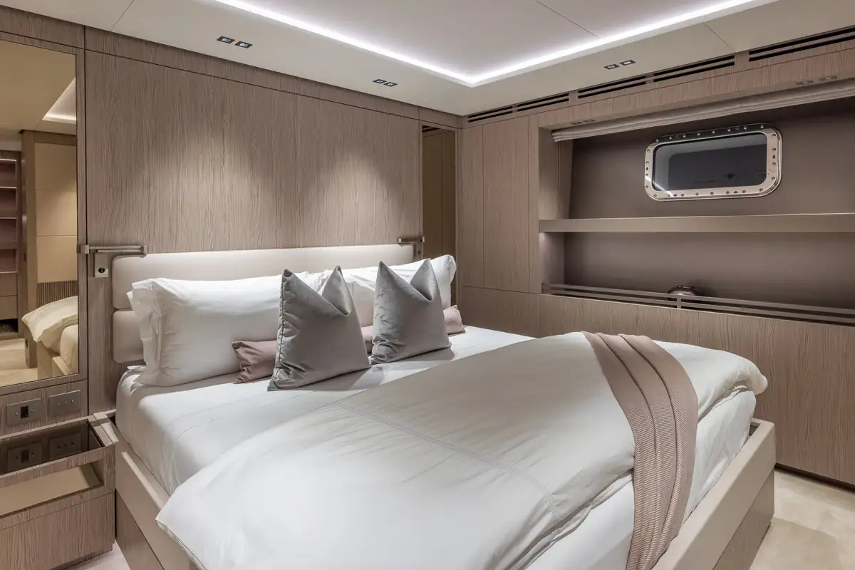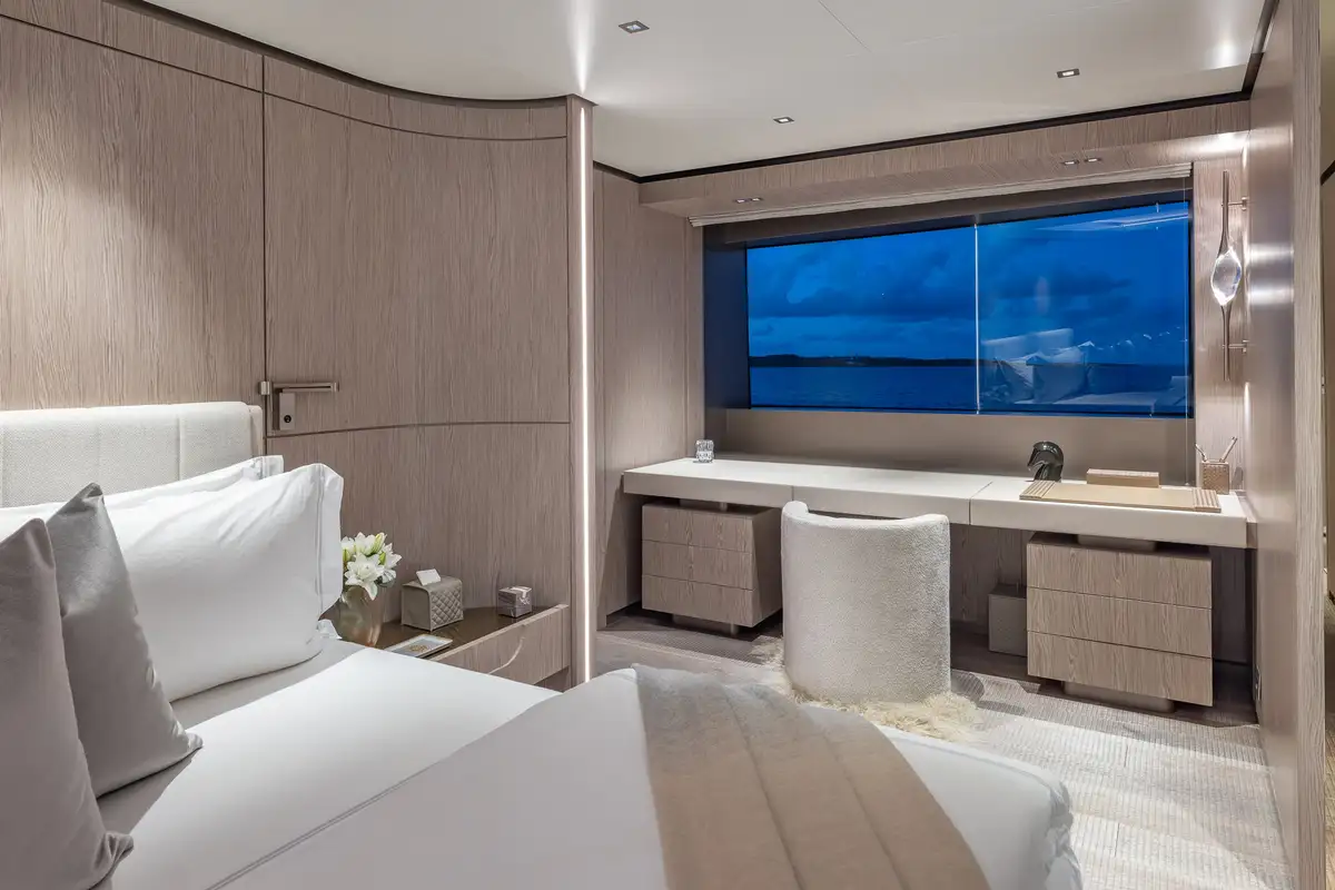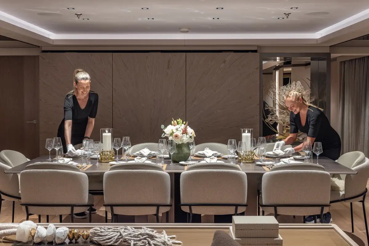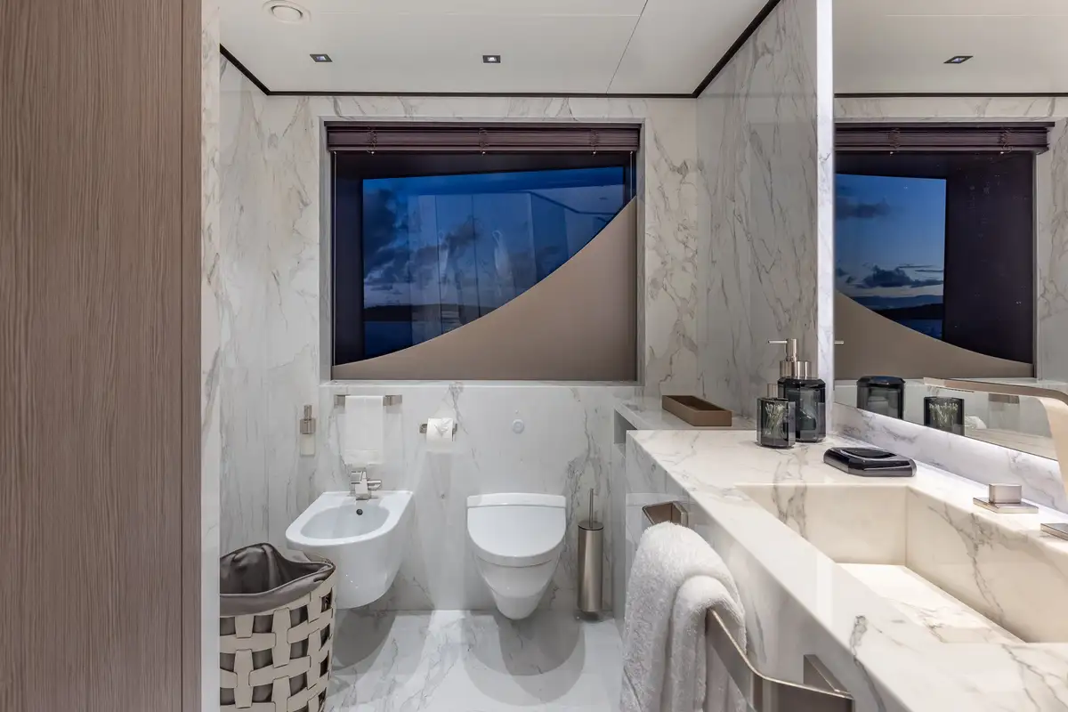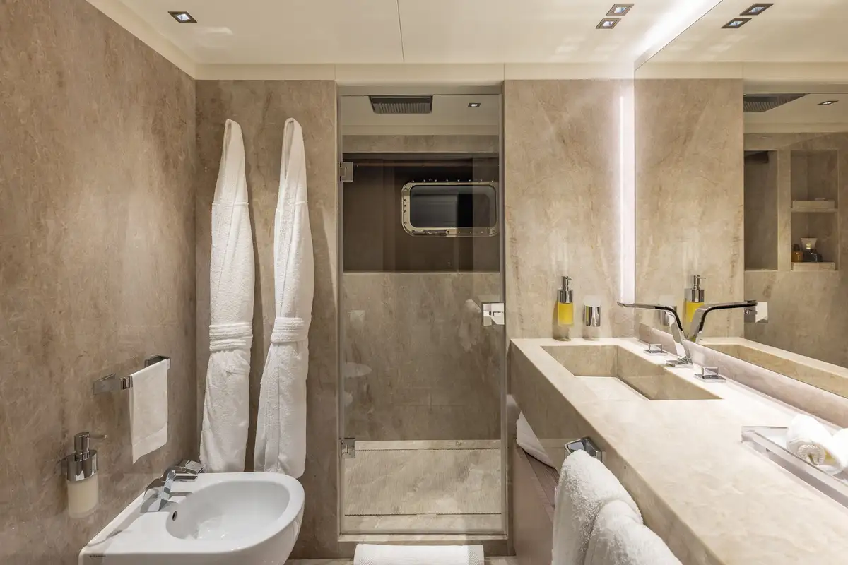 Accommodation for up to 12 guests is beautifully designed. The main deck master suite commands sweeping views from a central king bed, with its own lounge, dressing room, and a marble bathroom that feels like a spa retreat. Below, two double and two twin cabins with pullmans – each with en suite – ensure every guest feels equally indulged.