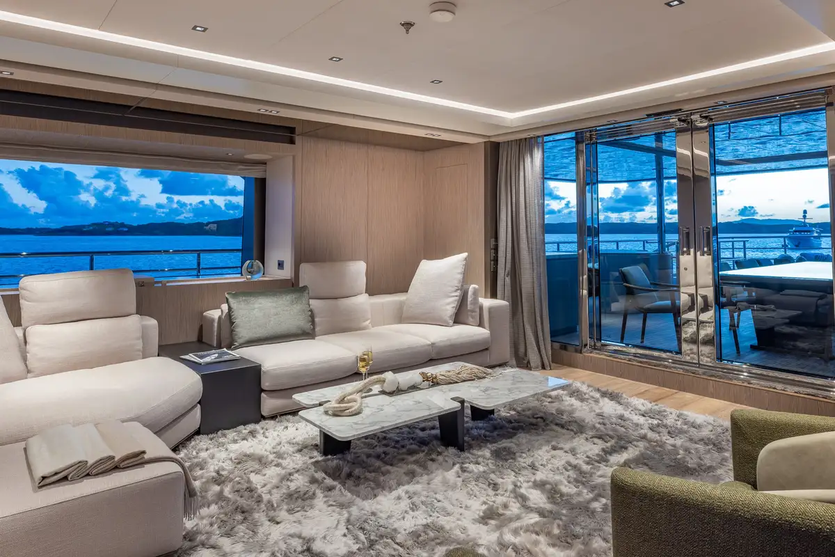 Inside, GIOIA’s interiors are warm and inviting. Light-filled and welcoming, they pair polished marbles and rich woods with a soft, contemporary touch. The main deck lounge invites sociable moments with its bar and seating areas, while the sky lounge one deck up is a snug but spacious living room with panoramic views and an easy flow out onto the upper aft deck.