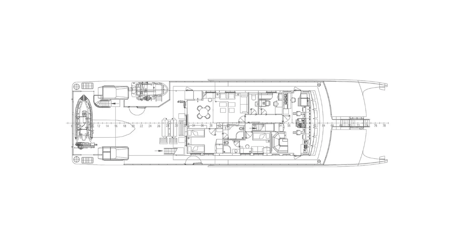 The interior offers light, functional and relaxed furnishings that feature beautiful woodwork and an intelligent layout for maximising space. The master cabin is situated on the upper deck, consisting of a double en suite and a large adjoining private lounge or study. The remaining six guest cabins on the main deck are practically identical, apart from subtle differences in colour scheme. A total of 12 guests are accommodated.