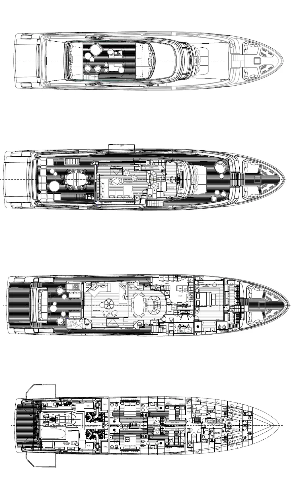 • Spacious swim platform for a yacht of her size, with drop down platforms creating a 19sqm walk-around space