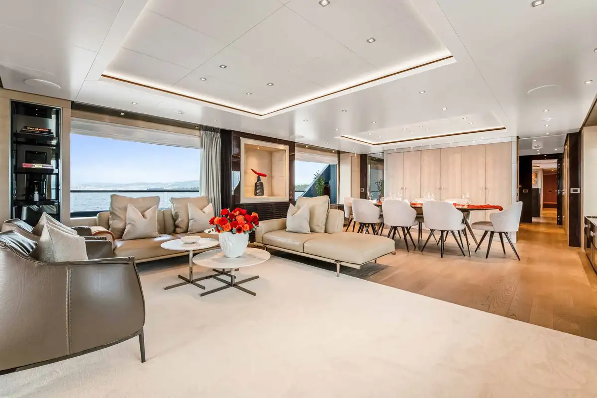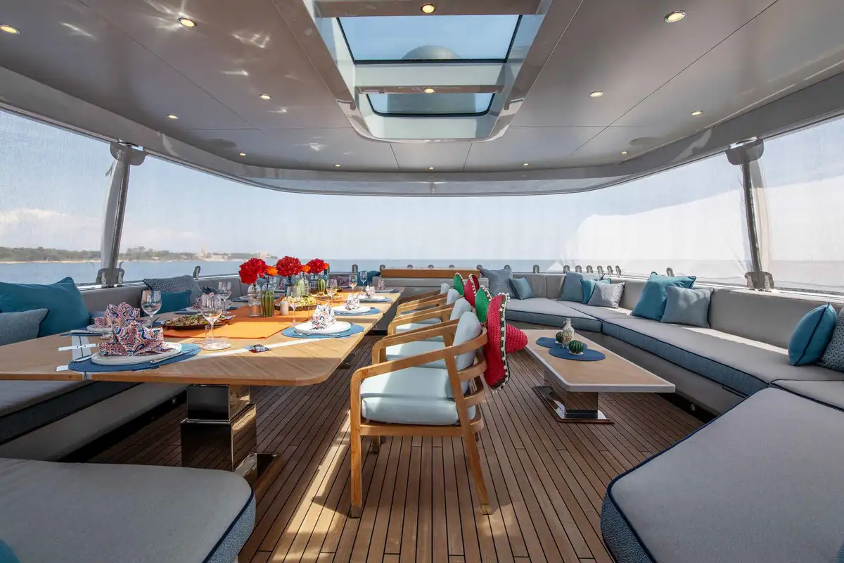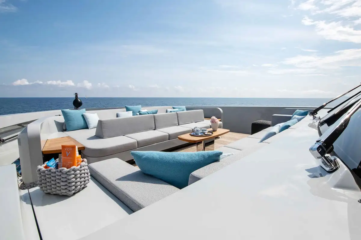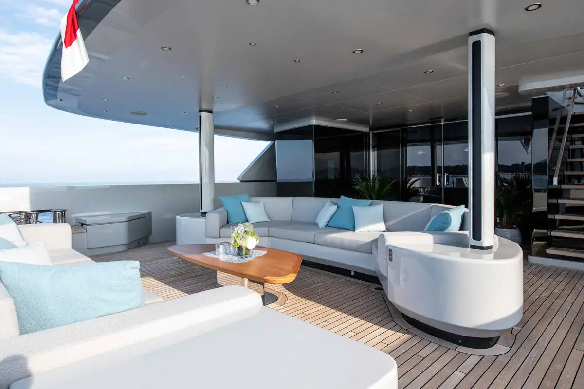 The upper deck sky lounge is perfect for casual gatherings and quiet downtime. It provides an opportunity to relax in style, featuring sumptuous ivory leather seating, a games table, and a round dining table for six. To the rear, you’ll find an al fresco dining space and a sun lounging area, creating a seamless flow between indoor and outdoor living.