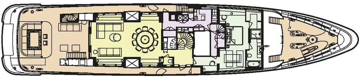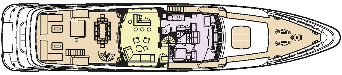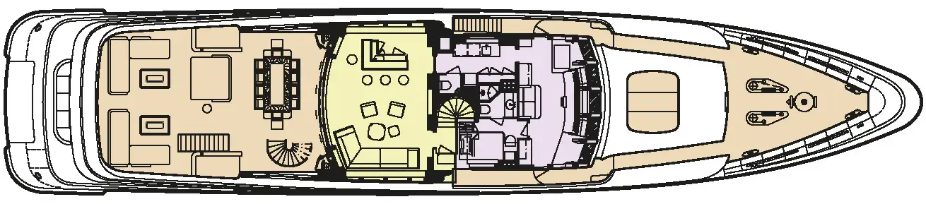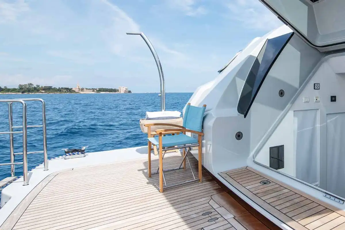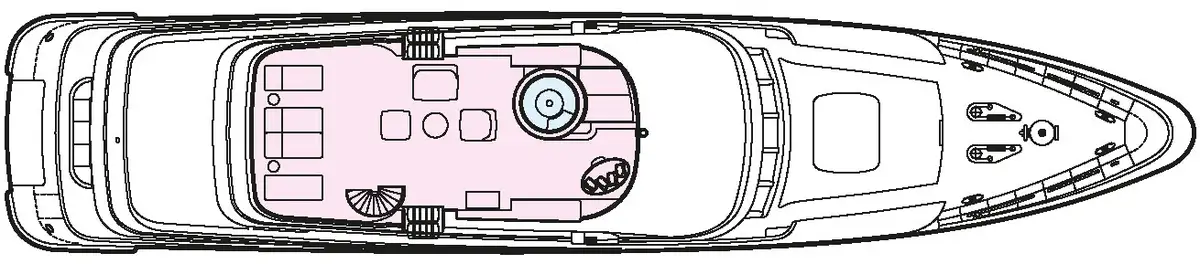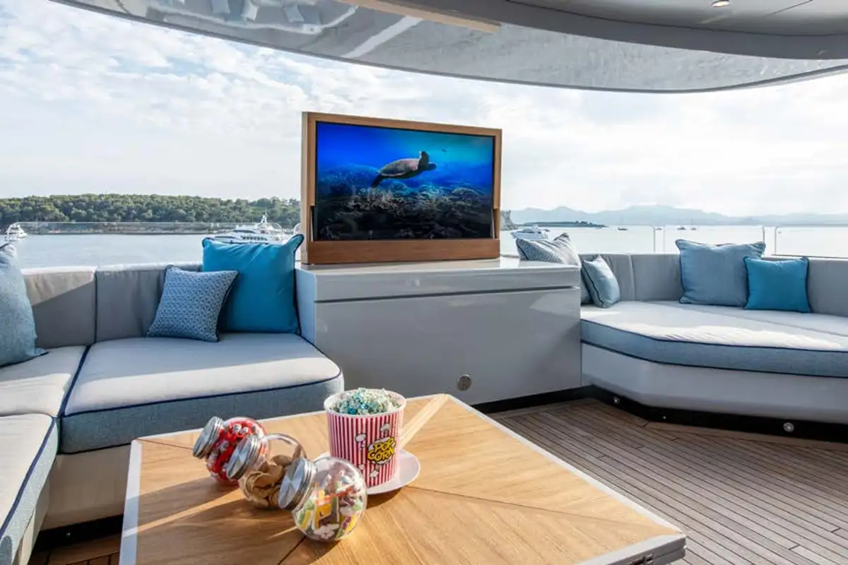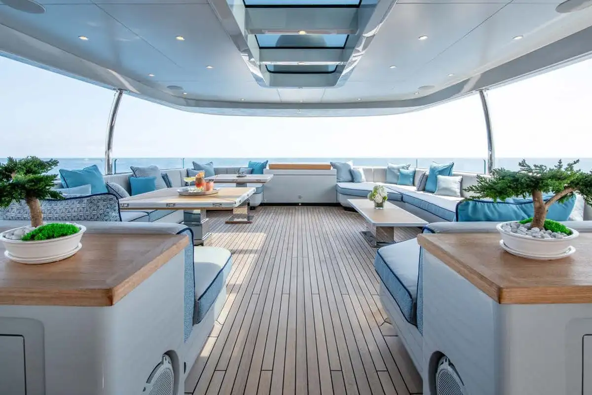 The upper deck sky lounge is perfect for casual gatherings and quiet downtime. It provides an opportunity to relax in style, featuring sumptuous ivory leather seating, a games table, and a round dining table for six. To the rear, you’ll find an al fresco dining space and a sun lounging area, creating a seamless flow between indoor and outdoor living.