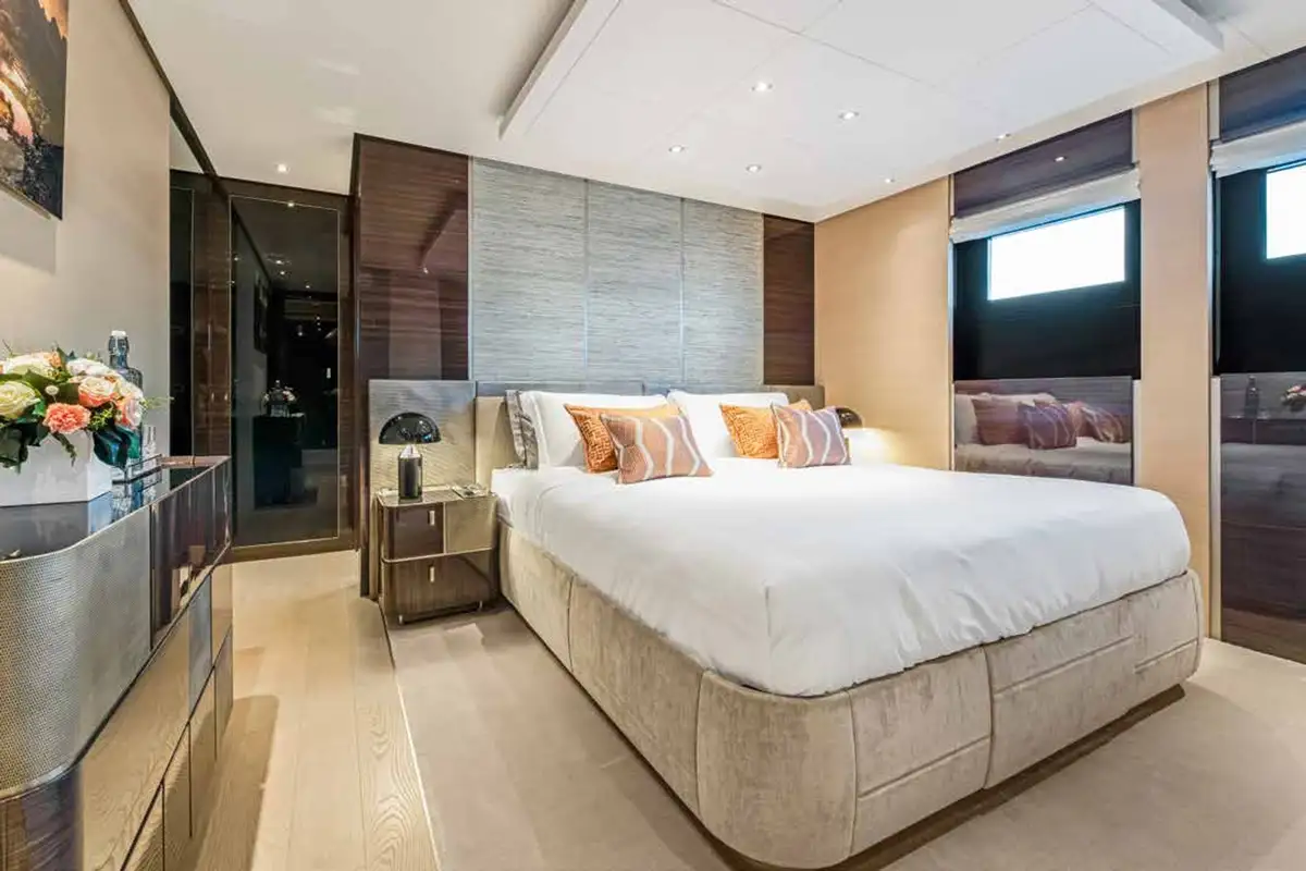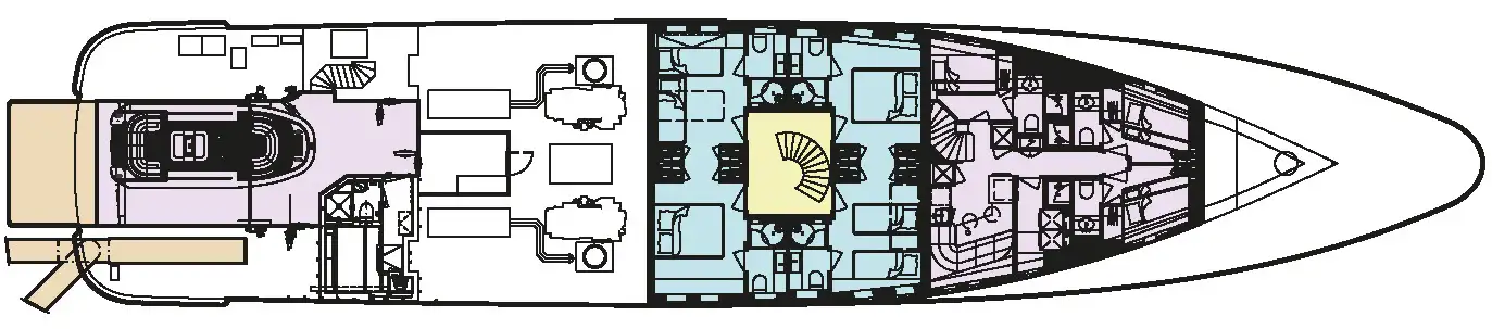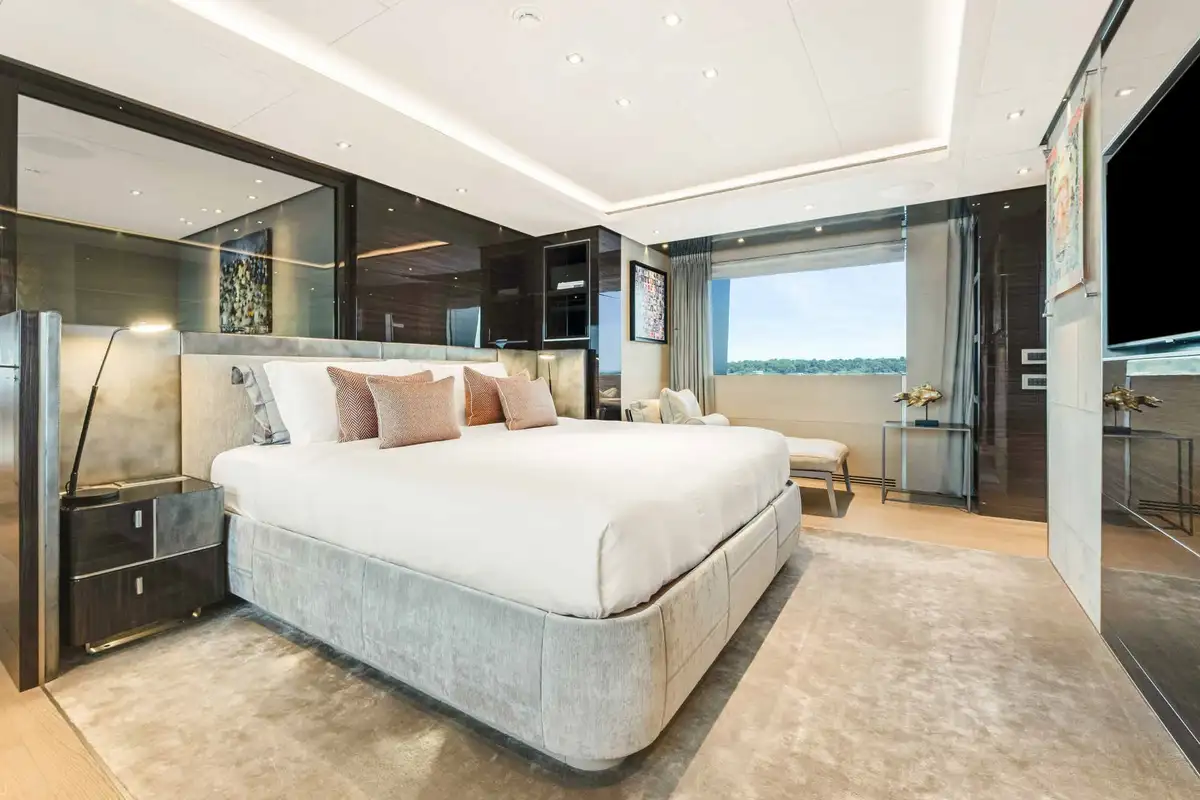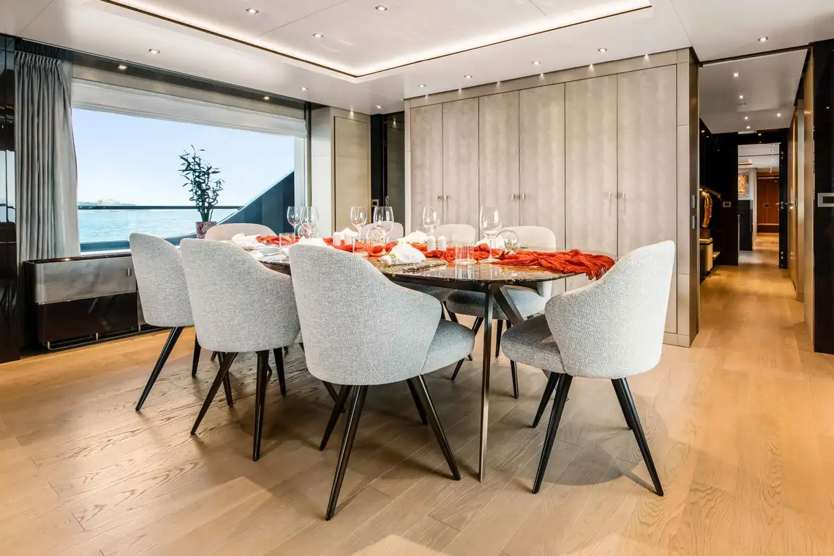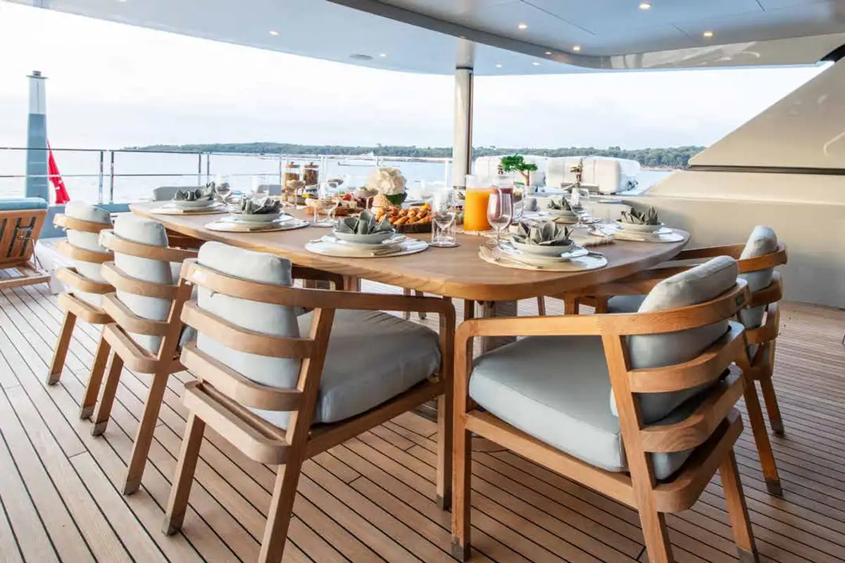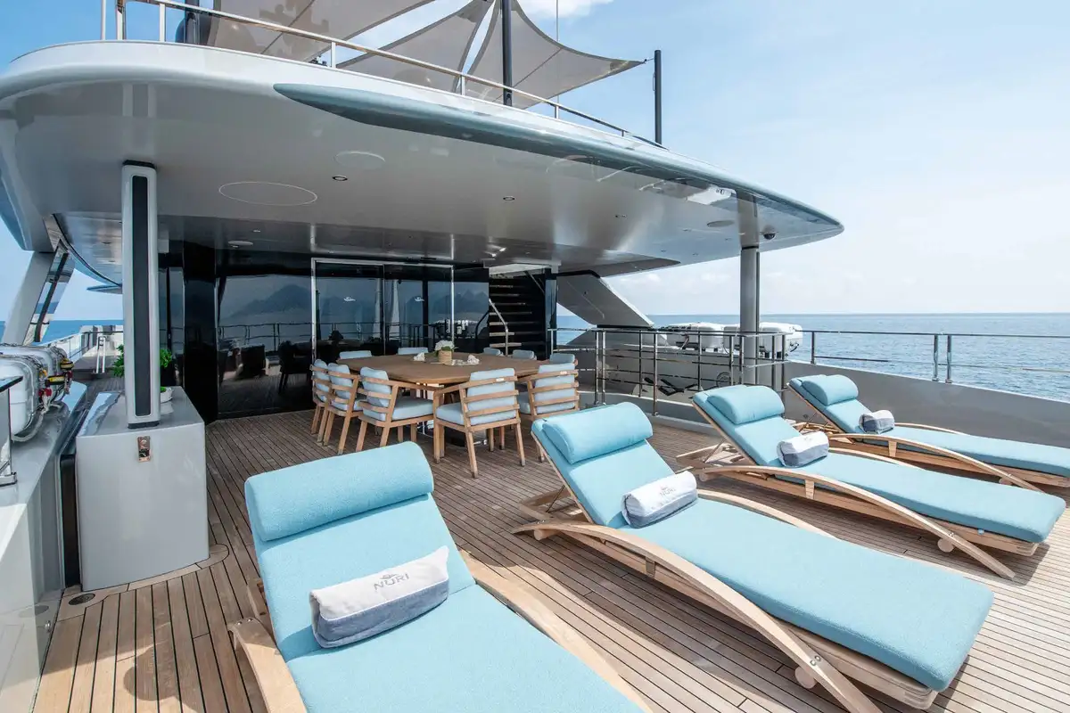 Her exterior spaces are outstanding. On the foredeck, you will find an inviting al fresco lounge area with seating ideal for soaking in the views by day and enjoying starlit skies by night. Whether you’re unwinding with a book, sipping cocktails, or simply taking in the views, this space offers a tranquil retreat. The sun deck is the best of NURI’s outdoor areas, featuring a raised jacuzzi, a beautiful al fresco formal dining area, a wet bar, and exercise equipment; it’s the perfect spot for relaxing and socialising.