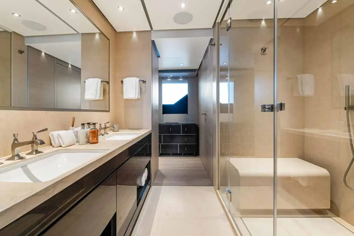 NURI’s main deck master suite offers absolute privacy and luxurious comfort. Accessed via a private office, it is a true sanctuary with a king-sized berth, a dedicated office space, and an en suite bathroom. On the lower deck, four en suite guest cabins offer a variety of sleeping arrangements to suit your guests, including two VIP double suites, and two convertible twin/double suites, both of which contain a pullman berth. Each suite ensures all guests feel at home during their time on board.