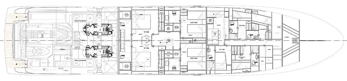下层甲板设有两间 VIP 套房及两间双人套房,均配备独立卫浴,为您与亲友提供舒适而私密的休憩空间。内饰采用美洲胡桃木与主甲板拼花地板,搭配浅色地毯,营造出低调雅致、温馨宜人的氛围。
