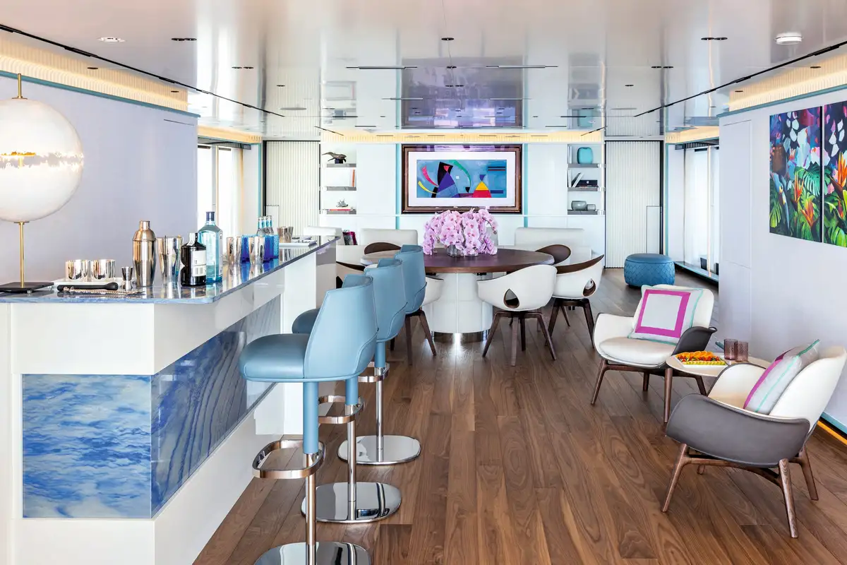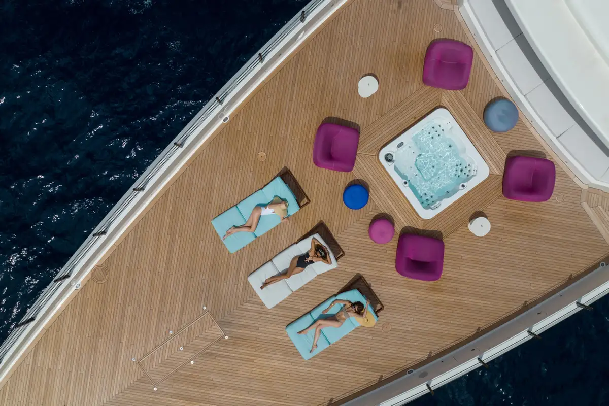 From the beach club to the sun deck, RIO’s outdoor areas are made for indulgence. A jacuzzi-forward bow lounge on the foredeck offers panoramic views and a tranquil escape, while the sun deck’s deep pool, sunbeds and marble-topped bar offer the perfect setting for sun-soaked days. Al fresco dining aft of the upper deck invites long lunches and golden-hour cocktails, surrounded by expansive sea views.