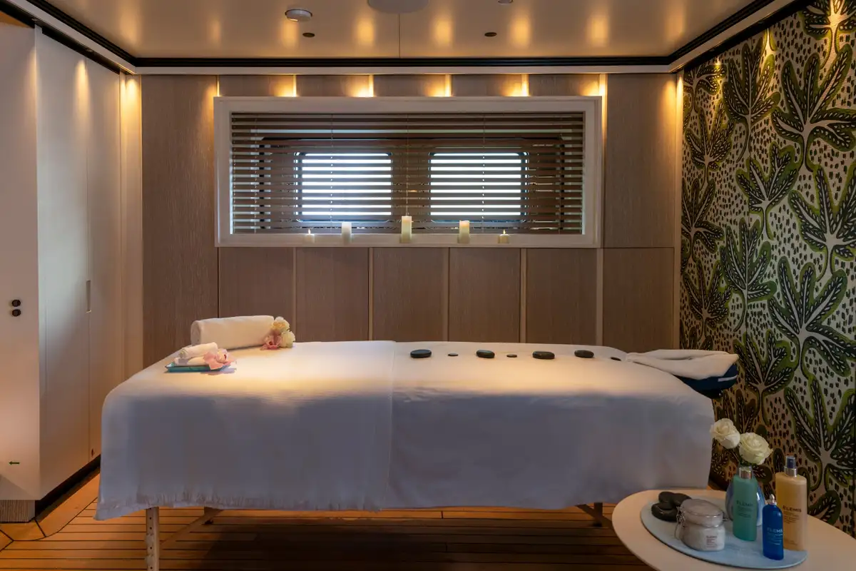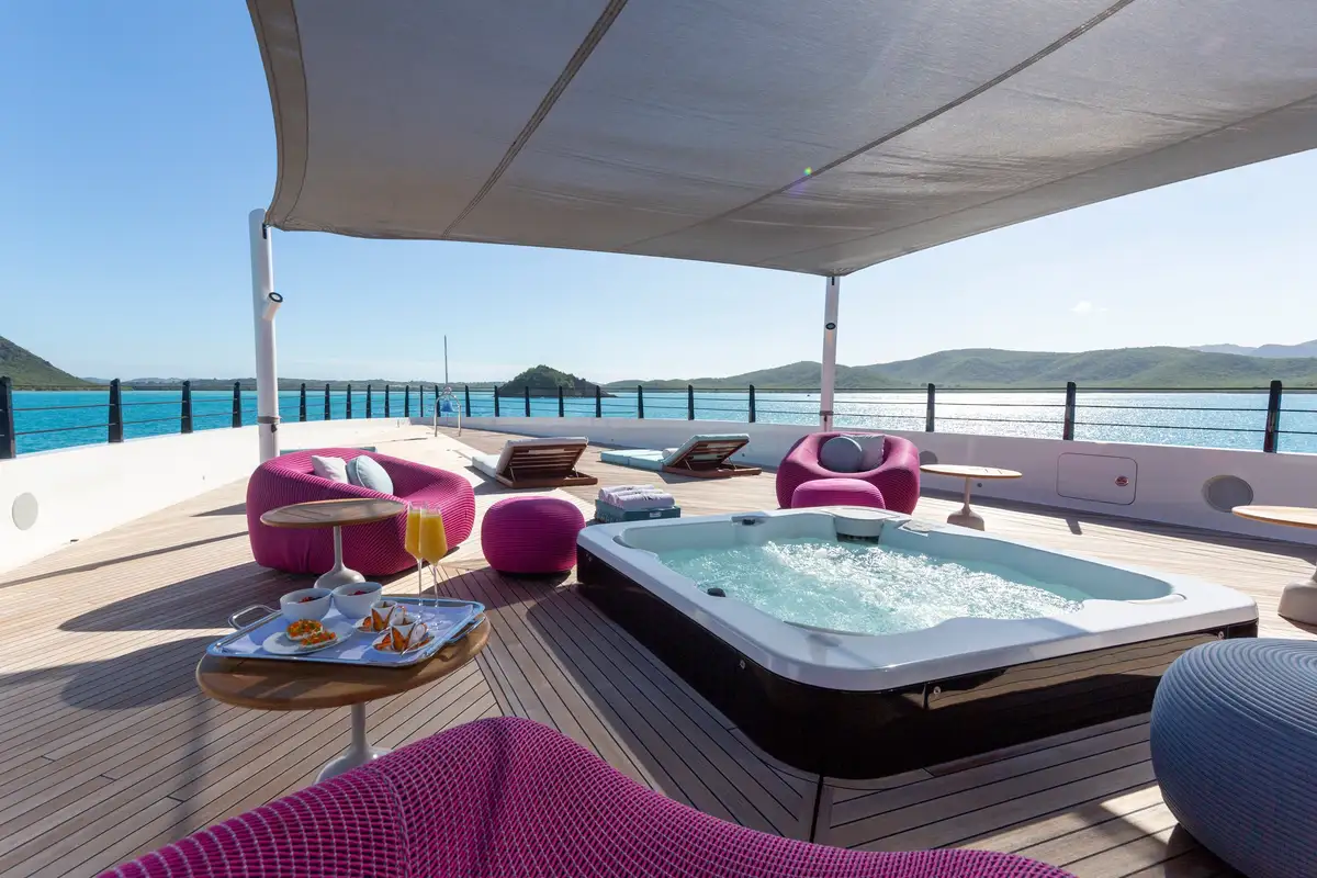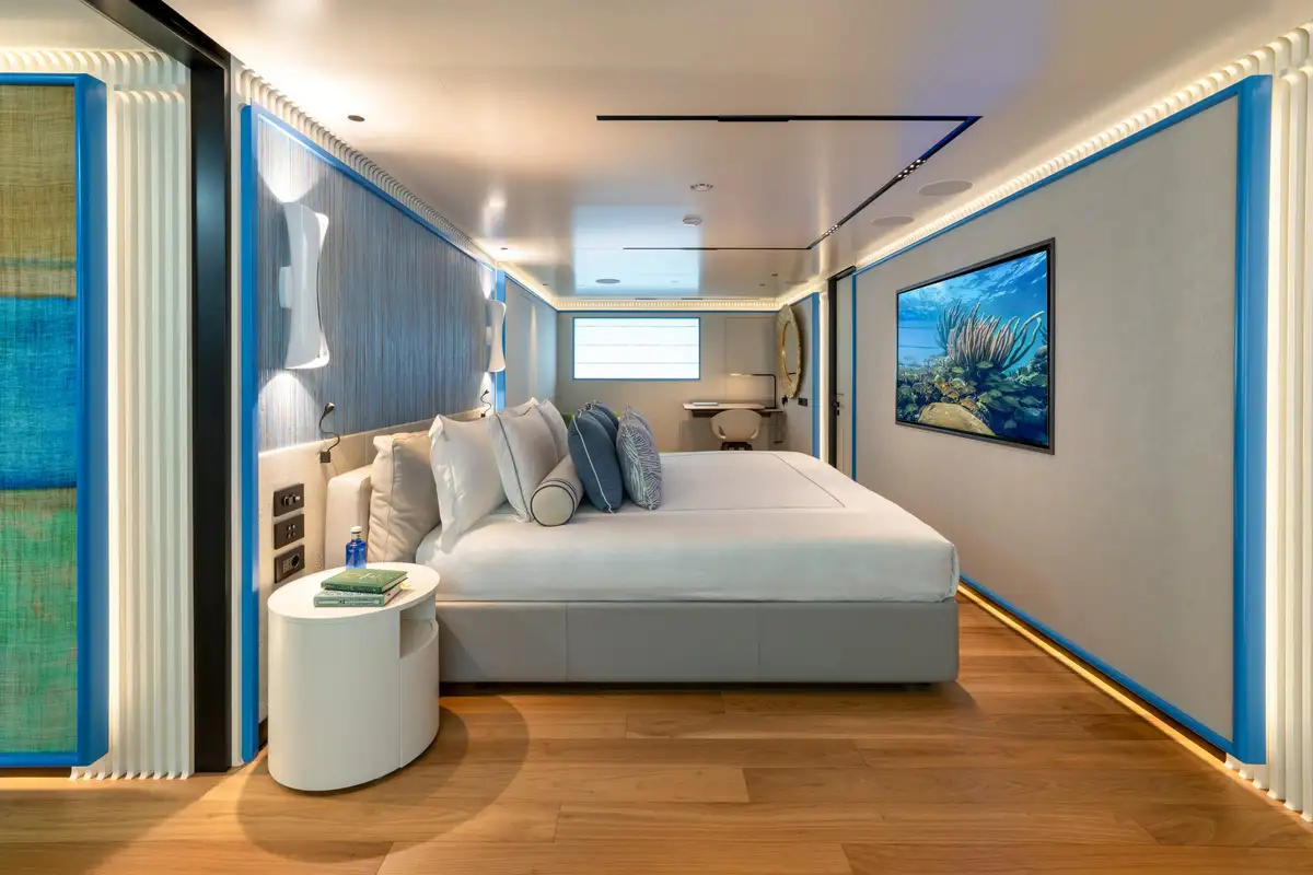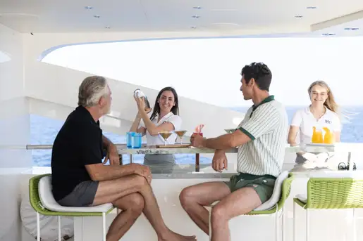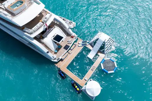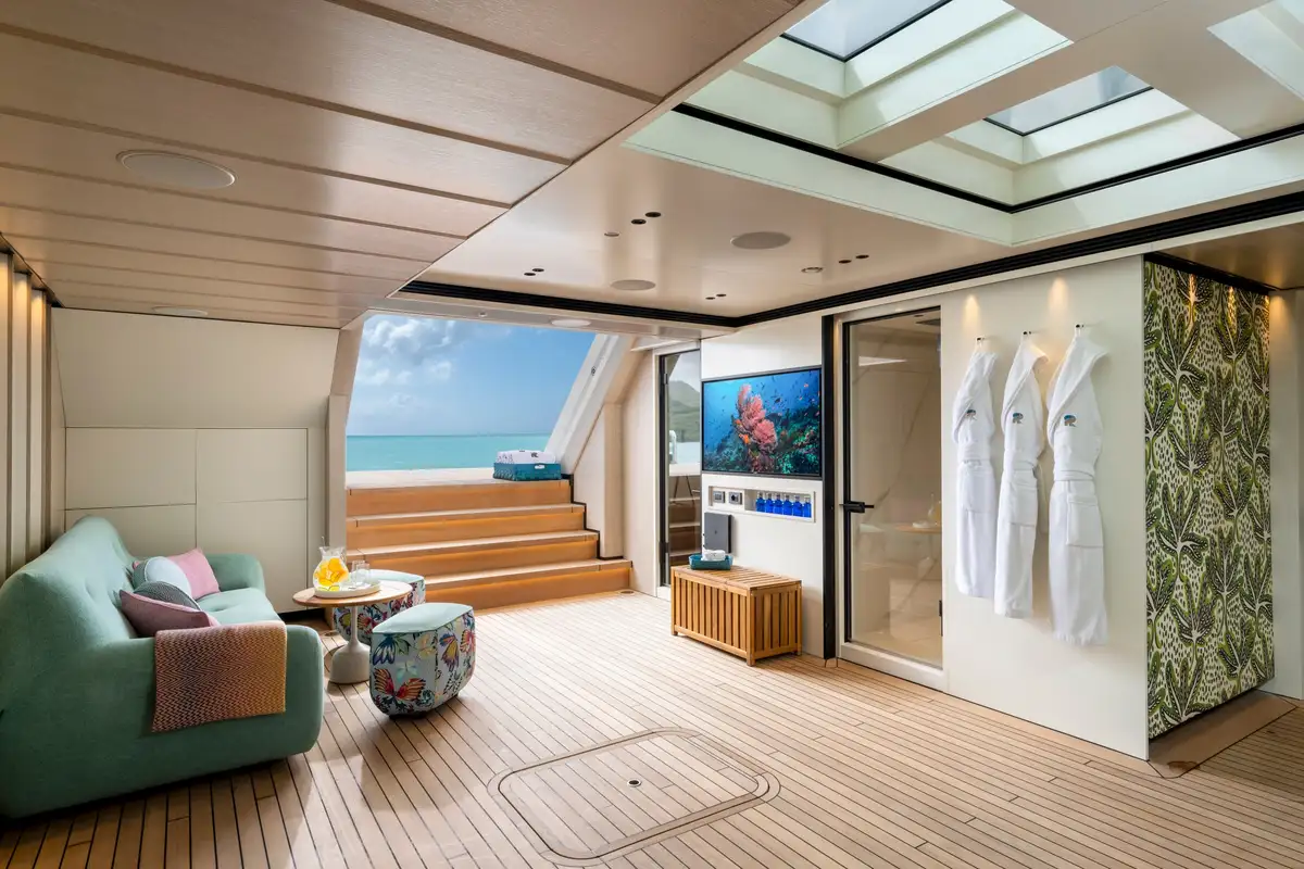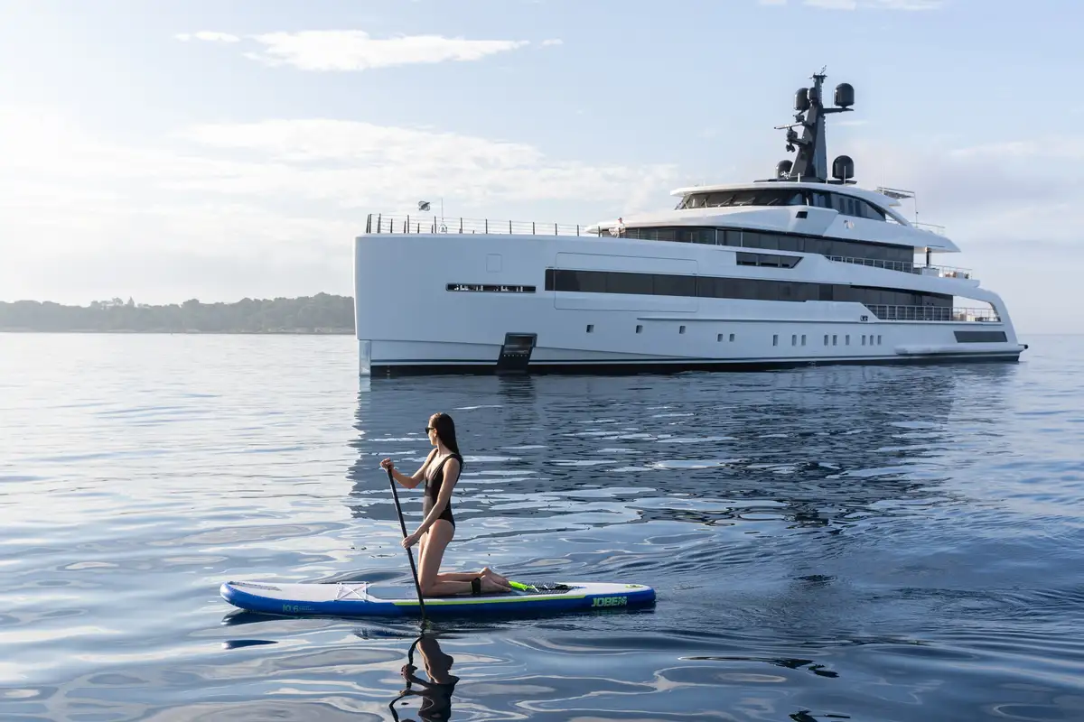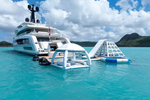 Activity and exploration are at the heart of RIO’s charter experience. Her extensive toy garage includes SeaBobs, jetskis, inflatable water parks, scuba equipment for certified divers, and an array of kayaks, paddleboards, and eScooters. A full beach set-up, which comes loads with a gazebo, BBQ and Starlink internet, brings the five-star experience ashore.