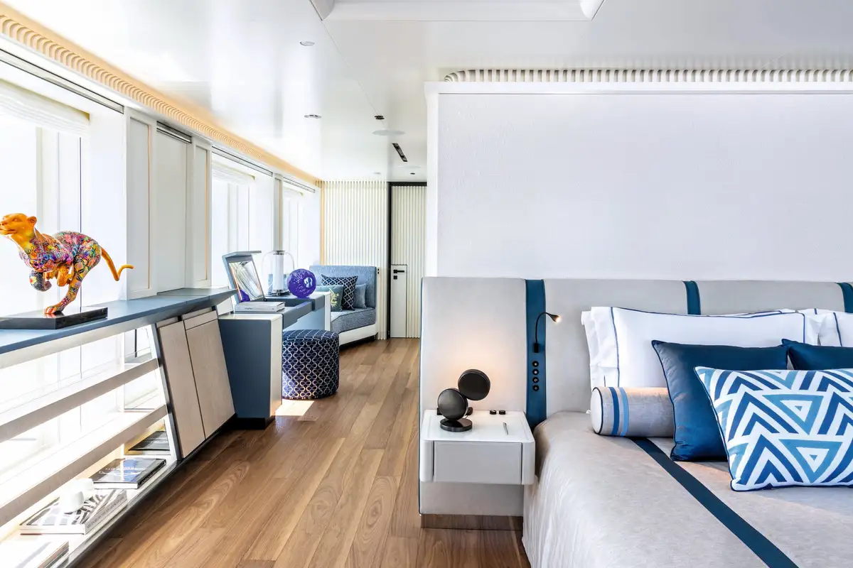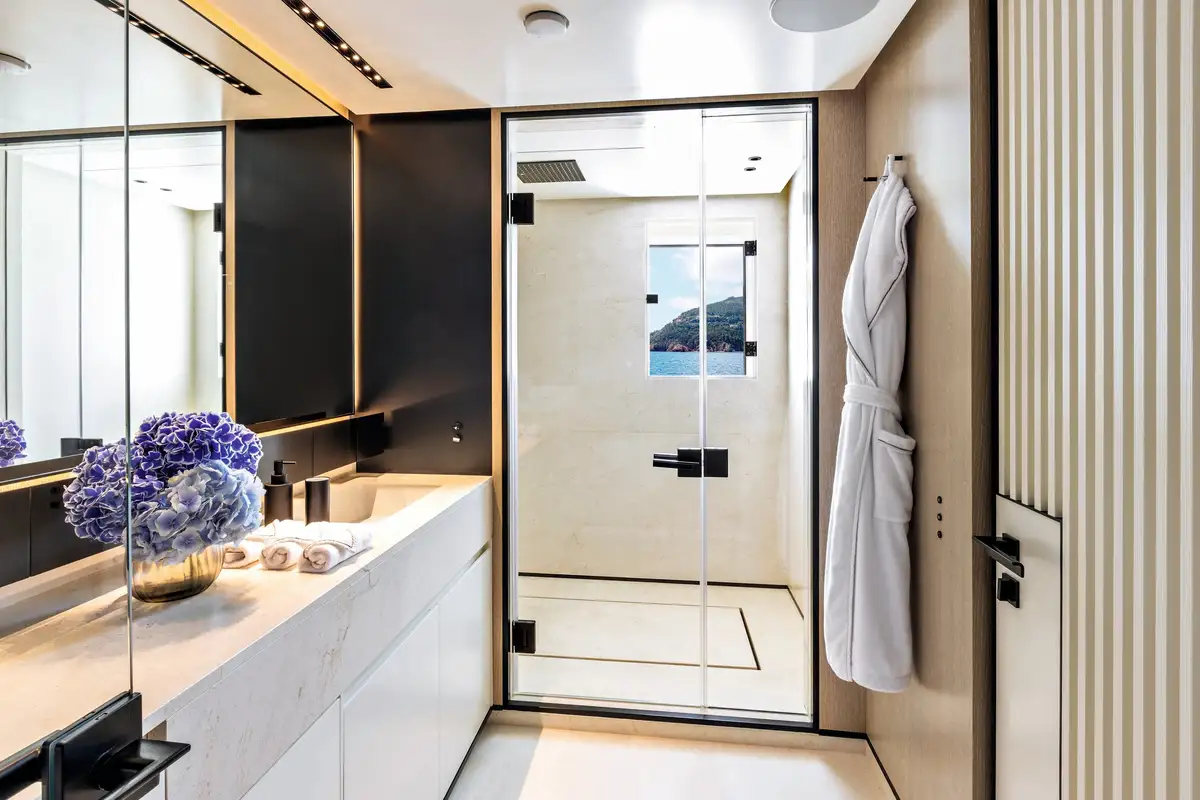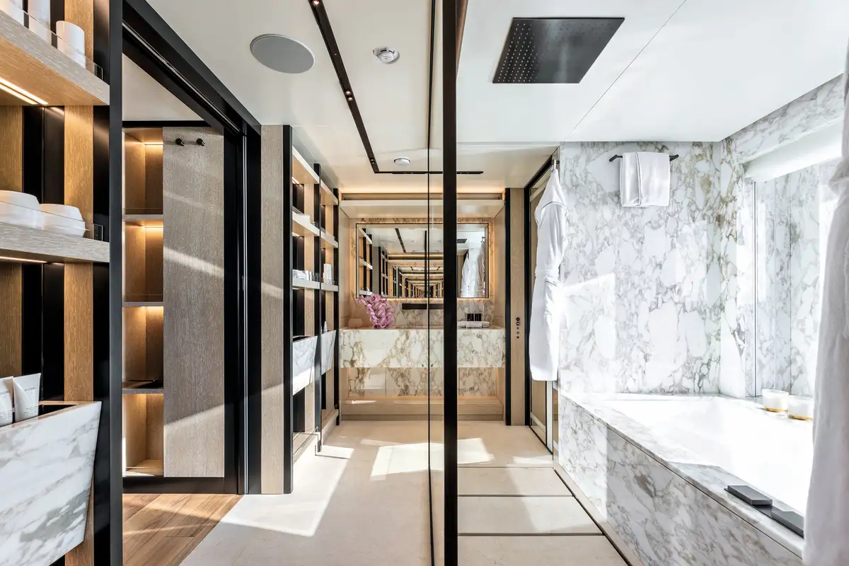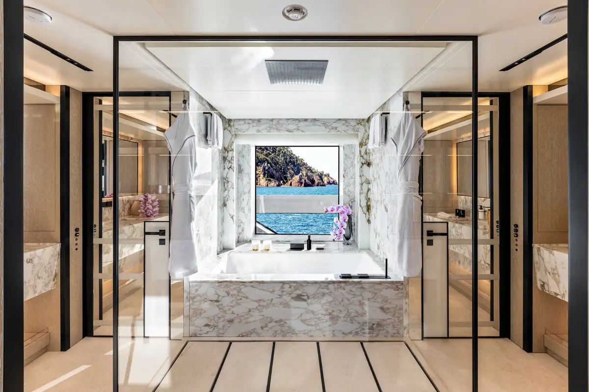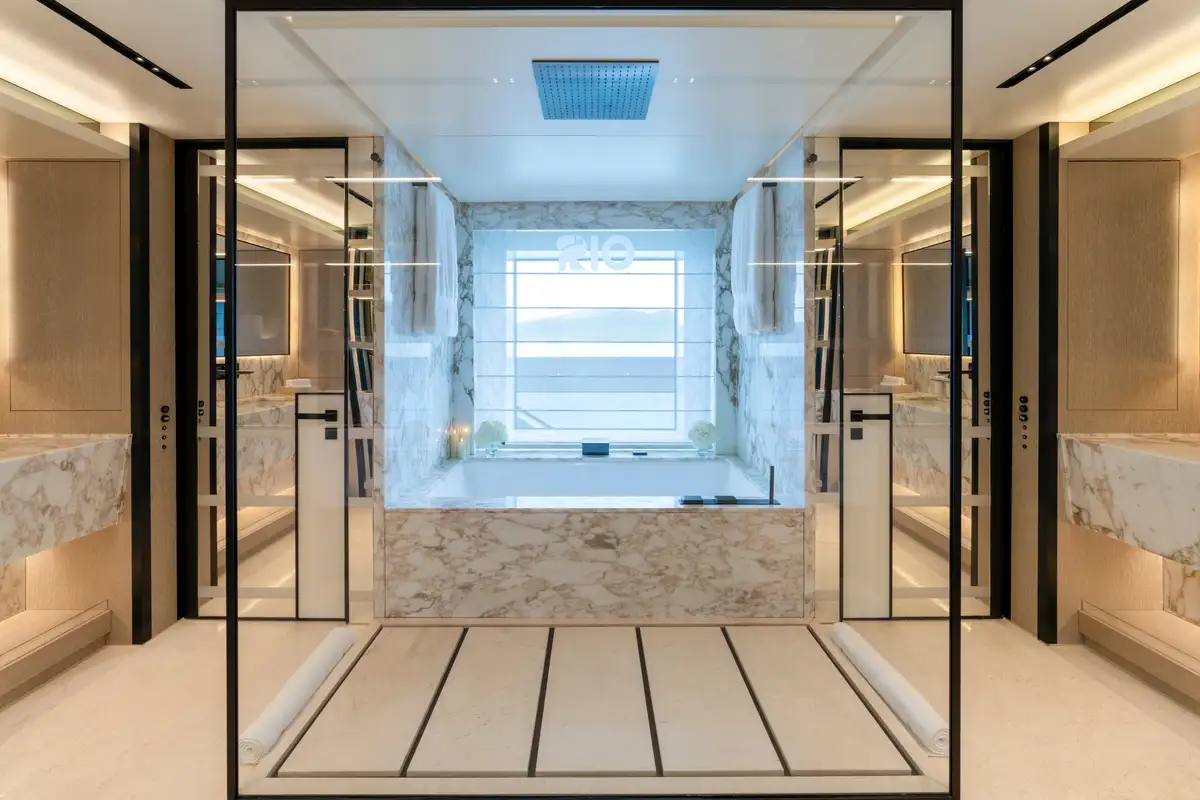 Wake in the serene privacy of the owner’s suite, where floor-to-ceiling windows frame an endless horizon. A morning on RIO might begin with a swim directly from the beach club, a session in the well-equipped gym, or a moment of calm in the hammam. With a vast selection of the latest water toys and tenders, every day invites adventure, whether in the calm Mediterranean or vibrant Caribbean waters.