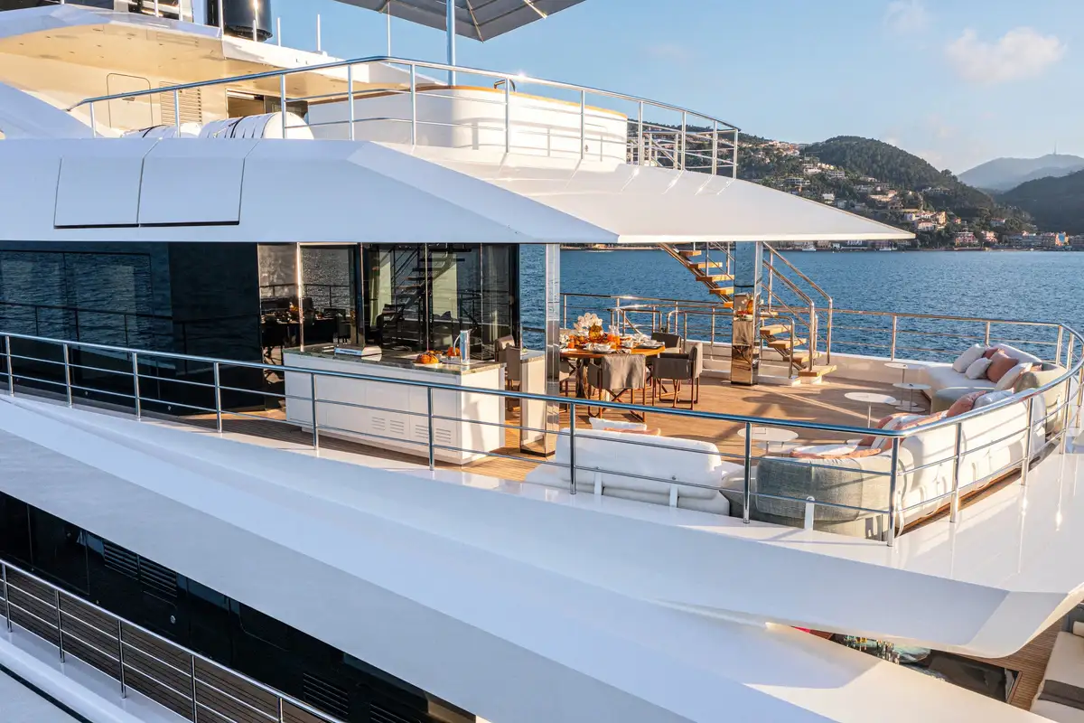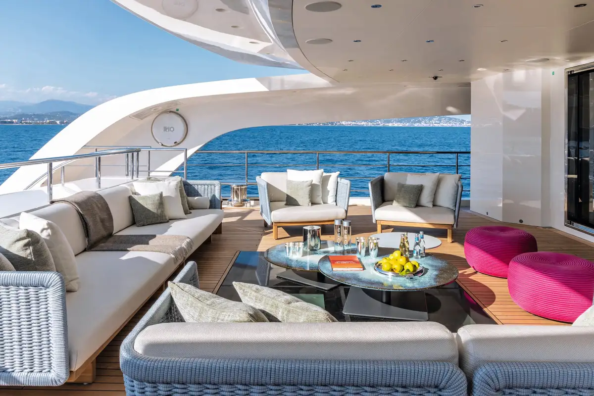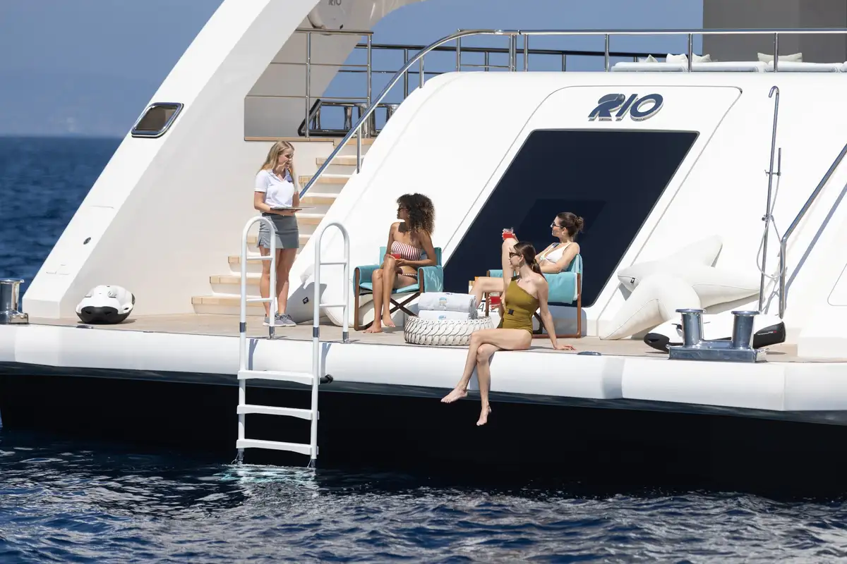Dinner is served on the main deck aft, an occasion of refined cuisine and expert service beneath the stars. With her youthful, dynamic crew, versatile layout and award-winning design, RIO is a superyacht built for both fun and finesse. Whether for a celebratory charter or a multi-generational escape, she offers a truly unforgettable yachting experience.
