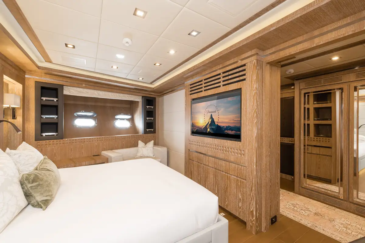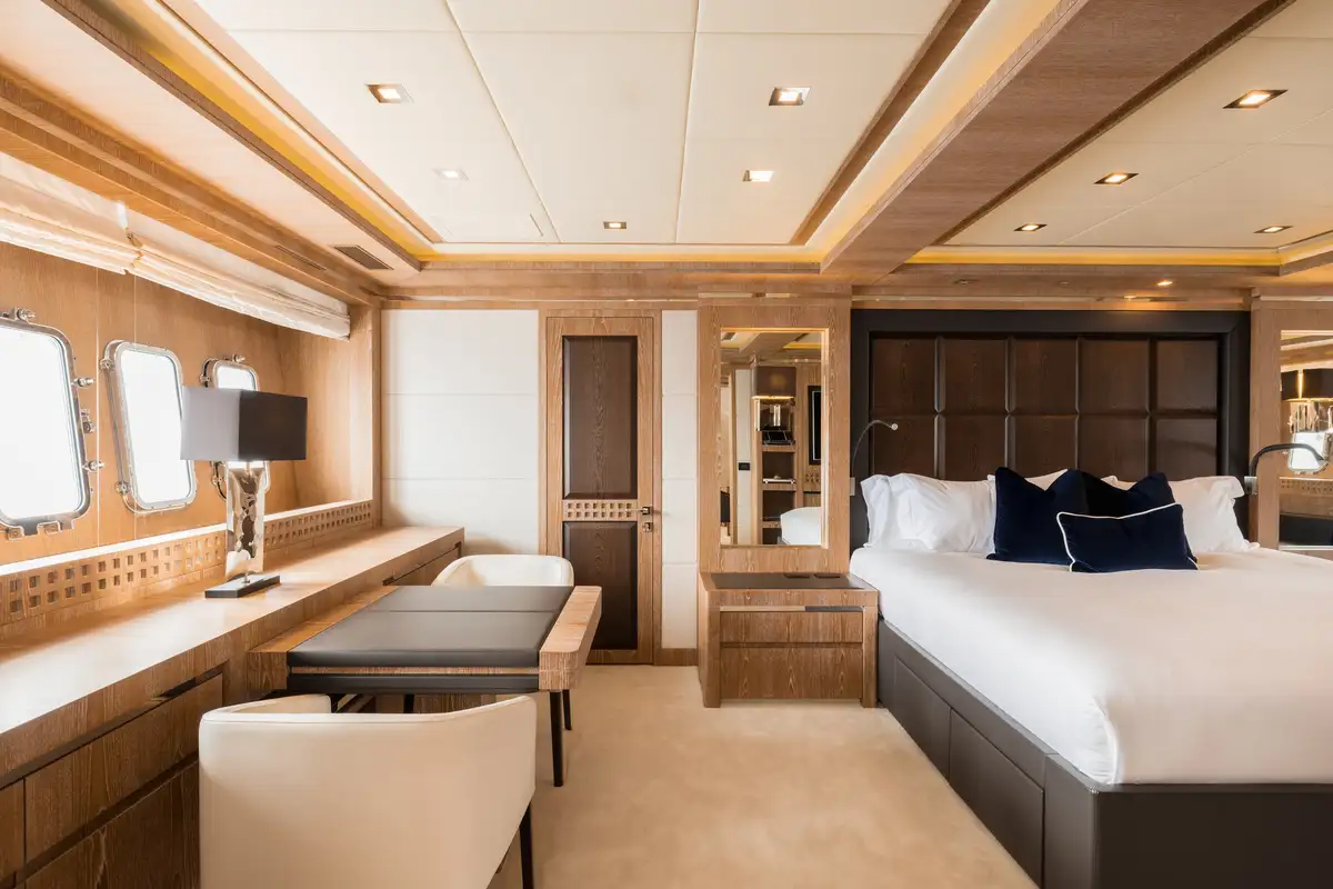 ROYALE X has a bright, modern interior by Valentina Balducci with beautiful bleached-teak wood floors and limed-oak panelling throughout creating a light, airy vibe.