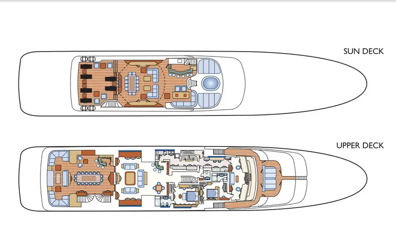 Step out onto one of the three aft decks where the Art Deco style continues, but in a tropical variant. With lots of settees and a variety of al fresco dining possibilities, you could spend each day in a different area. Start your day with a workout in the air-conditioned gym on the main deck, or a yoga session on the foredeck. The crew includes a masseuse so you can soothe away all the tensions of modern life.