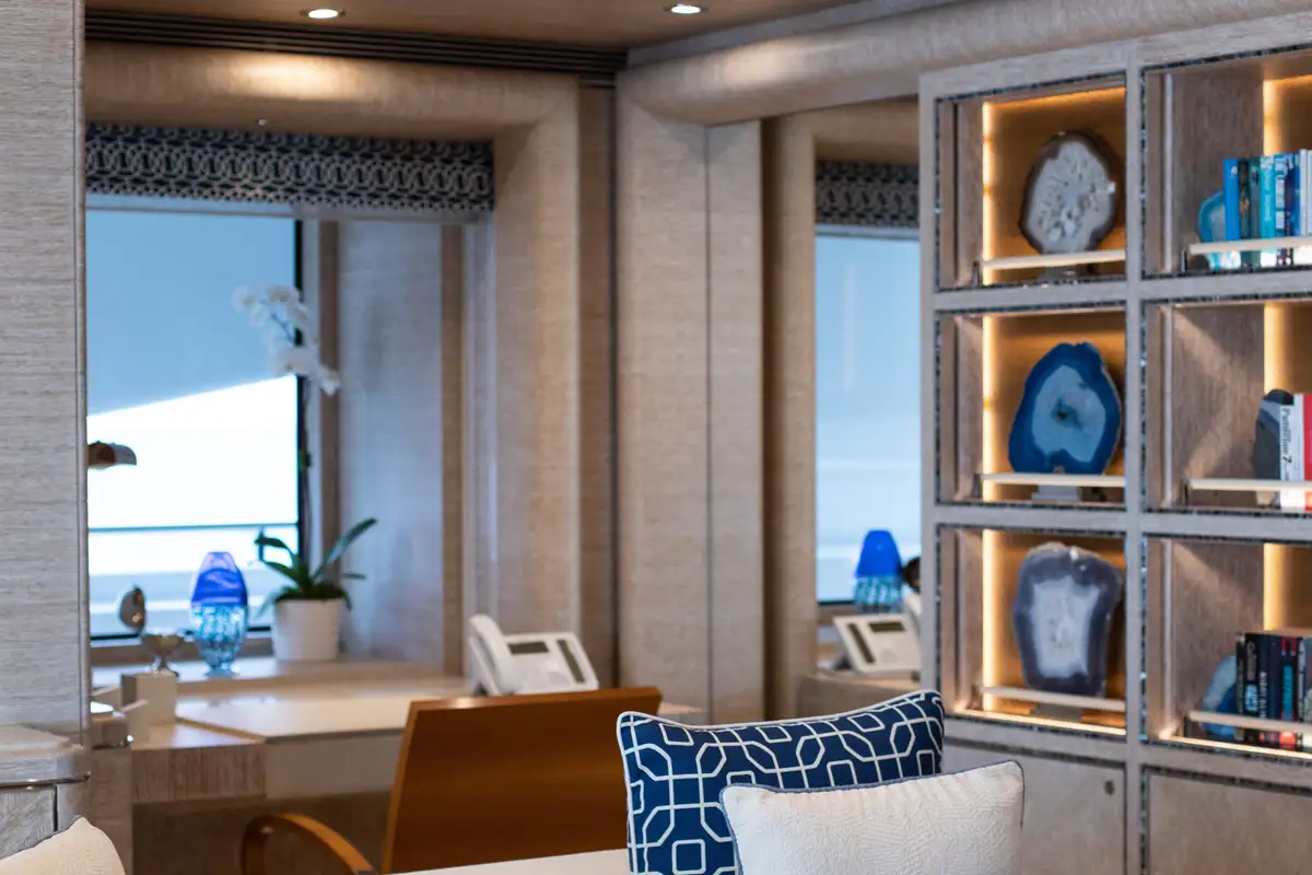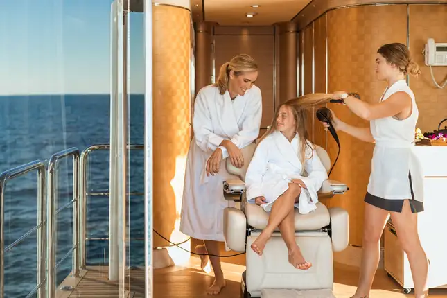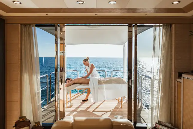 STARBURST IV prioritizes wellness with a fully equipped upper deck gym and a main deck beauty salon and massage suite, complete with a fold-down balcony for indulgent sea-side treatments. Designed for inclusivity, she offers wheelchair-friendly accessibility, with an elevator servicing lower to owner’s decks and step-free access throughout, ensuring a memorable experience for all guests.