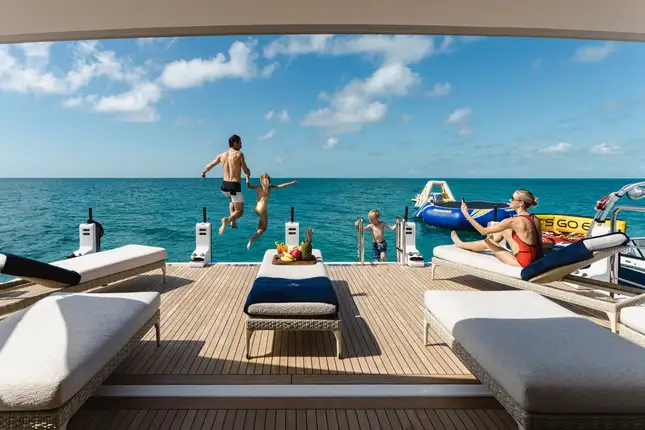 The huge swim platform is even big enough for sea level dining, which gives you a second open-air option to the sun deck dining table.